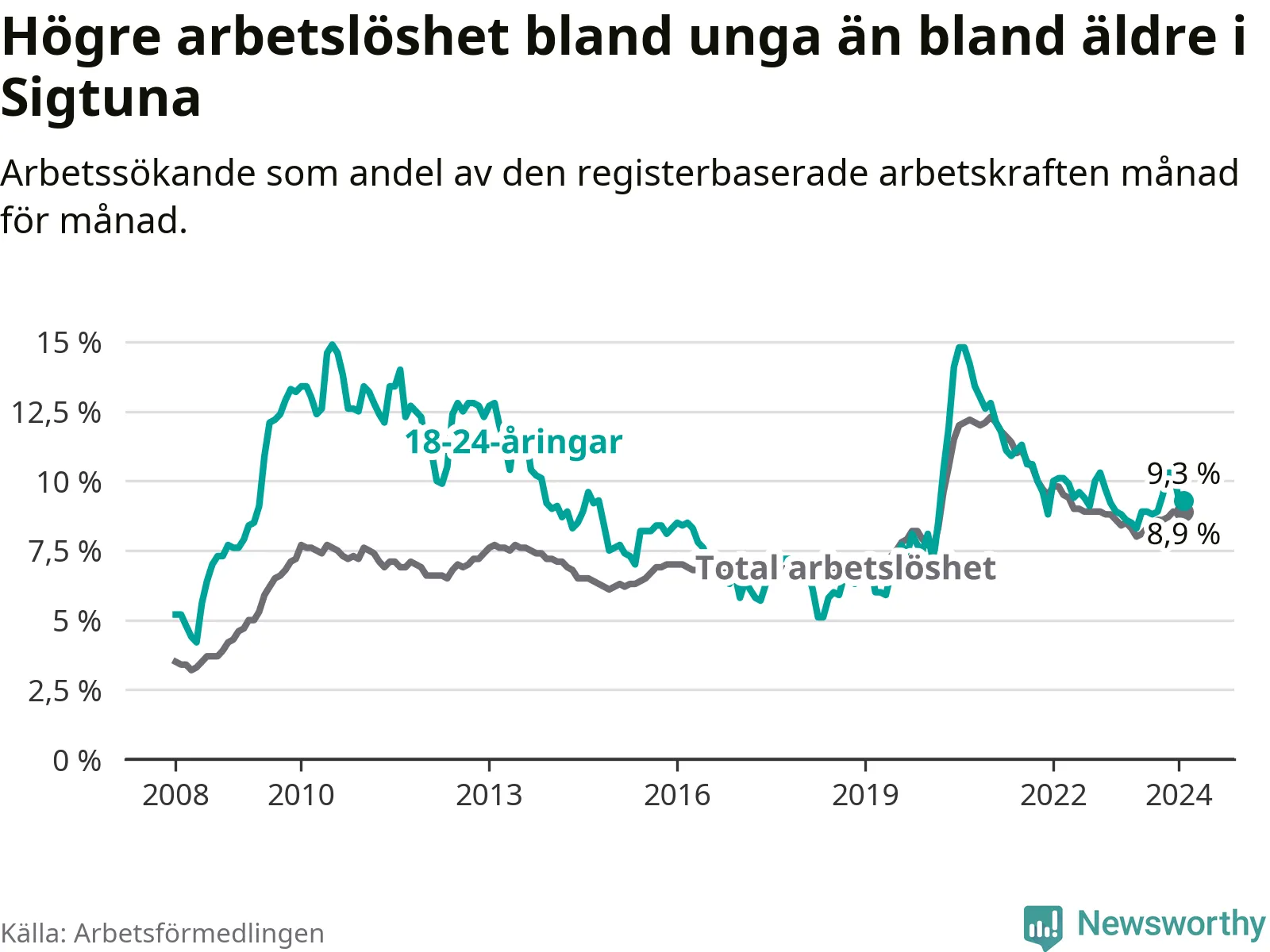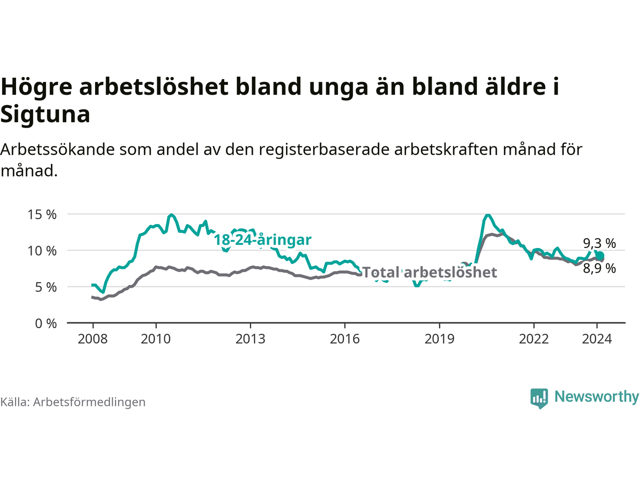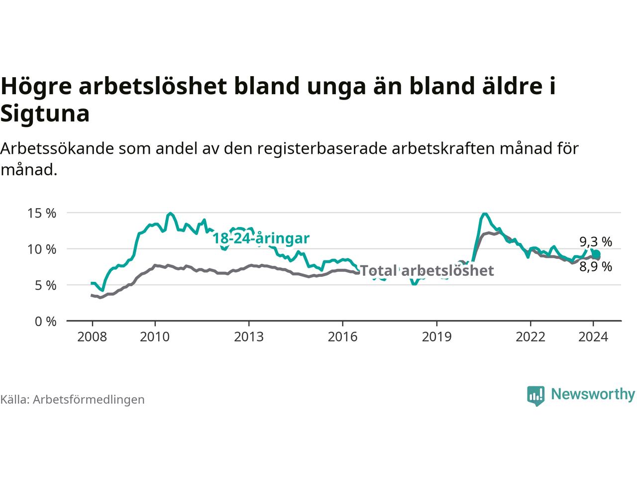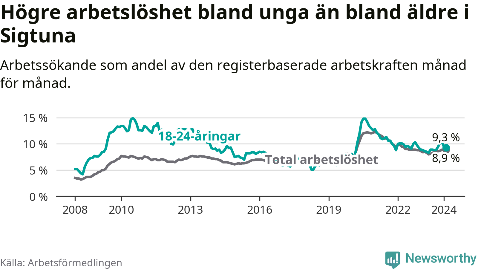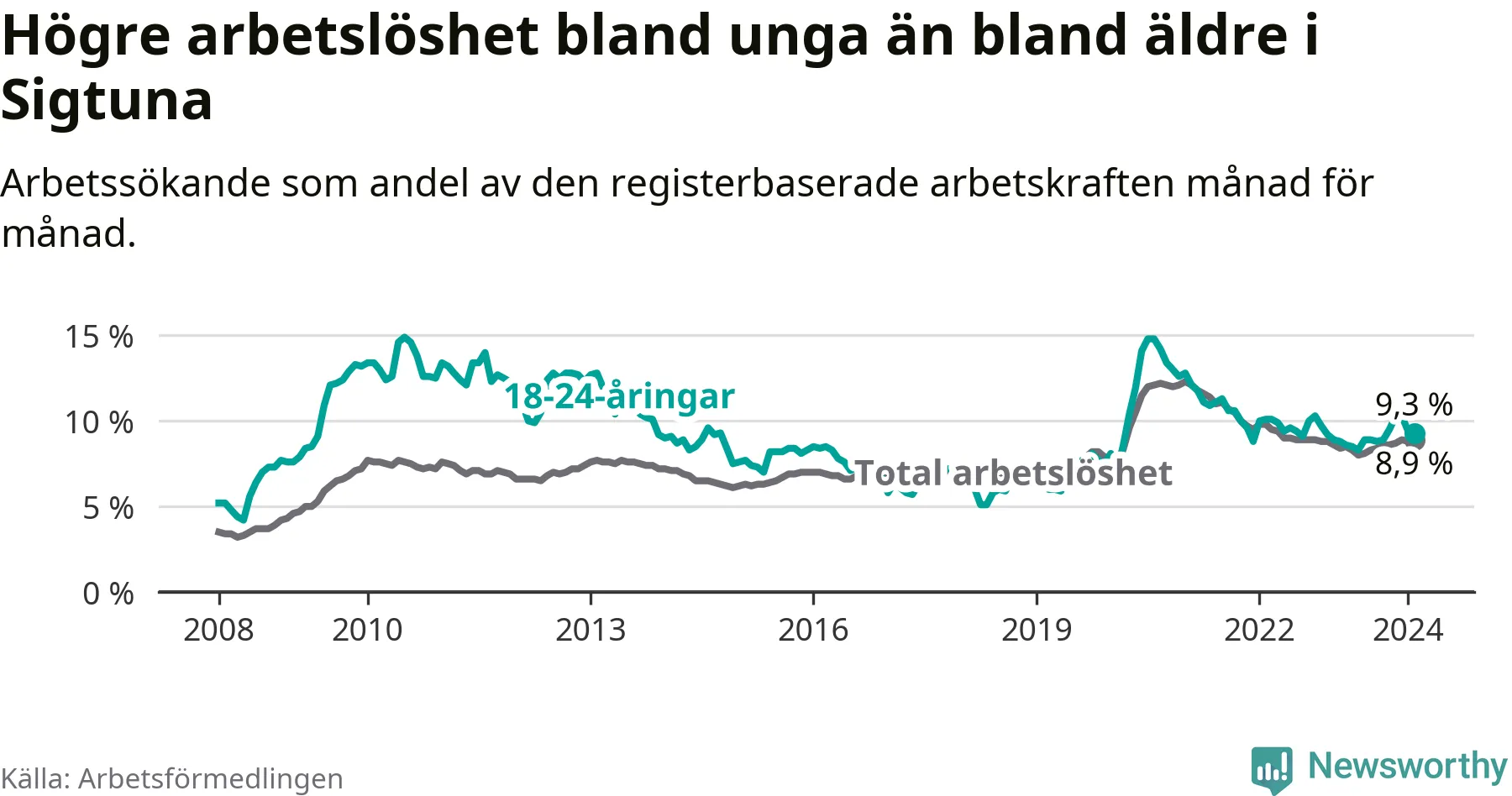 Precis som den totala arbetslösheten ligger ungdomsarbetslösheten i Sigtuna högre än i Stockholms län som helhet. Skillnaden mellan kommunen och länet är 2,5 procentenheter.