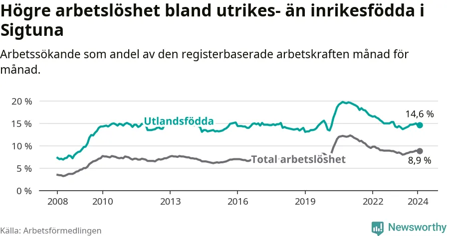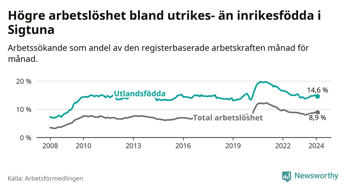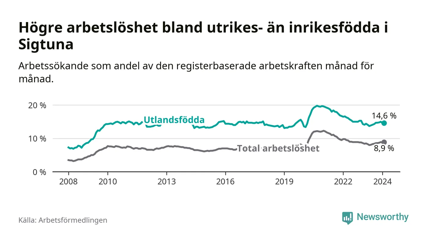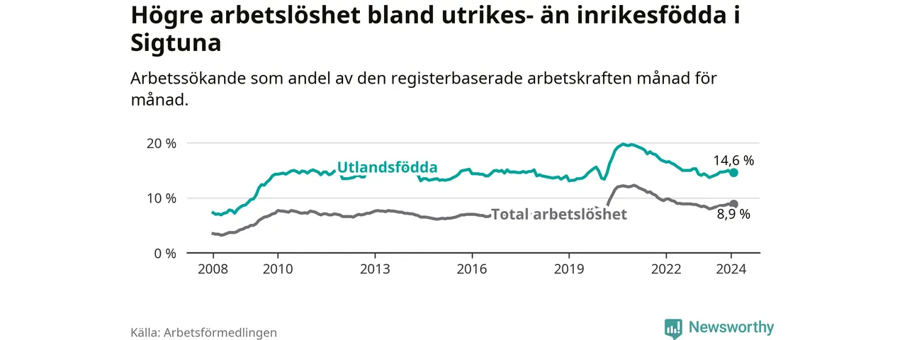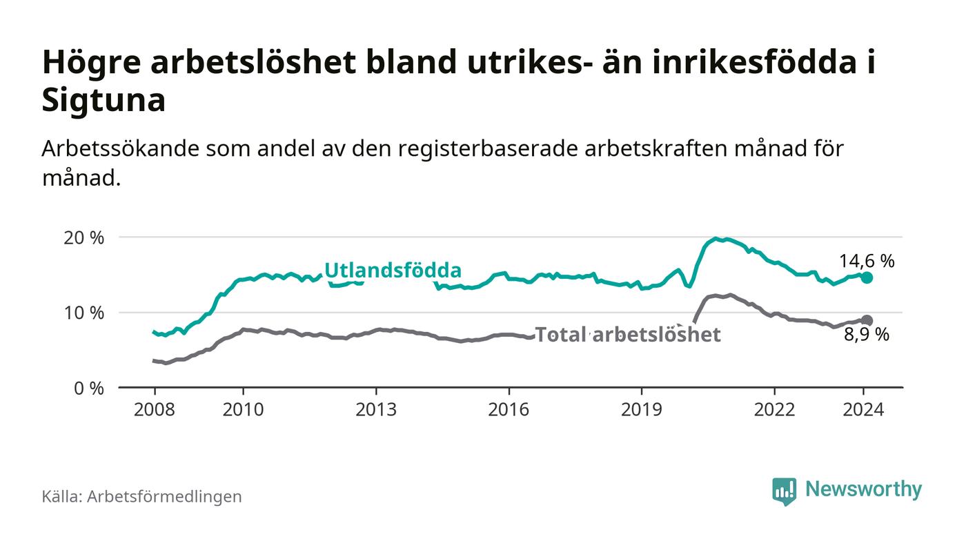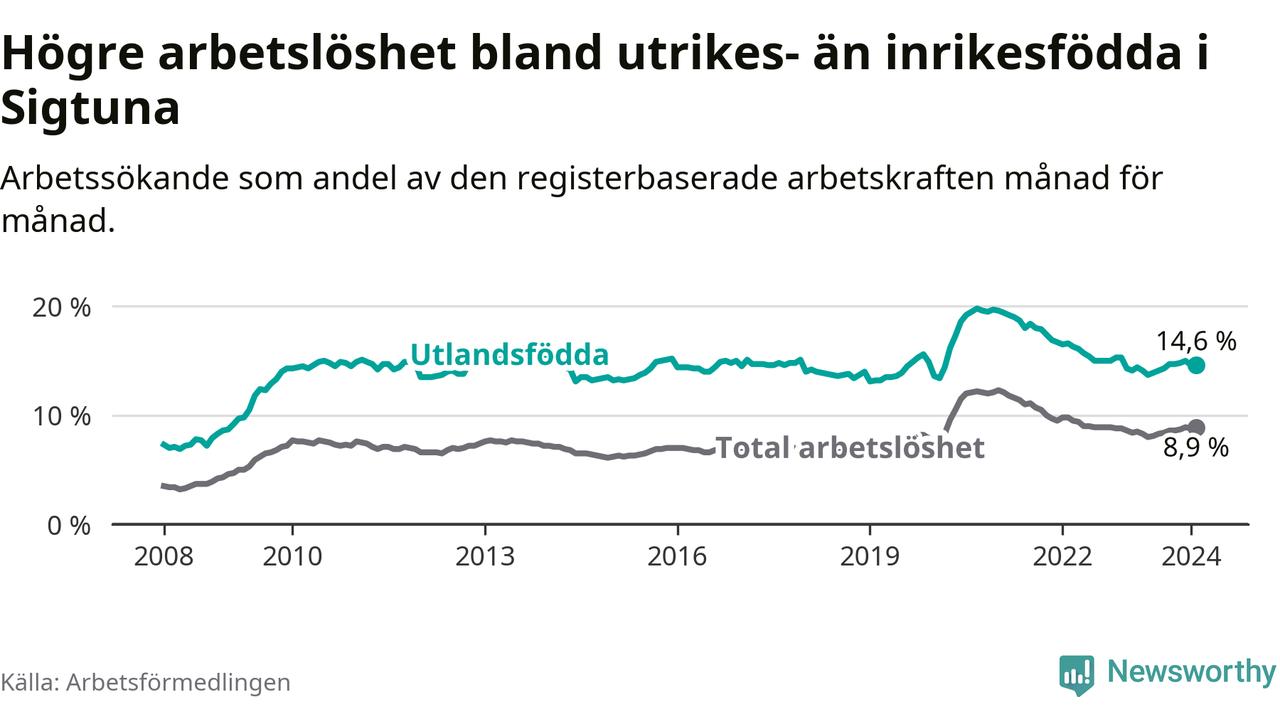Arbetslösheten bland utlandsfödda var 14,6 procent i Sigtuna under februari månad, motsvarande 15 av 103 personer. Det är 0,5 procentenheter fler än vid samma tidpunkt i fjol (−1 633 om man räknar personer).