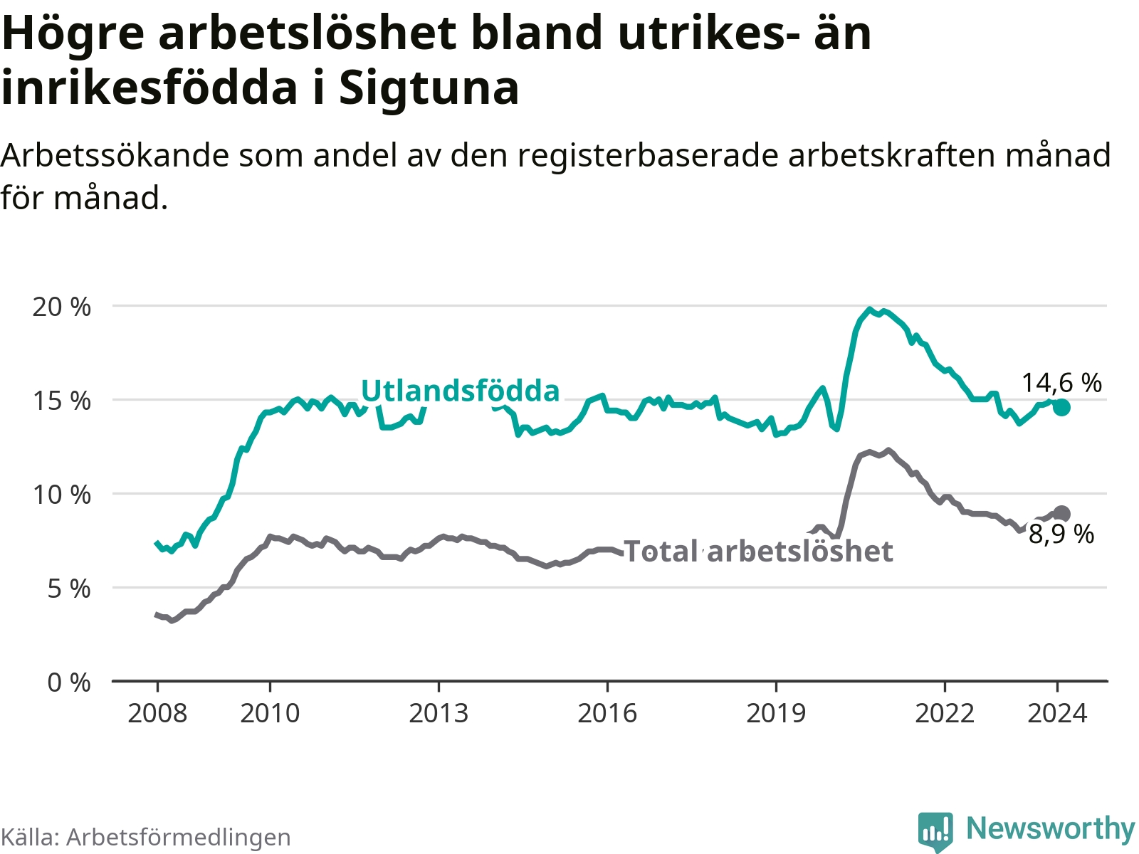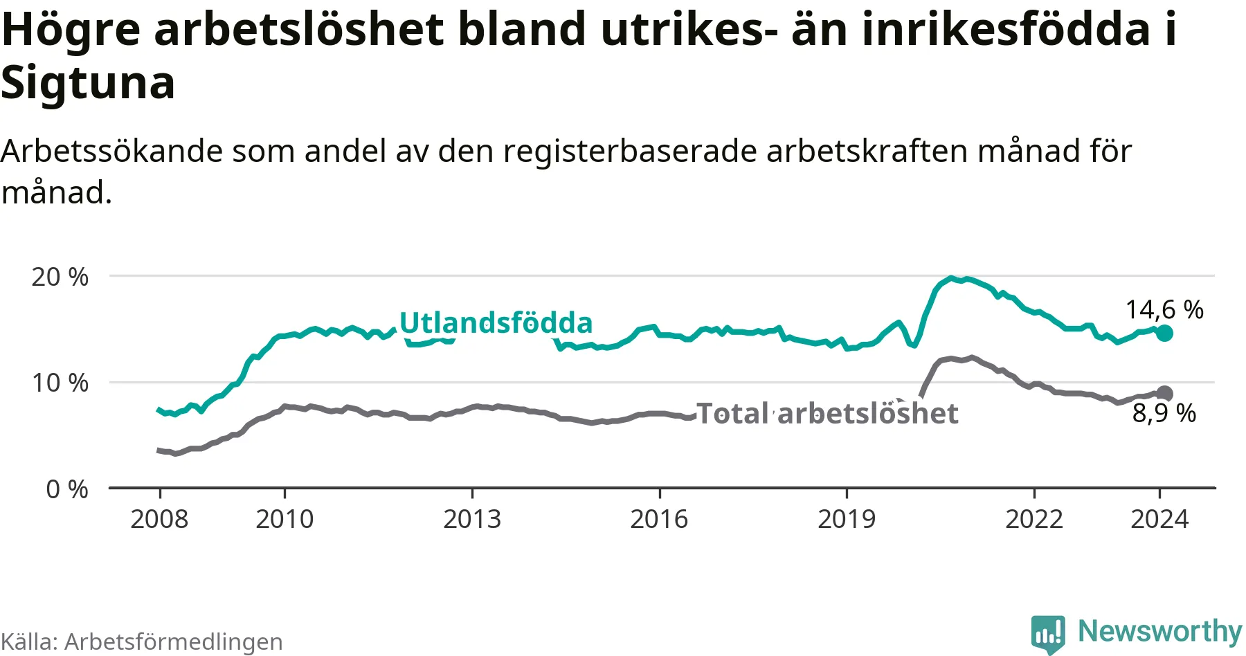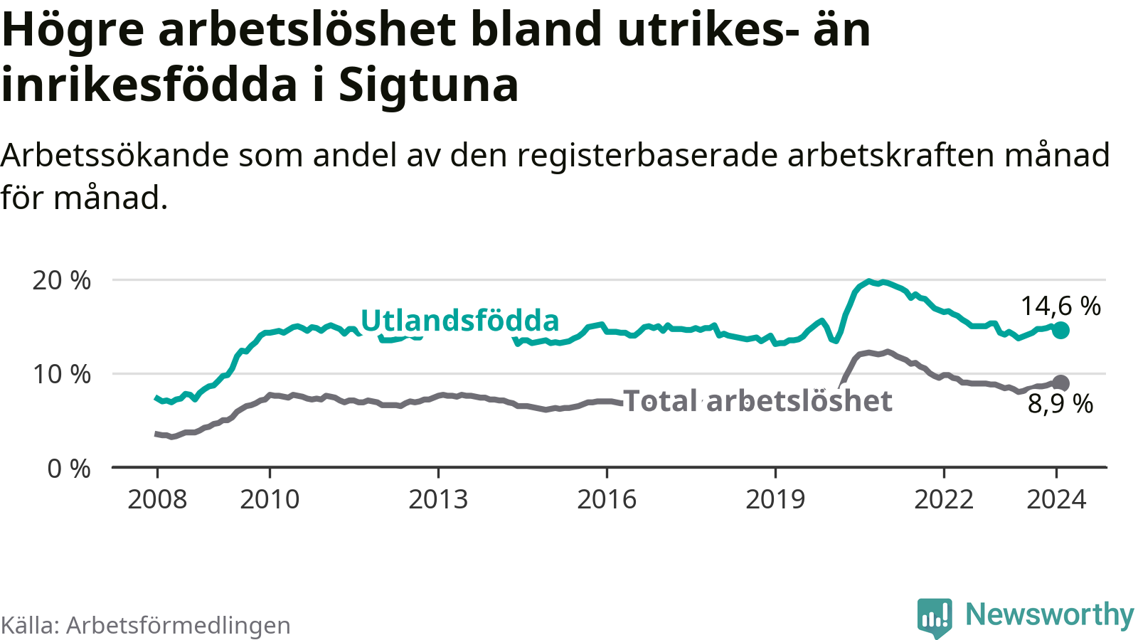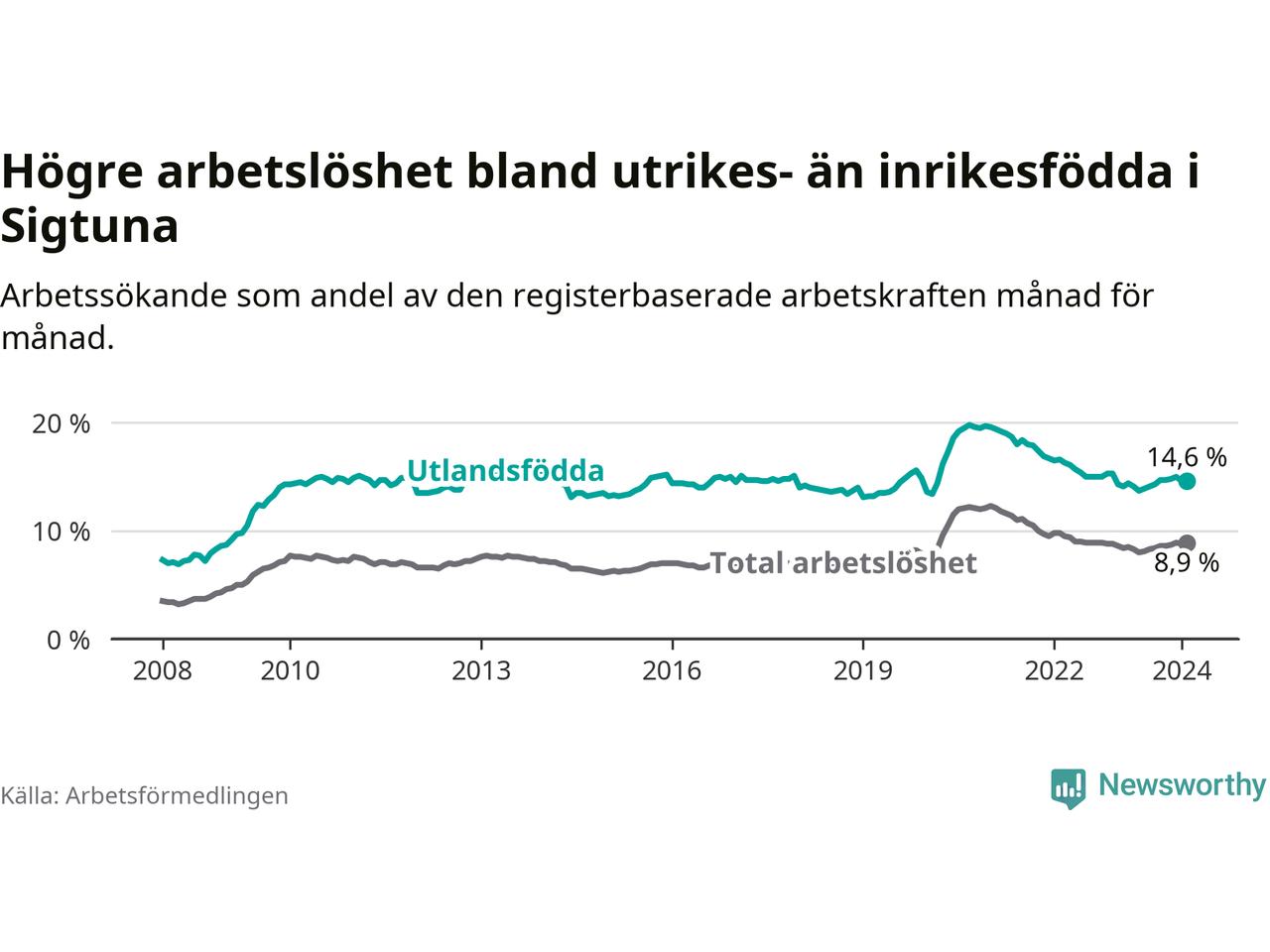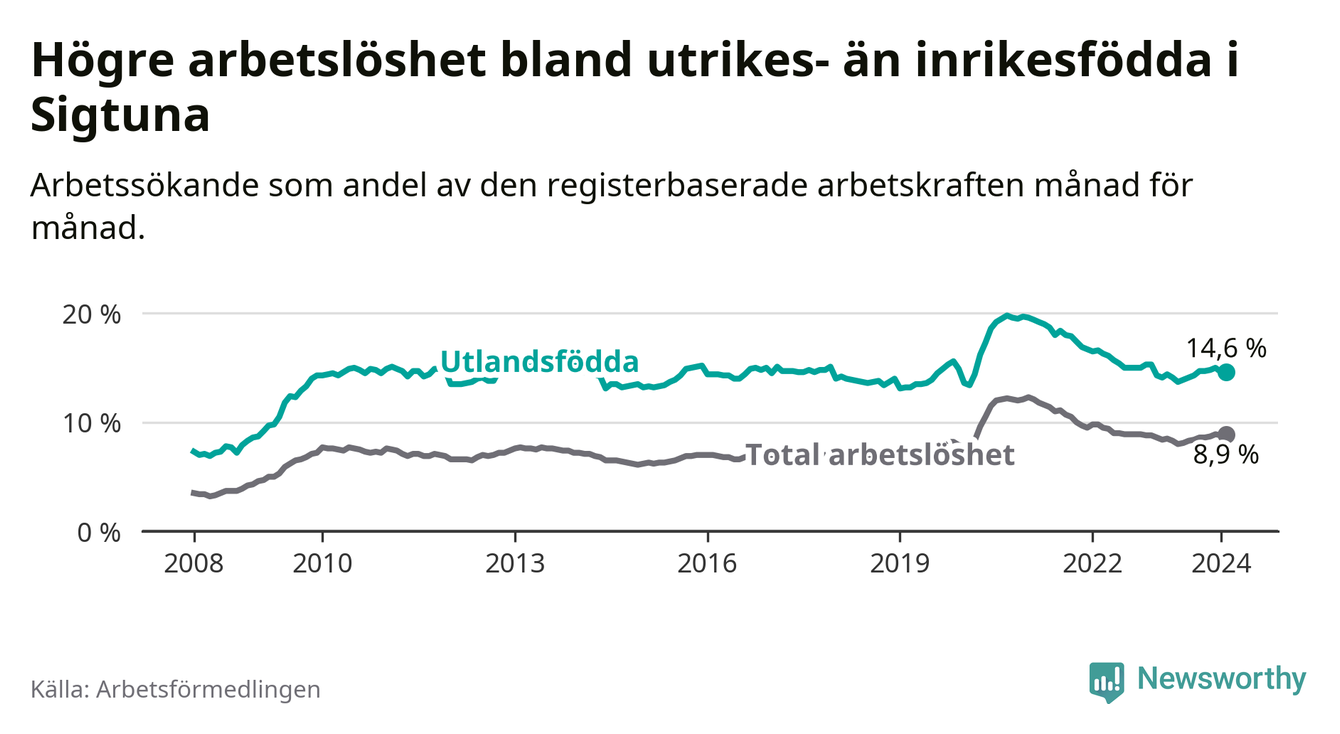 Arbetslösheten bland utlandsfödda var 14,6 procent i Sigtuna under februari månad, motsvarande 15 av 103 personer. Det är 0,5 procentenheter fler än vid samma tidpunkt i fjol (−1 633 om man räknar personer).