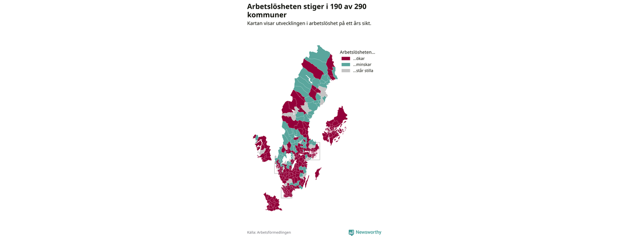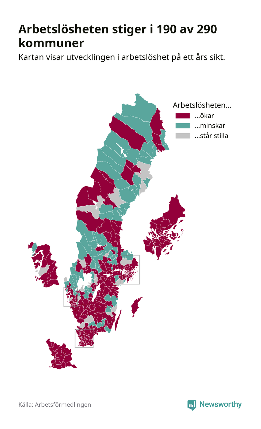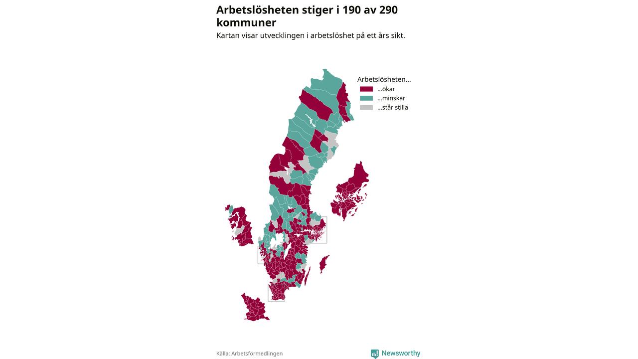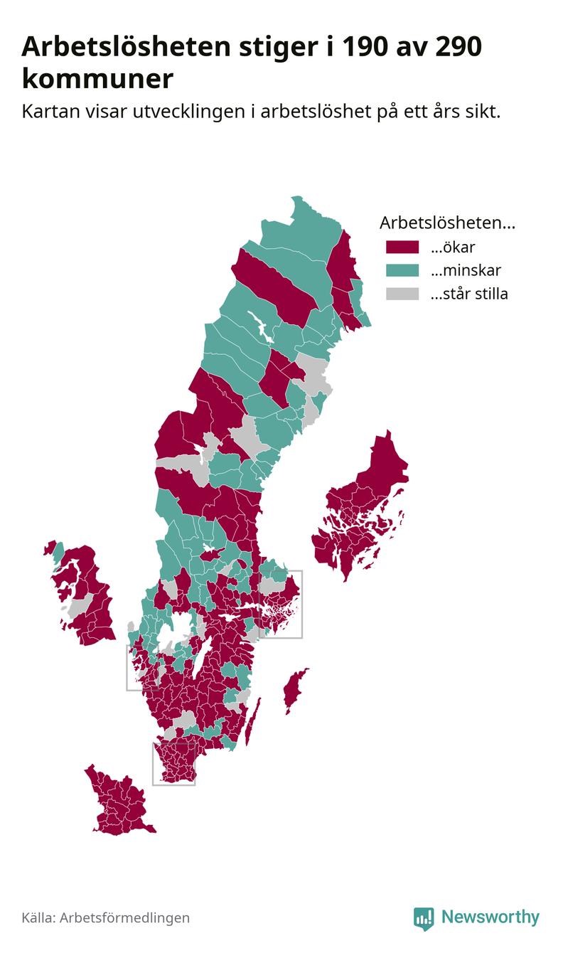 I riket som helhet steg arbetslösheten i februari jämfört med året innan (+0,3 procentenheter) och ligger nu på 6,8 procent. 190 av 290 kommuner har högre arbetslöshet i dag än för ett år sedan.