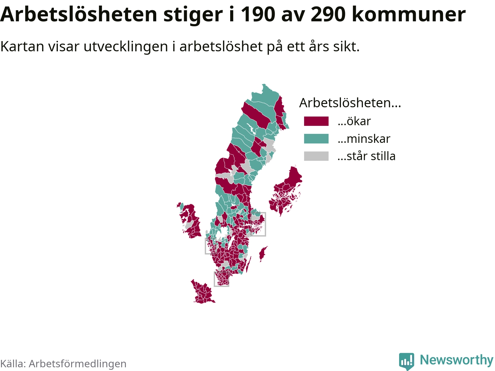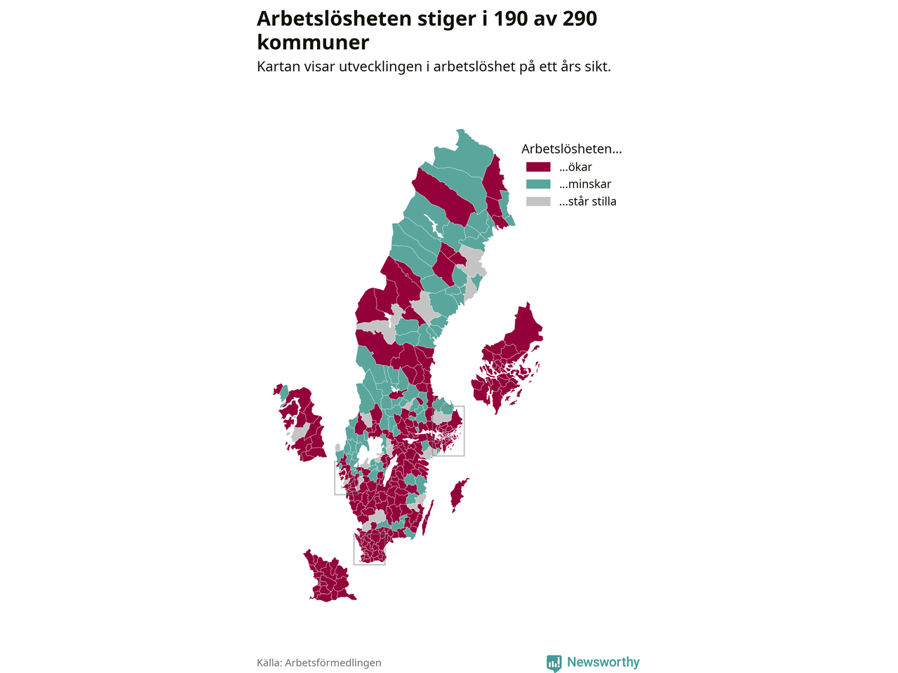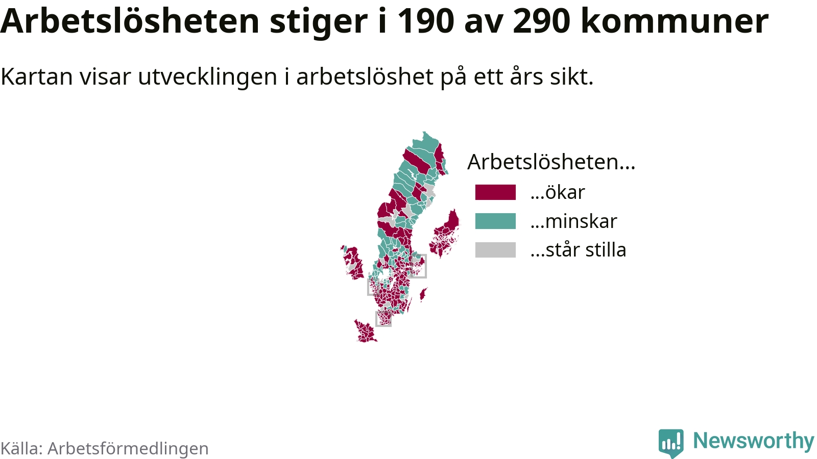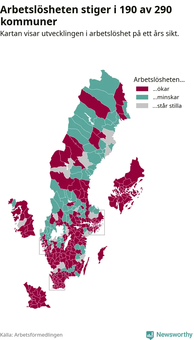 I riket som helhet steg arbetslösheten i februari jämfört med året innan (+0,3 procentenheter) och ligger nu på 6,8 procent. 190 av 290 kommuner har högre arbetslöshet i dag än för ett år sedan.
