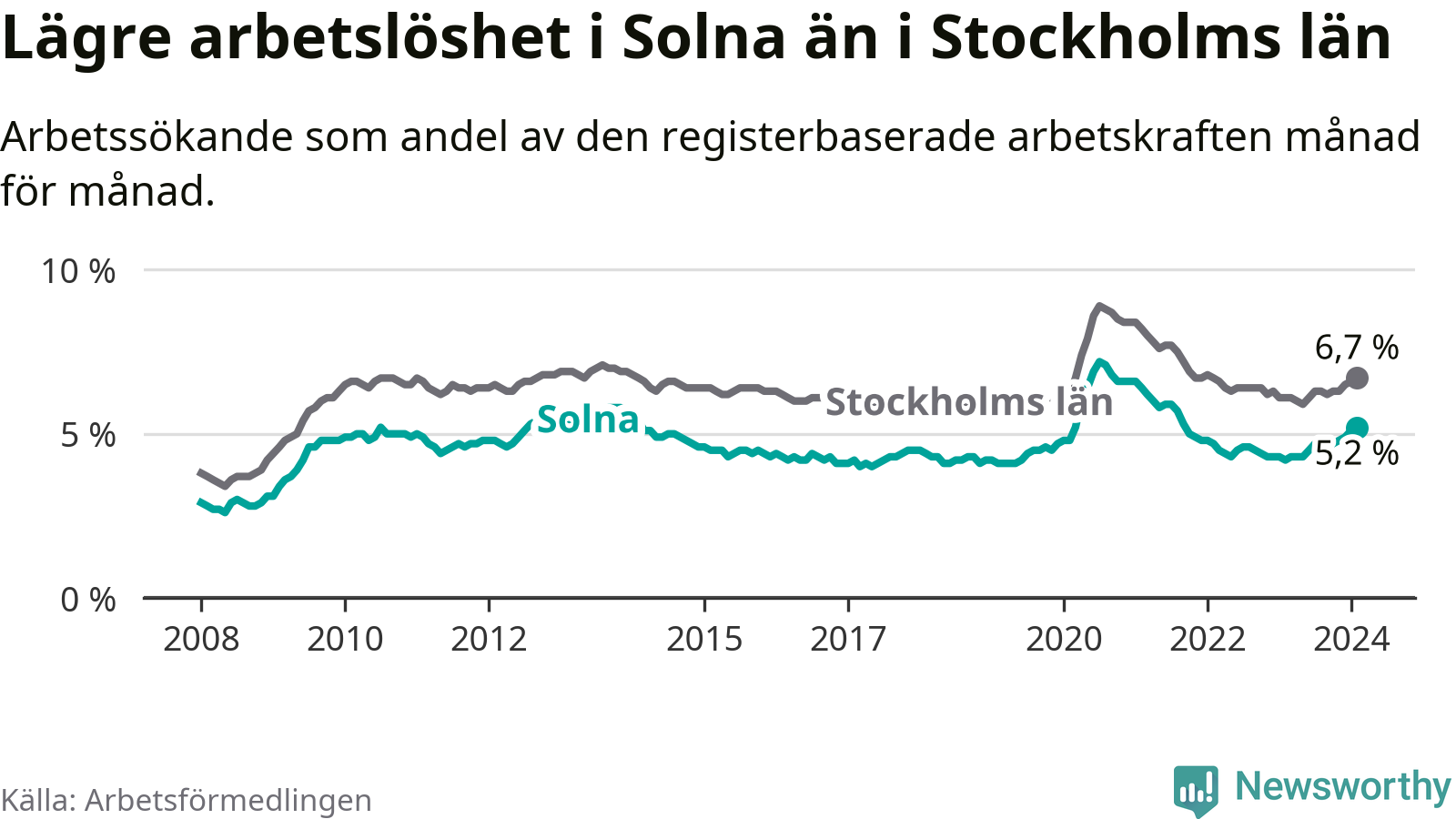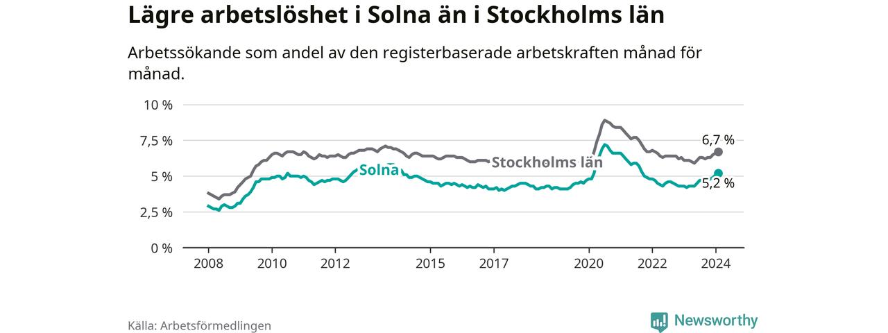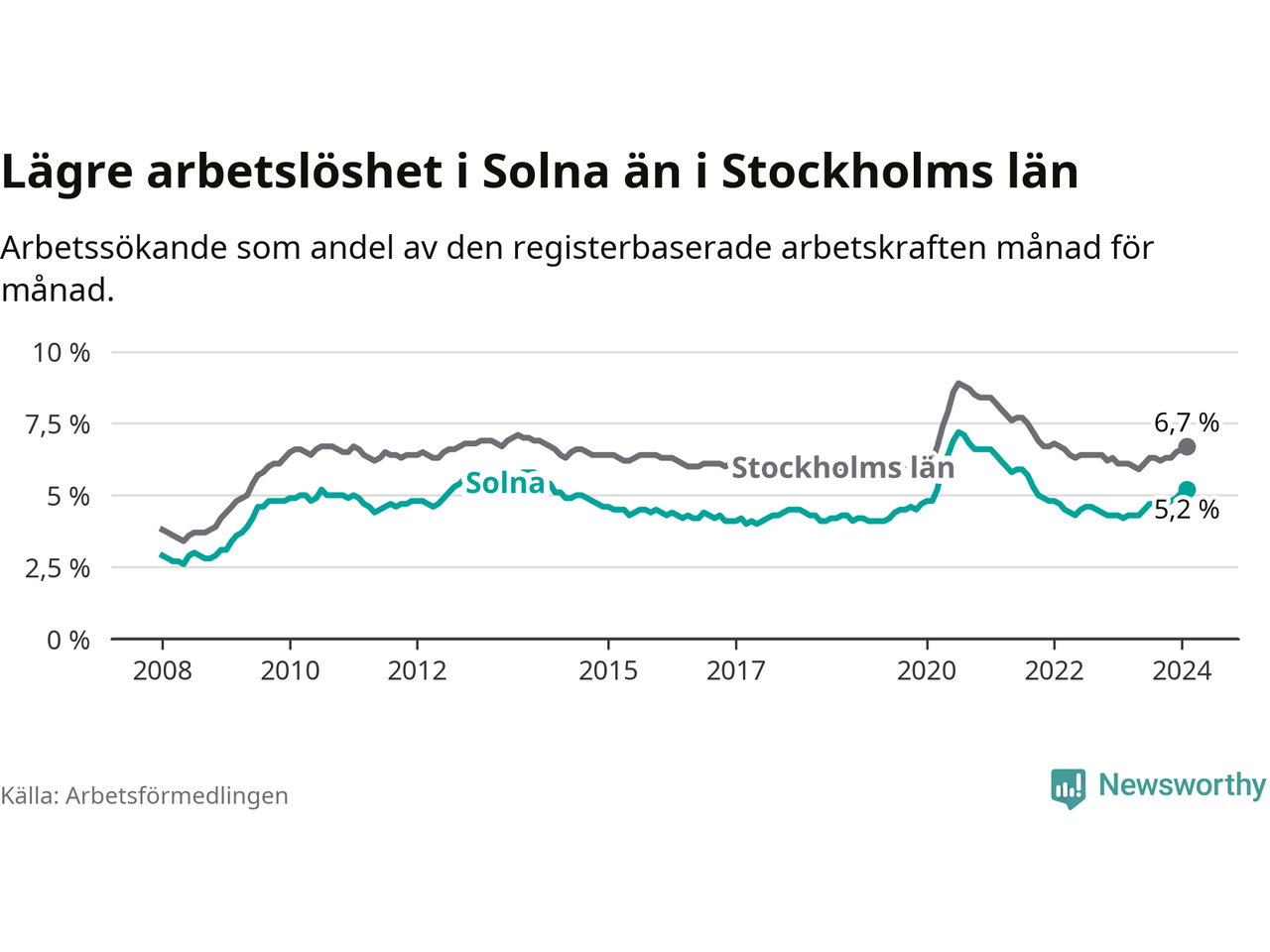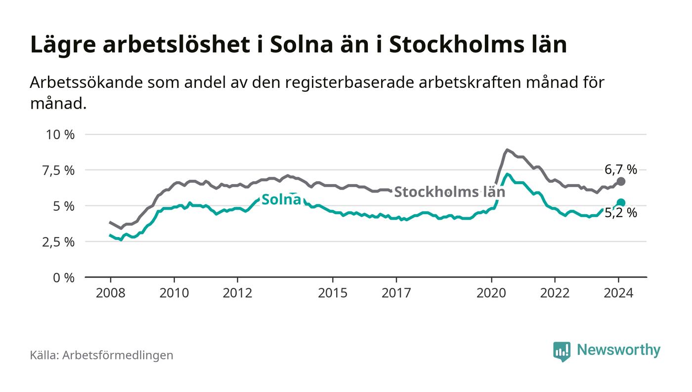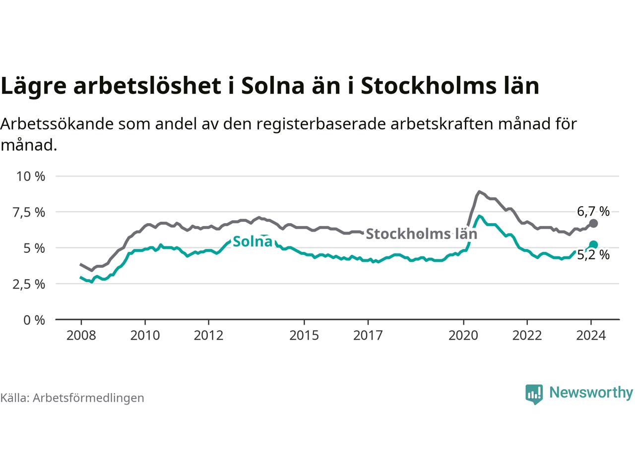 Även om arbetslösheten i Solna alltså ökar, så ligger den fortfarande under snittet i hela Stockholms län (5,2 procent i kommunen, jämfört med 6,7 procent i hela länet). Ekerö har den lägsta arbetslösheten i länet (3,5 procent), medan Botkyrka har den högsta (11,1 procent).