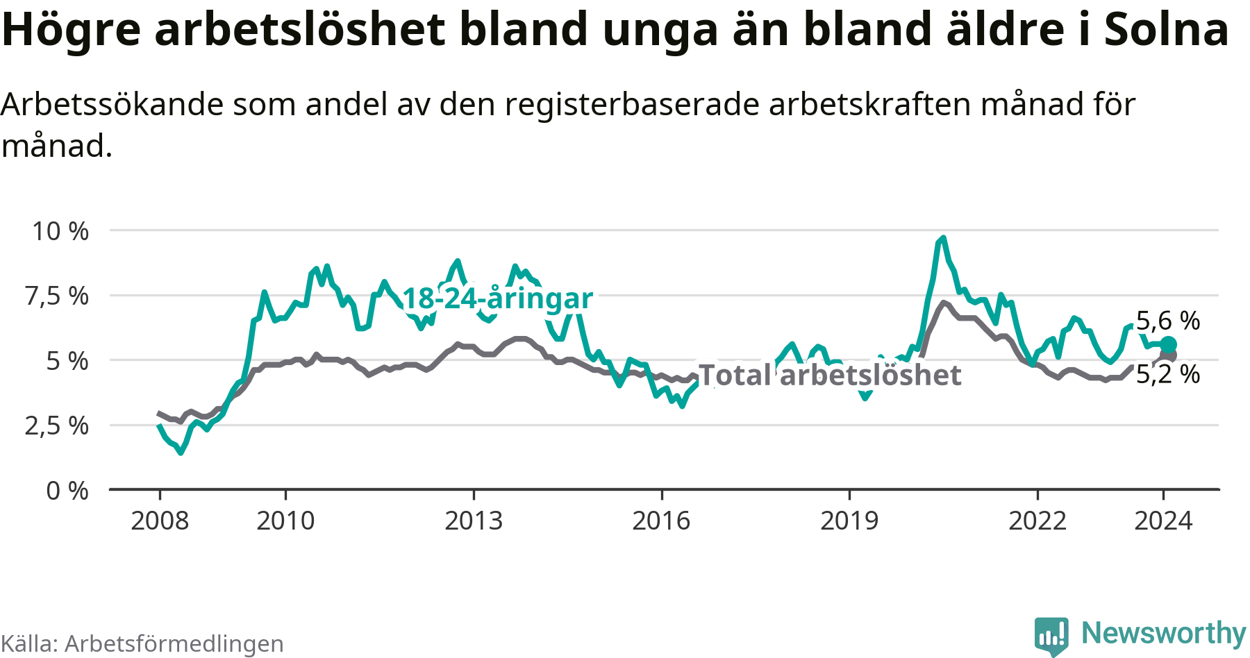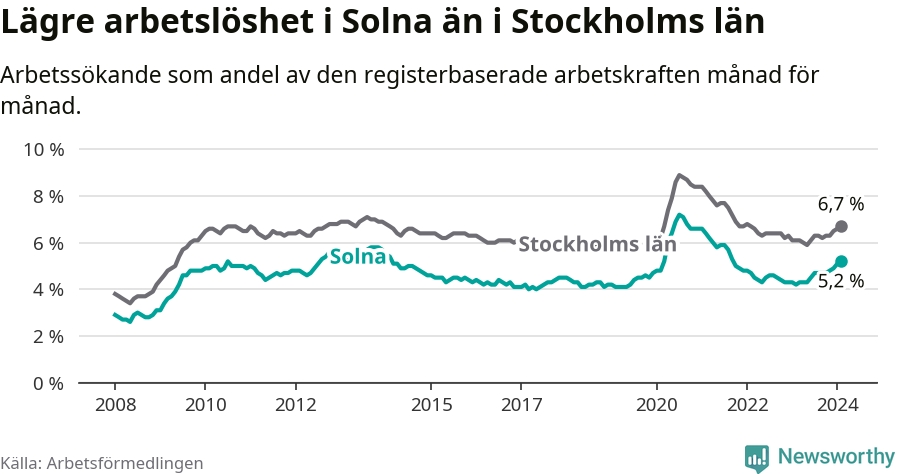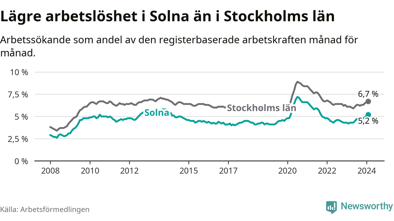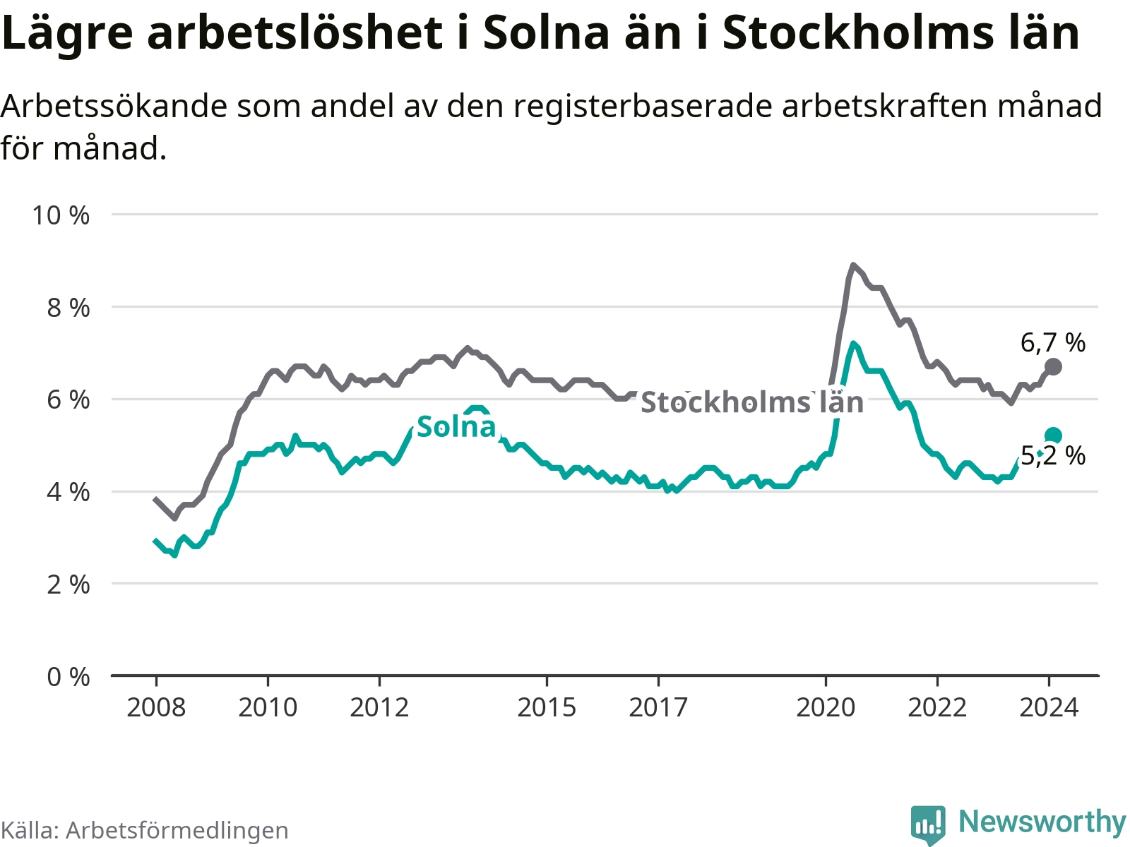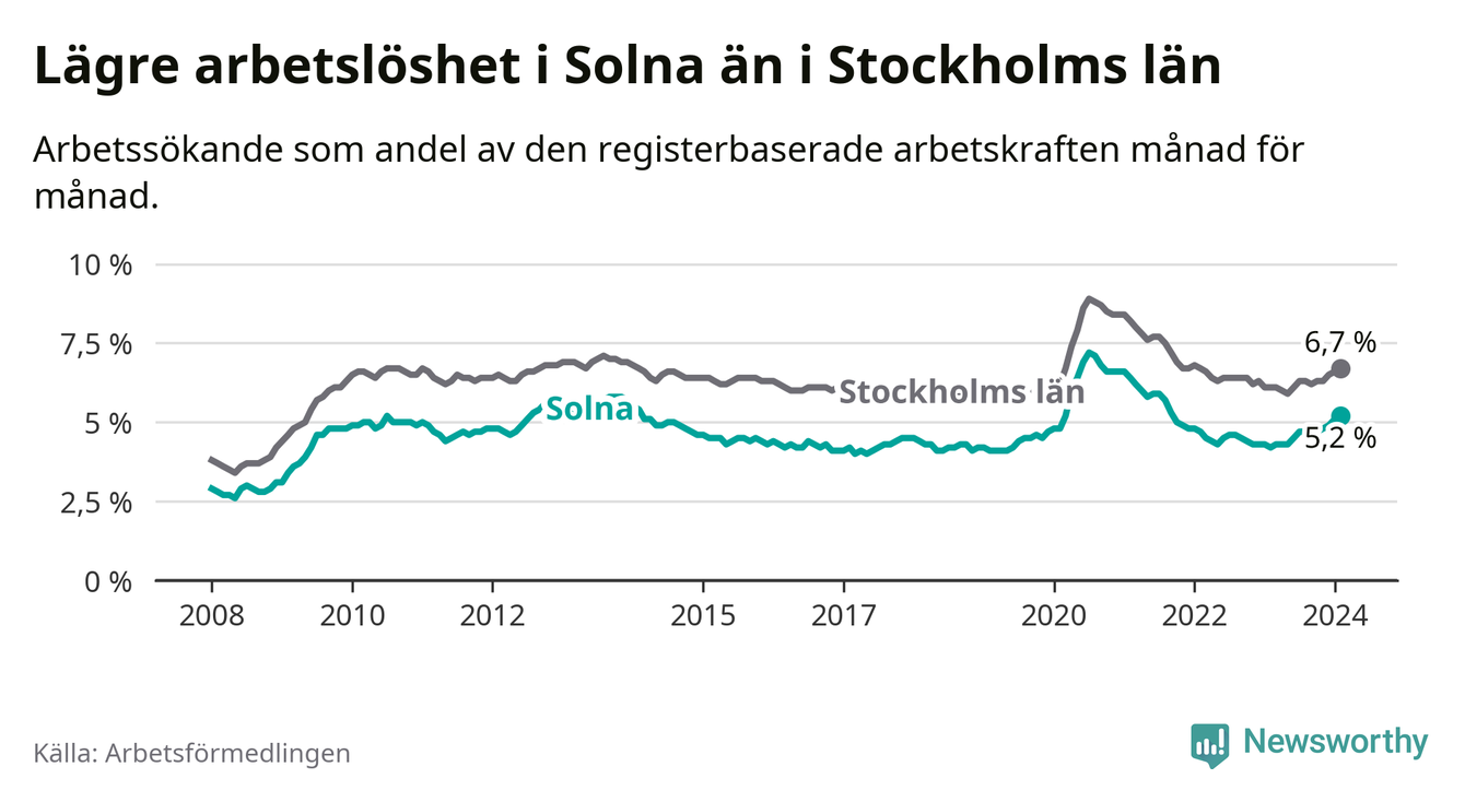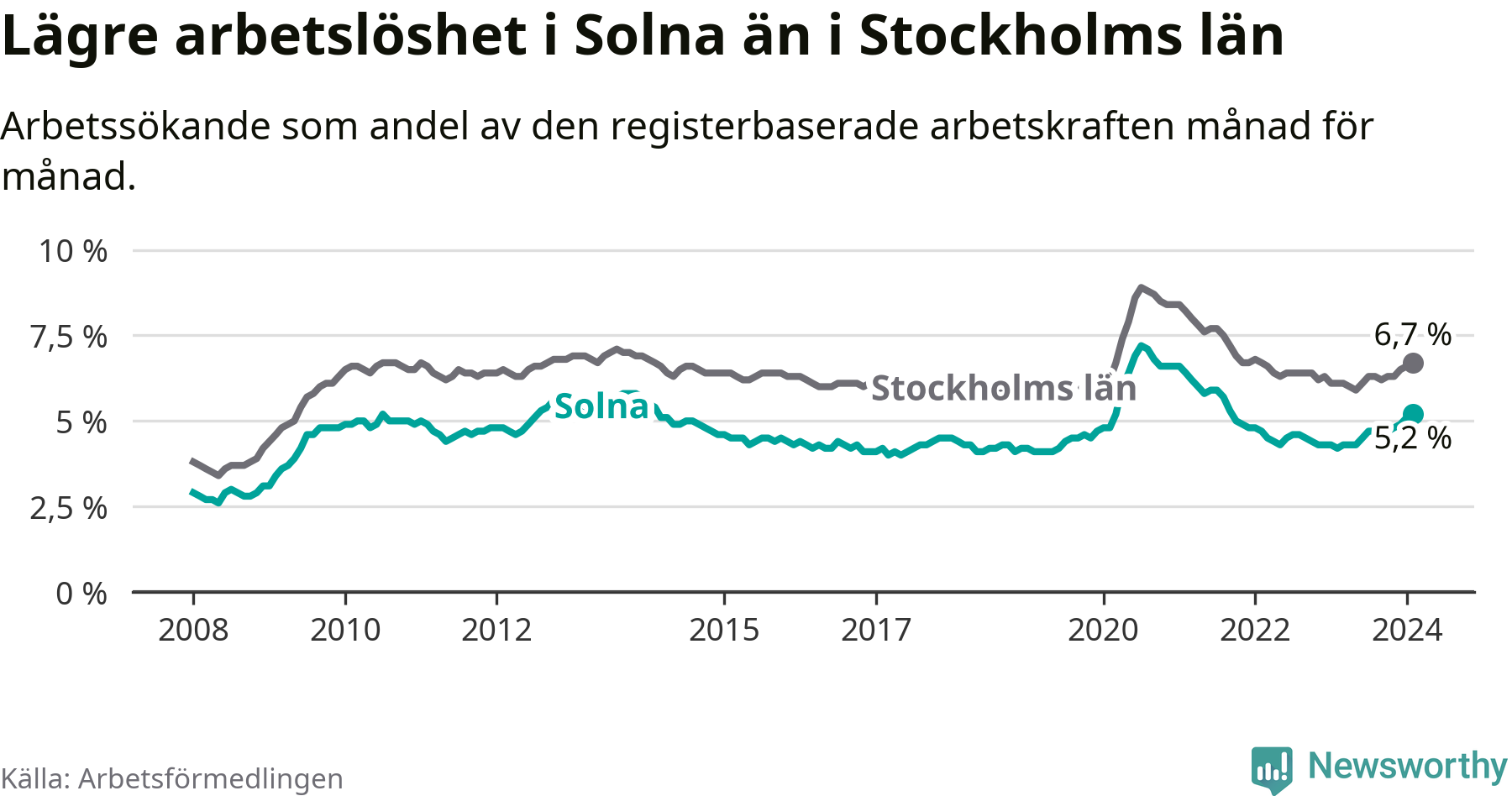 Även om arbetslösheten i Solna alltså ökar, så ligger den fortfarande under snittet i hela Stockholms län (5,2 procent i kommunen, jämfört med 6,7 procent i hela länet). Ekerö har den lägsta arbetslösheten i länet (3,5 procent), medan Botkyrka har den högsta (11,1 procent).