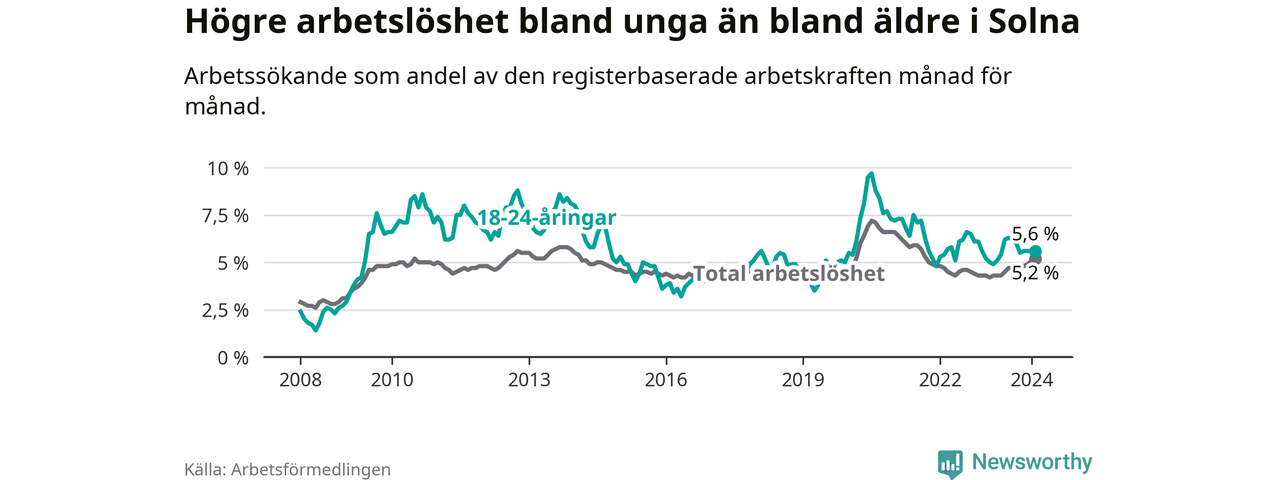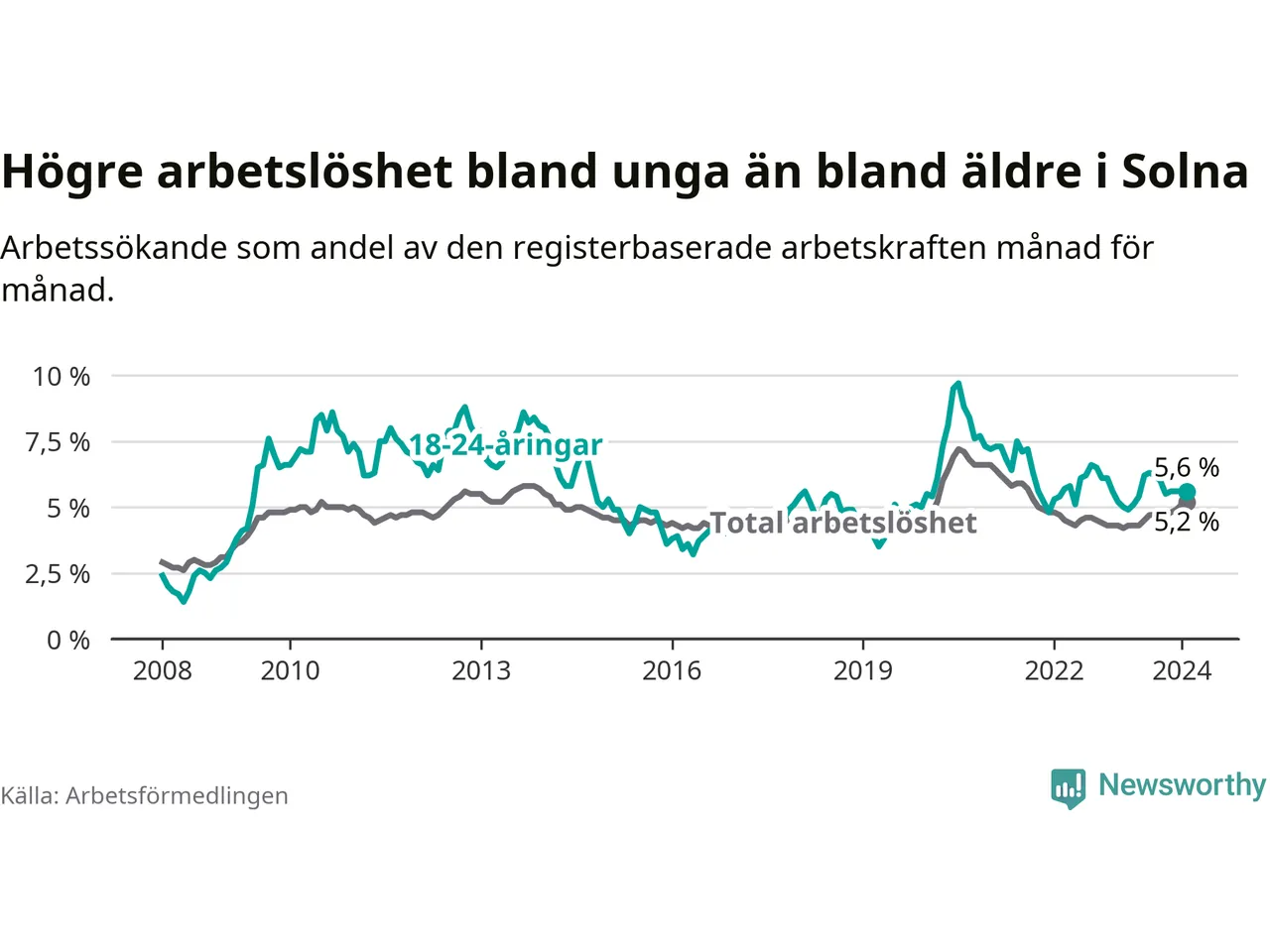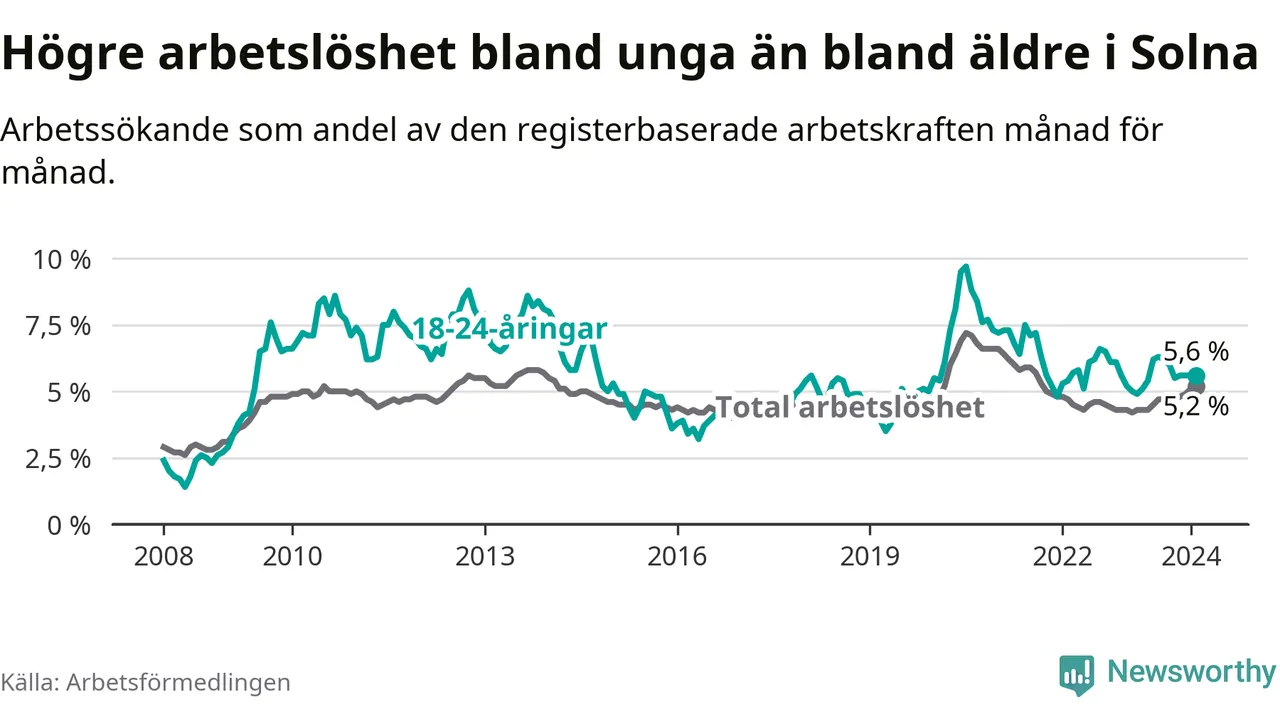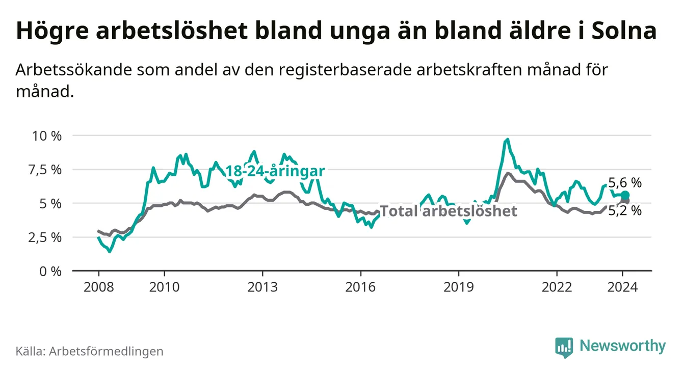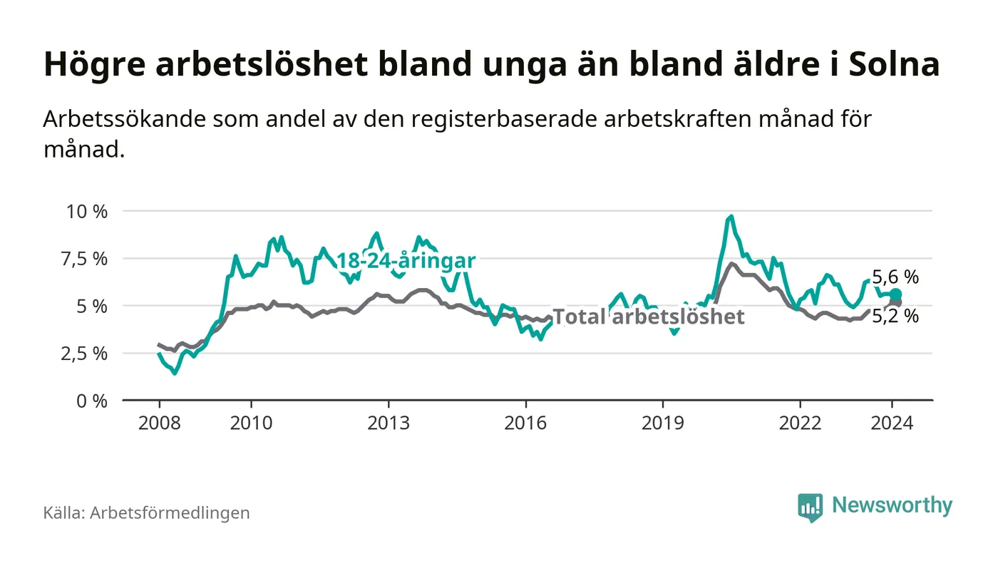 Det är åttonde månaden i följd som arbetslösheten i Solna är högre än den var under samma tidpunkt året innan. Den nuvarande arbetslöshetsnivån är därmed den högsta sedan september 2021.