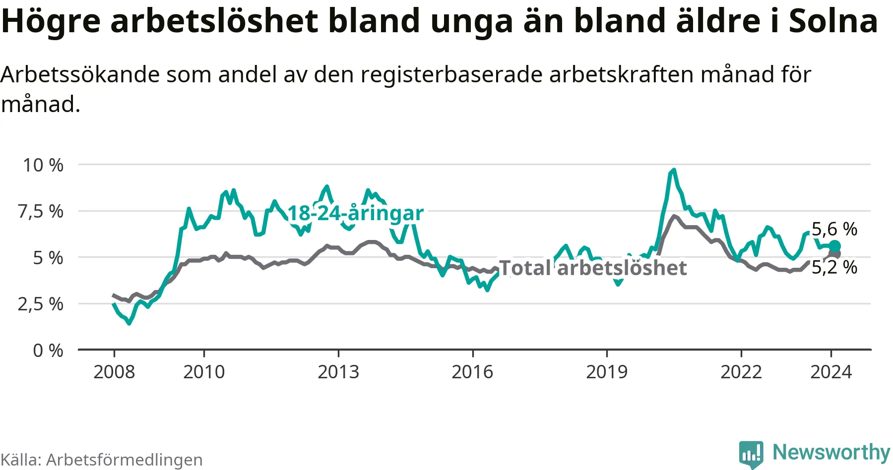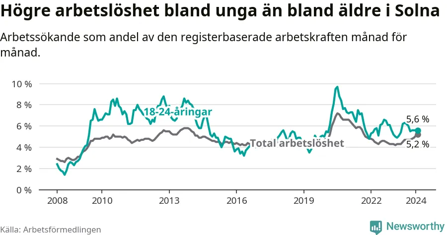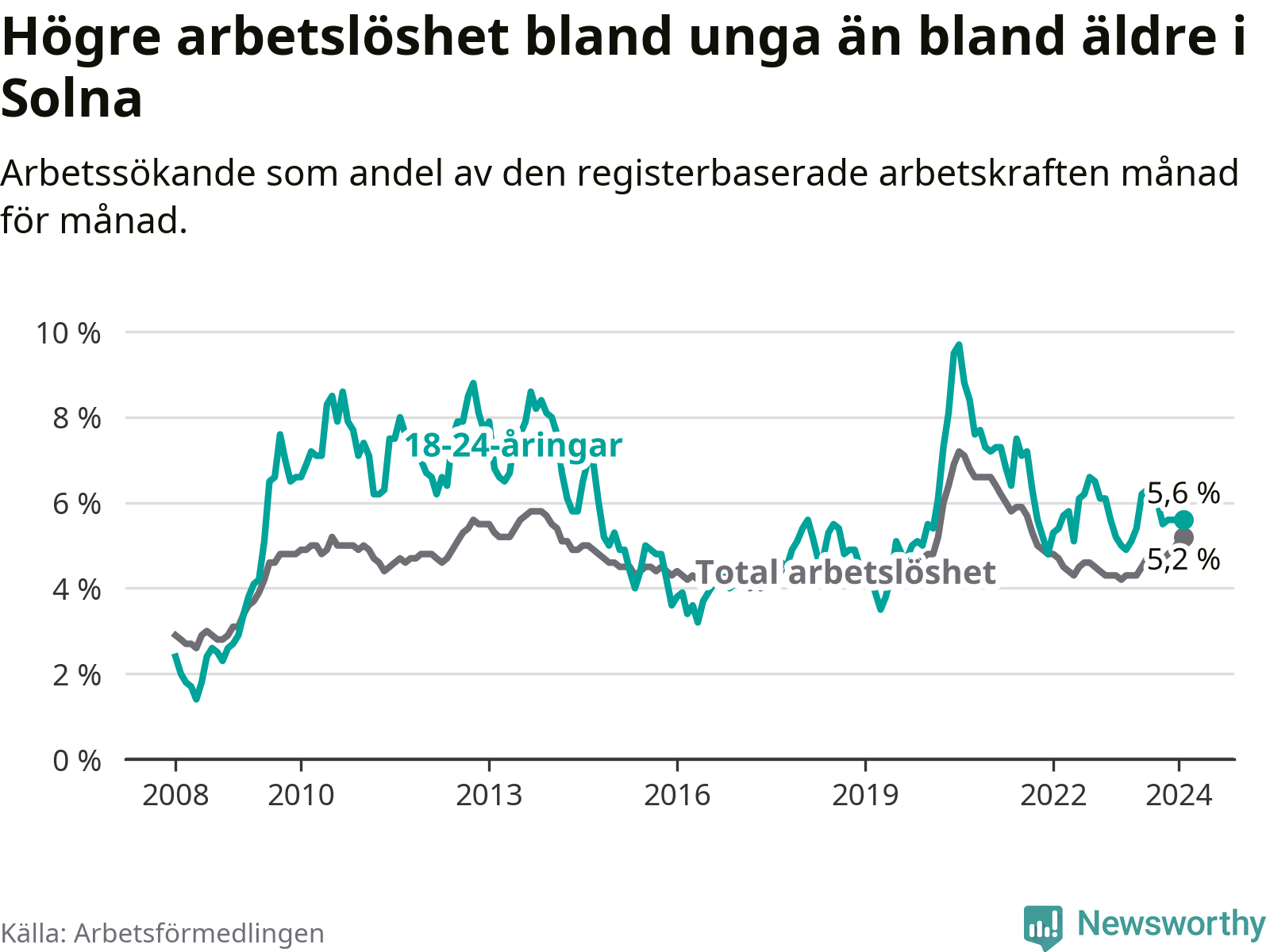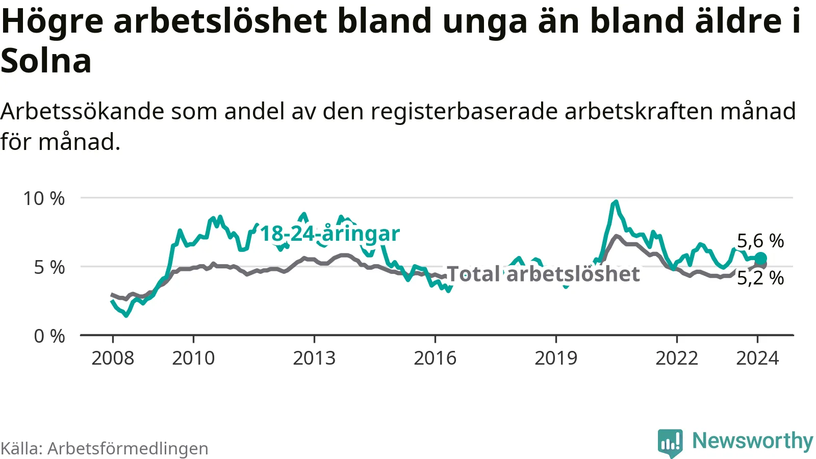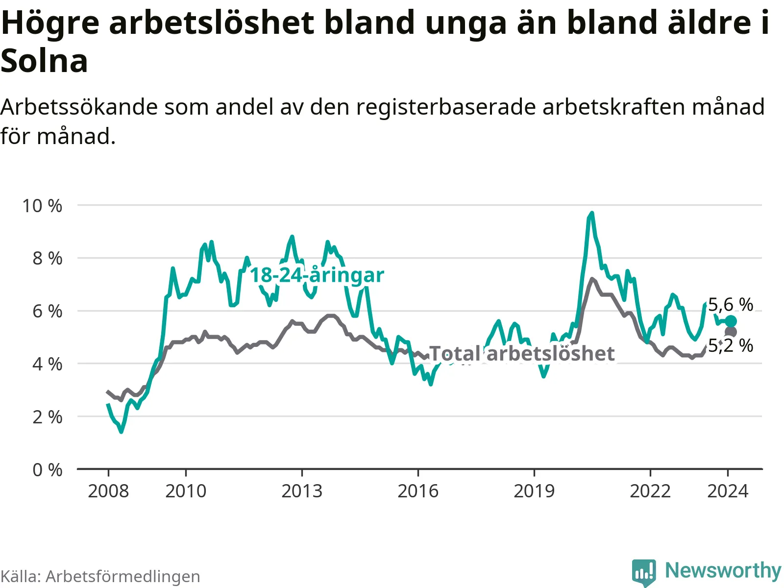 Det är åttonde månaden i följd som arbetslösheten i Solna är högre än den var under samma tidpunkt året innan. Den nuvarande arbetslöshetsnivån är därmed den högsta sedan september 2021.