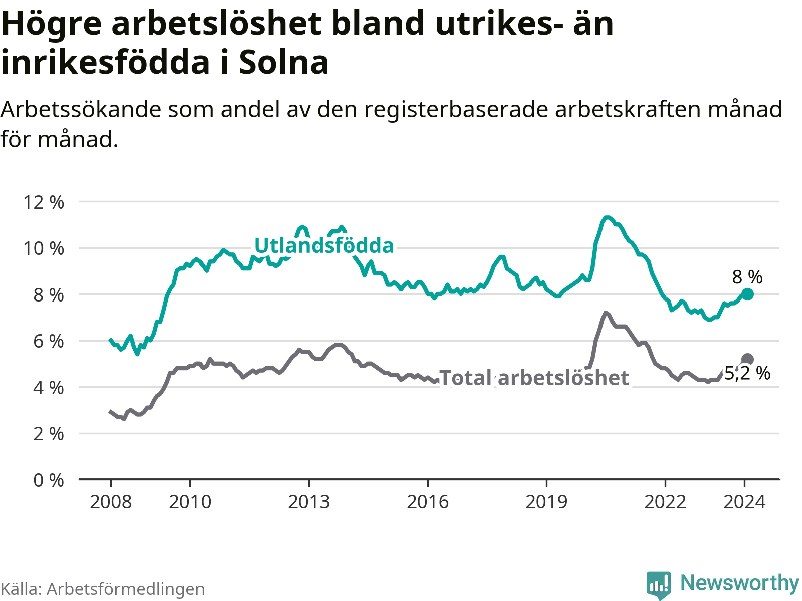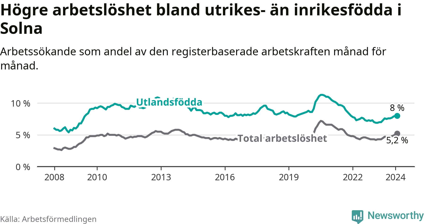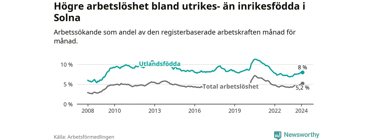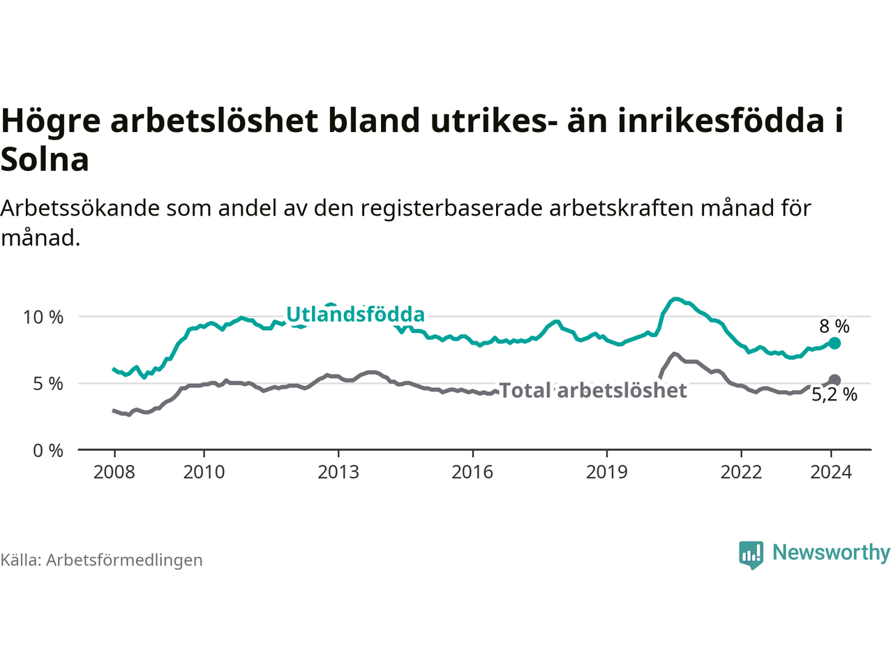 Arbetslösheten bland utlandsfödda var 8,0 procent i Solna under februari månad, motsvarande åtta av 100 personer. Det är 1,1 procentenheter fler än vid samma tidpunkt i fjol (−1 162 om man räknar personer). Därmed är de utlandsföddas arbetslöshet högre än vid samma tidpunkt i fjol för sjunde månaden i följd.