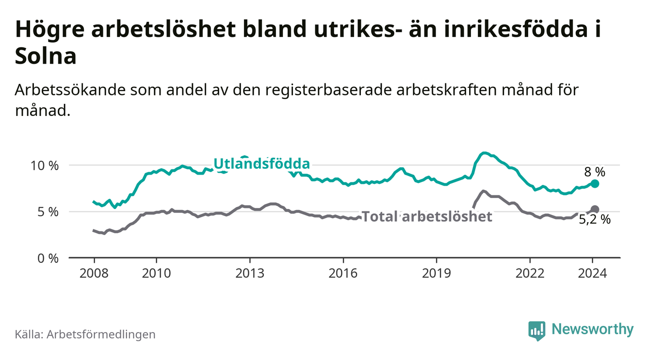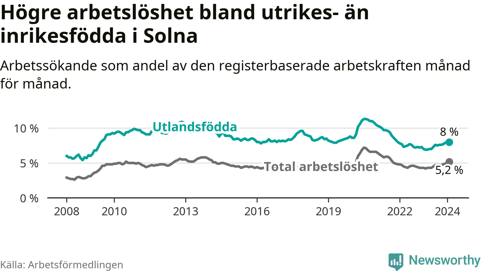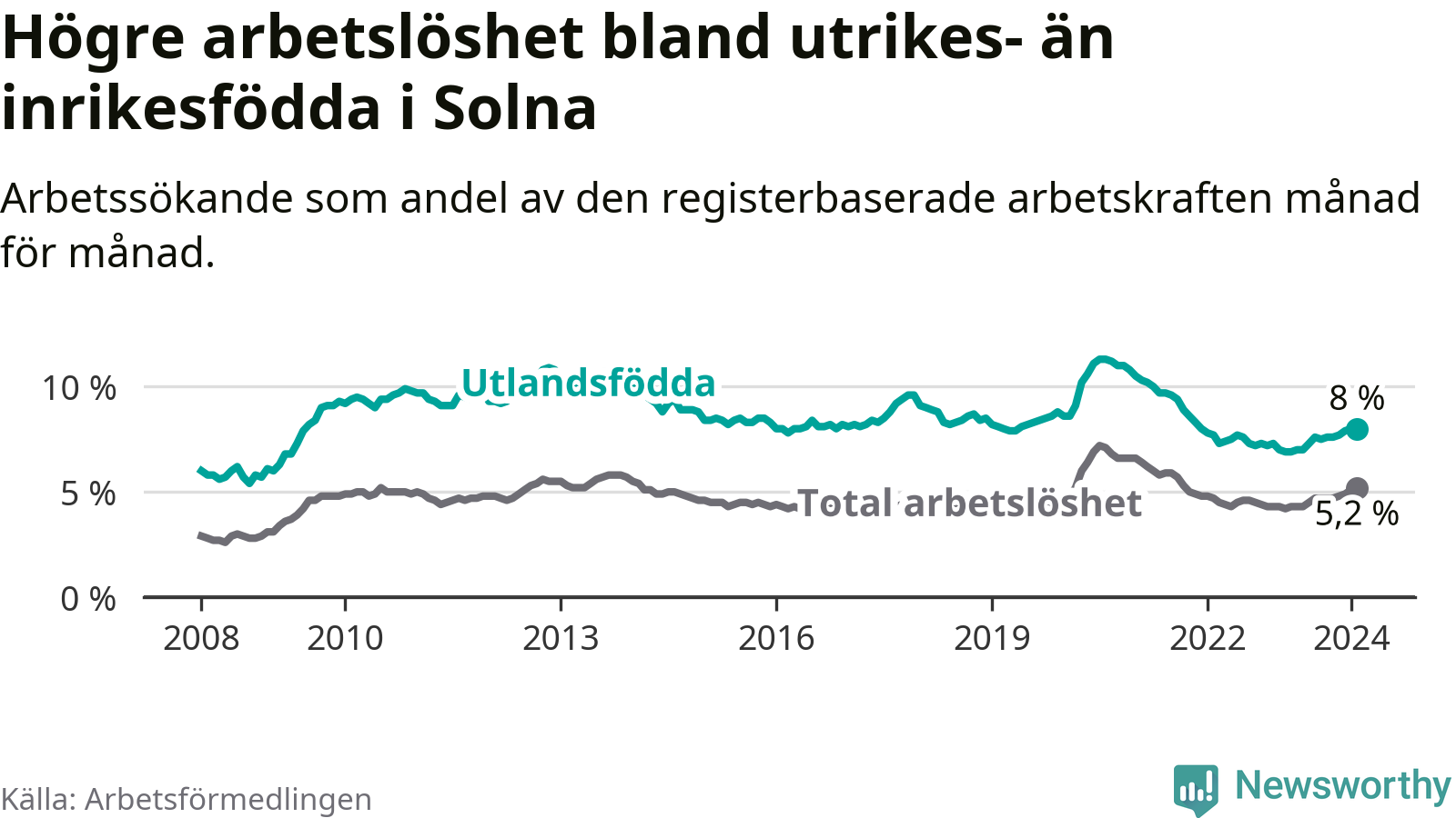 Arbetslösheten bland utlandsfödda var 8,0 procent i Solna under februari månad, motsvarande åtta av 100 personer. Det är 1,1 procentenheter fler än vid samma tidpunkt i fjol (−1 162 om man räknar personer). Därmed är de utlandsföddas arbetslöshet högre än vid samma tidpunkt i fjol för sjunde månaden i följd.