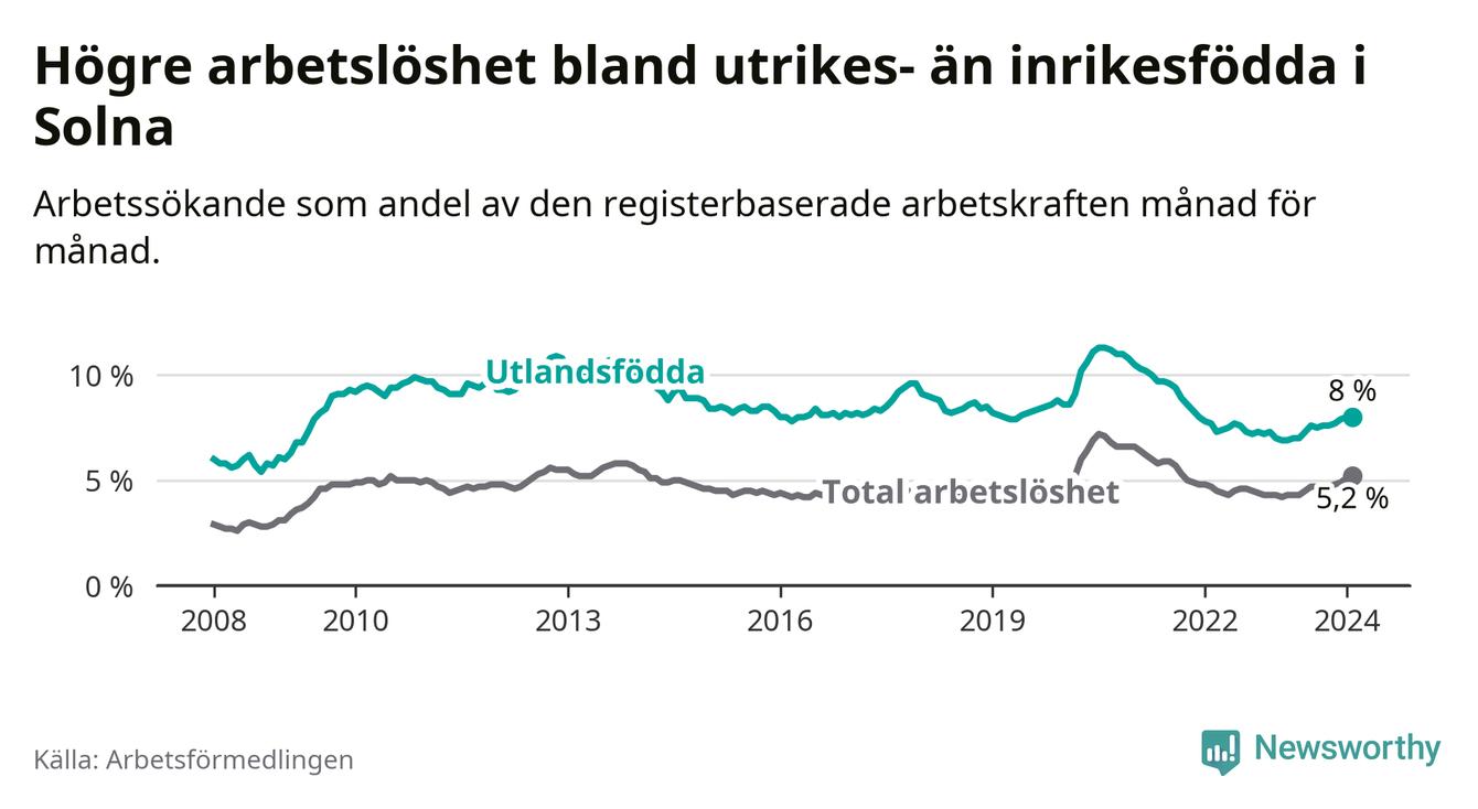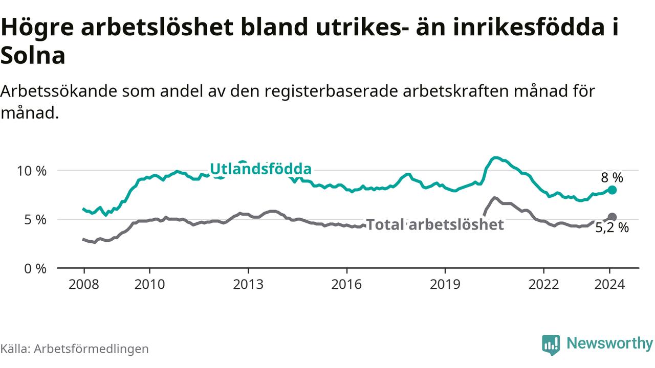 Skillnaden i arbetslöshet mellan utrikesfödda och hela befolkningen är 2,8 procentenheter i Solna.