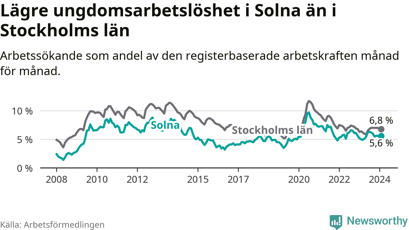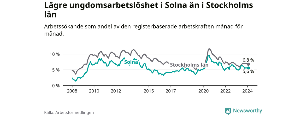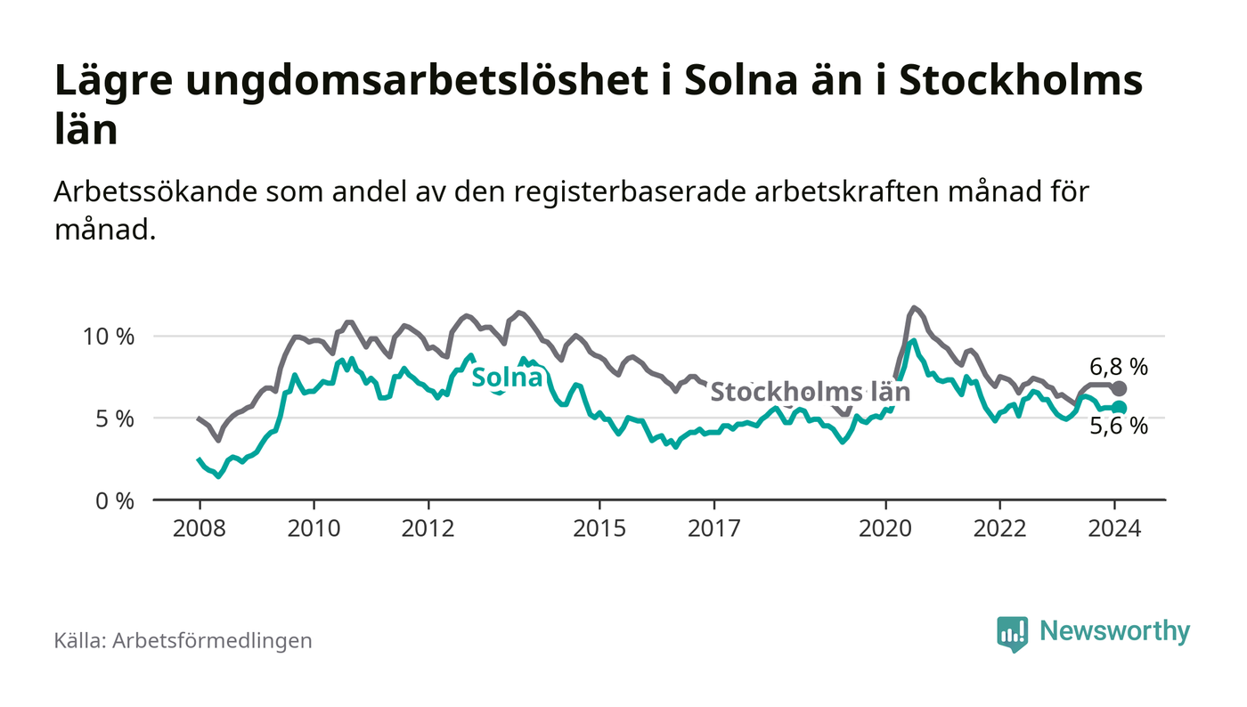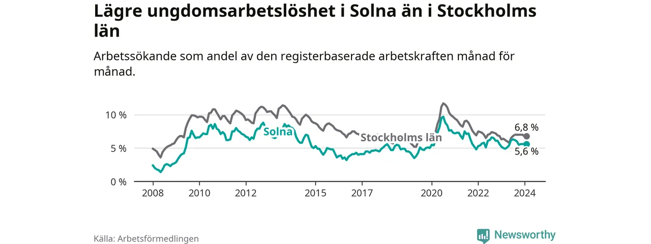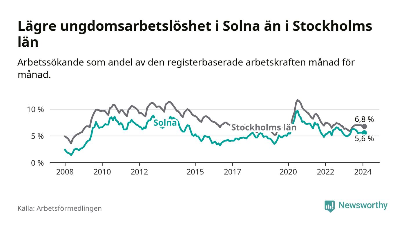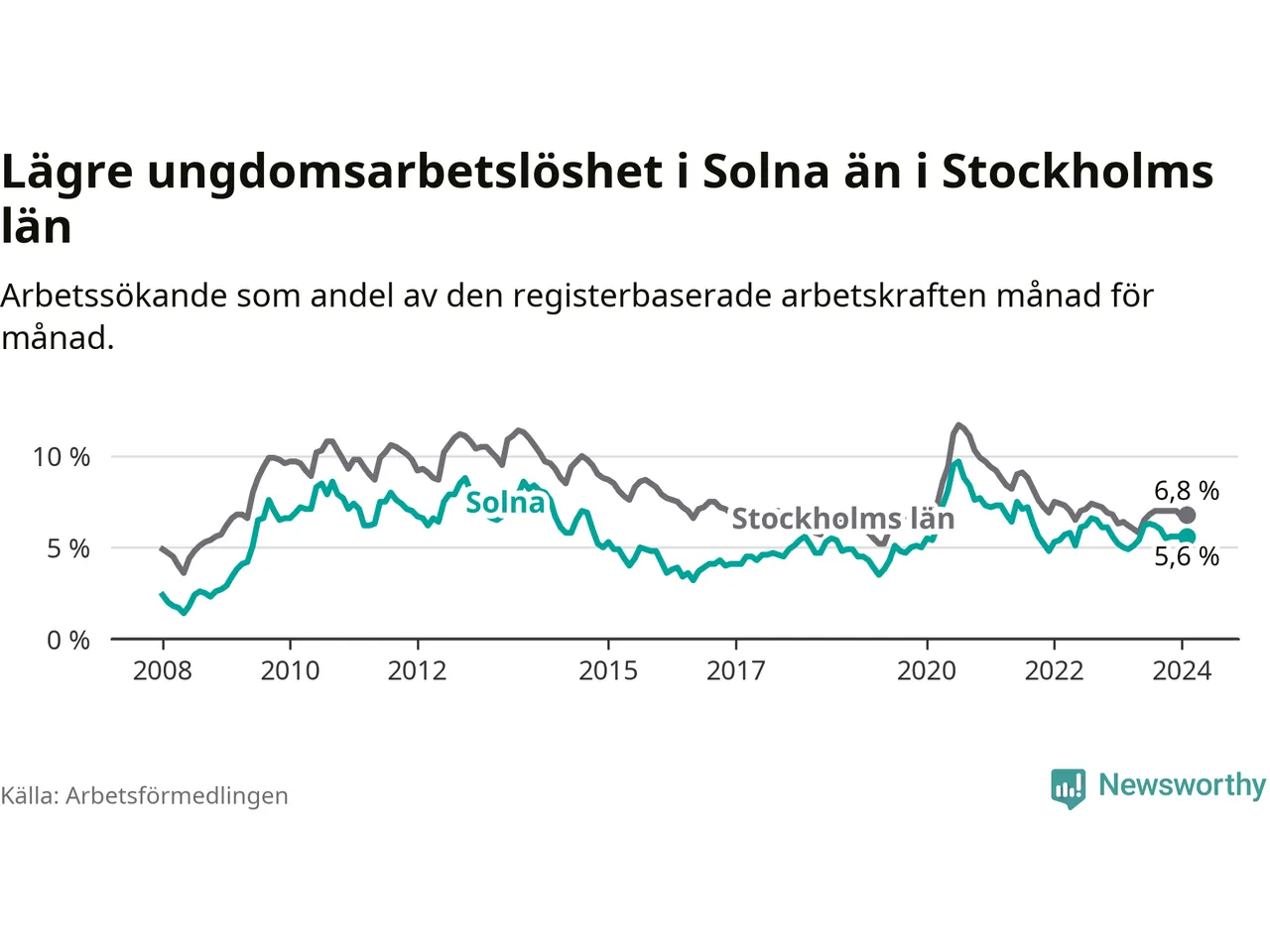 Precis som den totala arbetslösheten ligger ungdomsarbetslösheten i Solna lägre än i Stockholms län som helhet. Skillnaden mellan kommunen och länet är 1,2 procentenheter.
