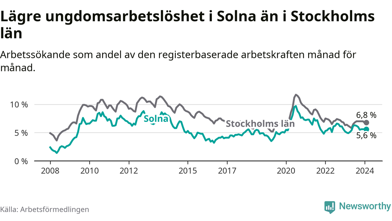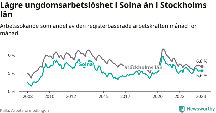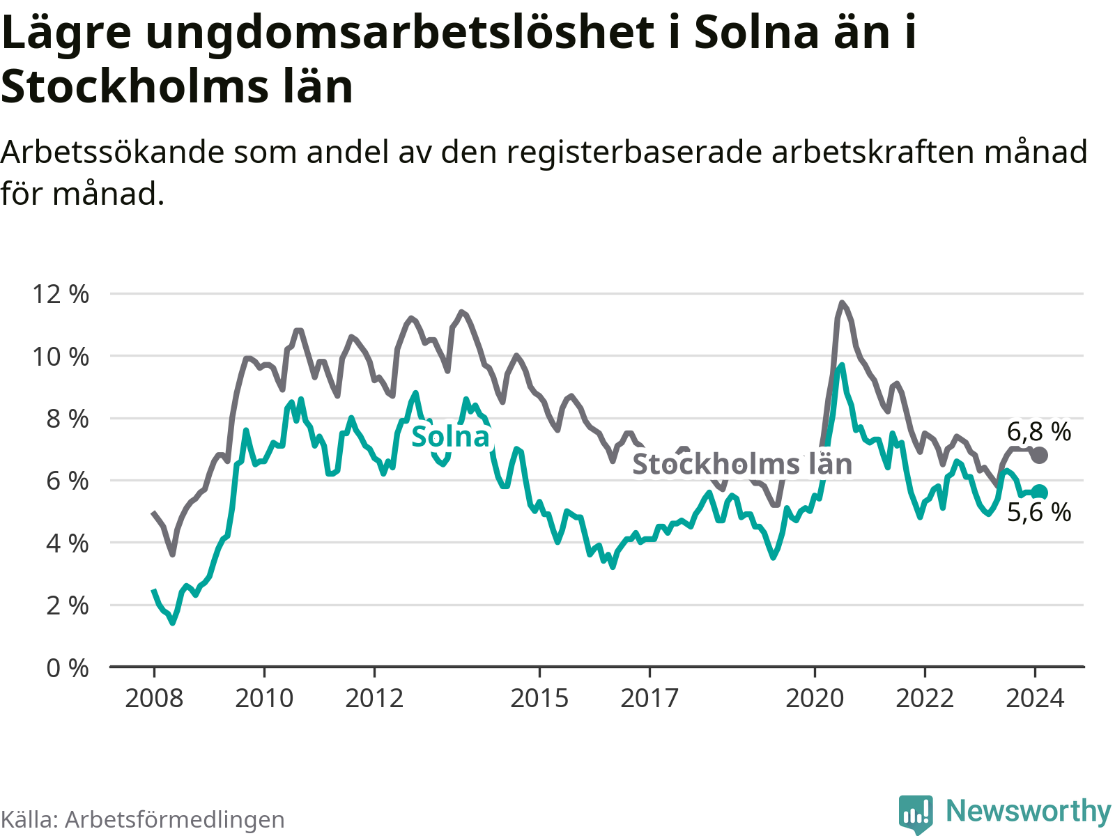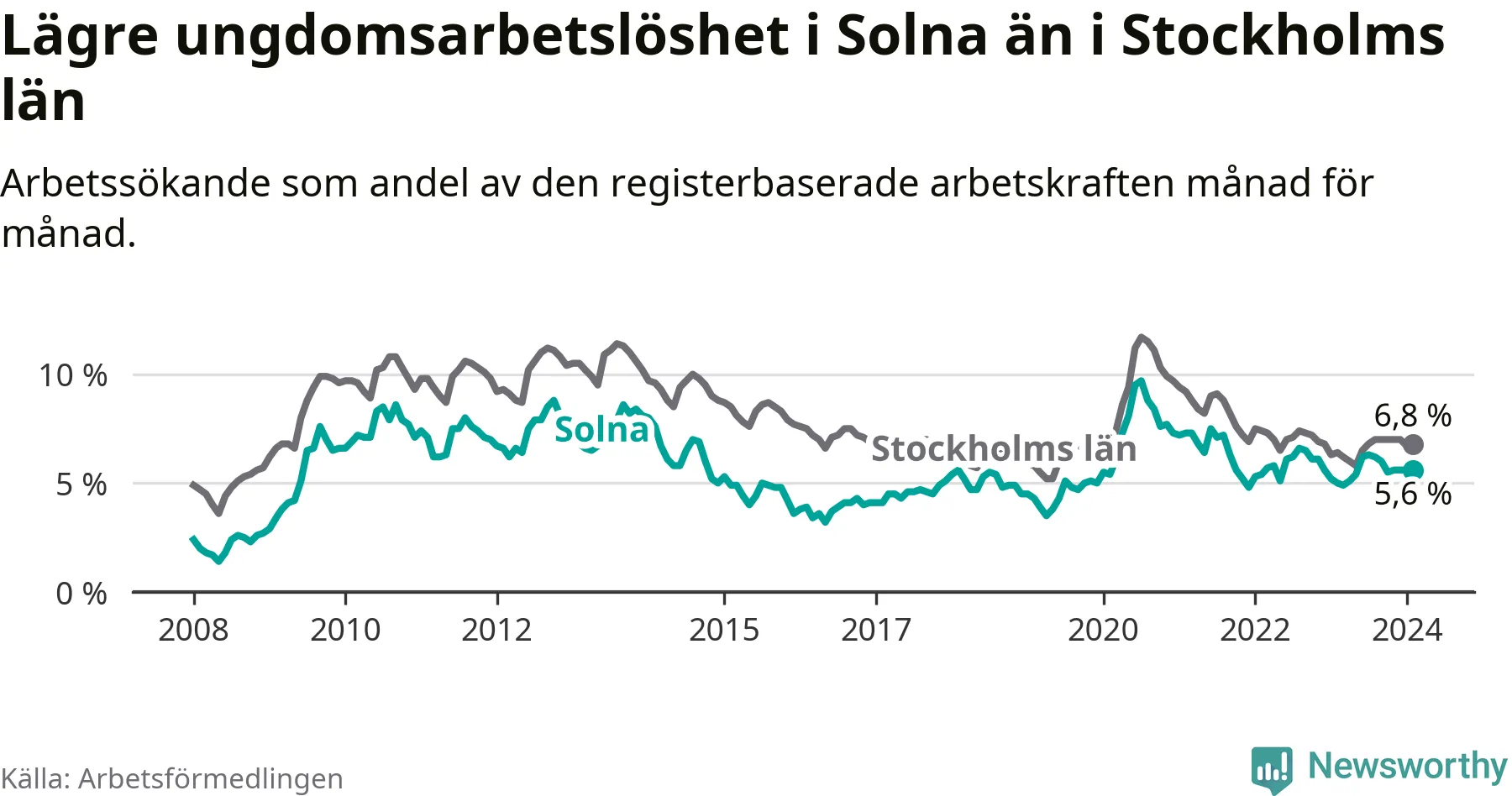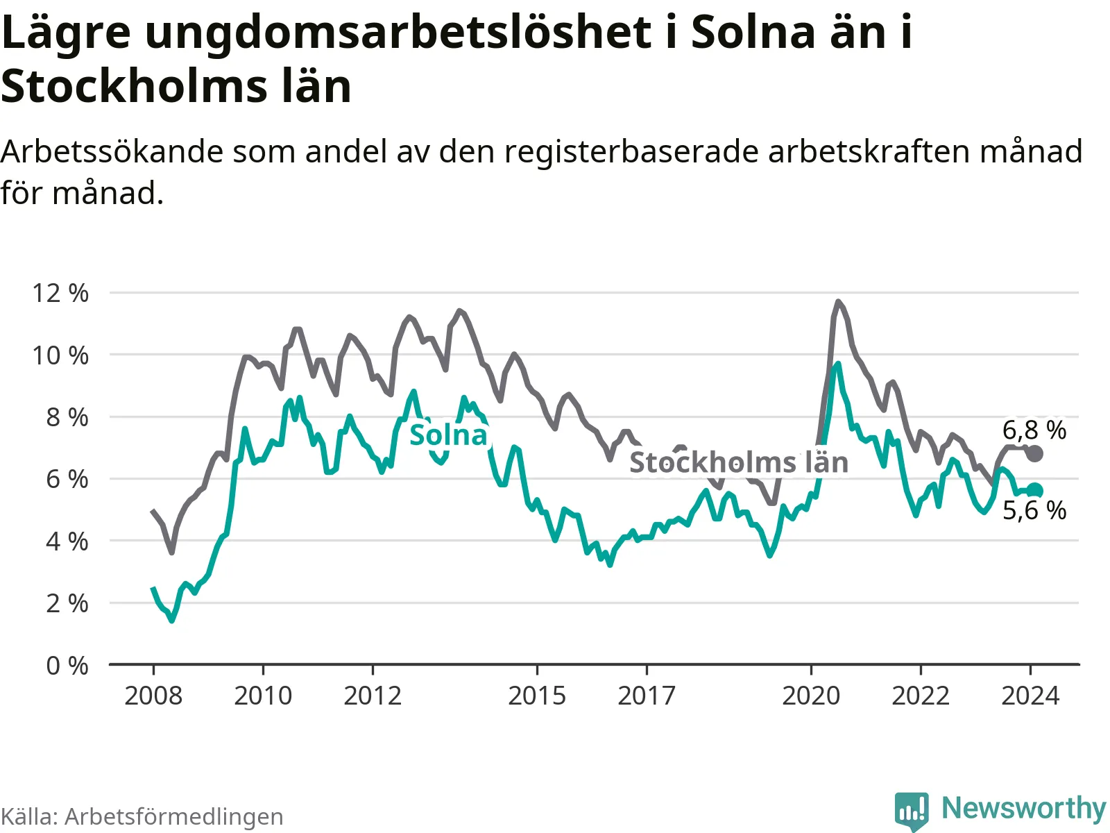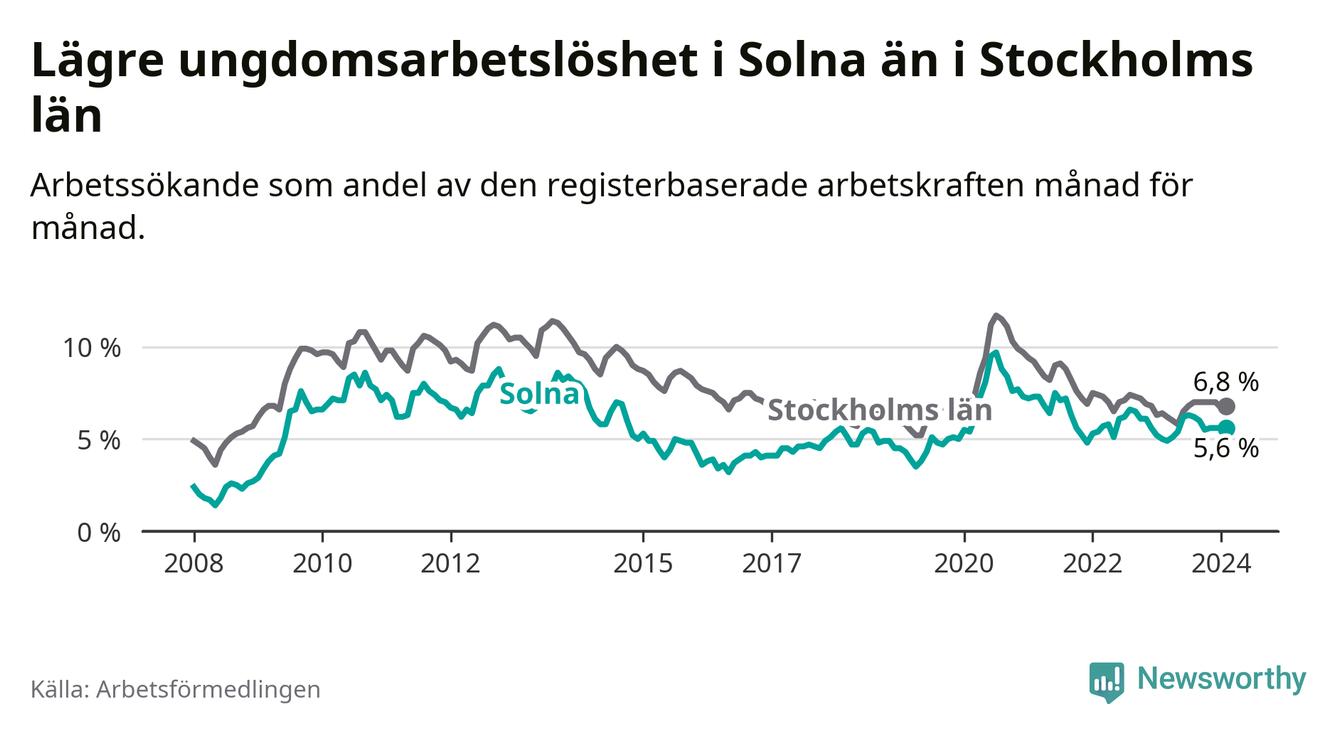 Precis som den totala arbetslösheten ligger ungdomsarbetslösheten i Solna lägre än i Stockholms län som helhet. Skillnaden mellan kommunen och länet är 1,2 procentenheter.