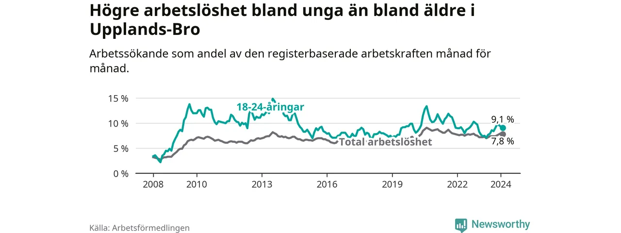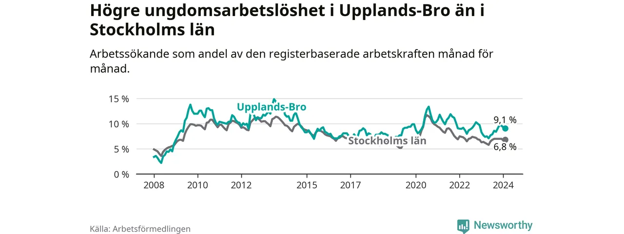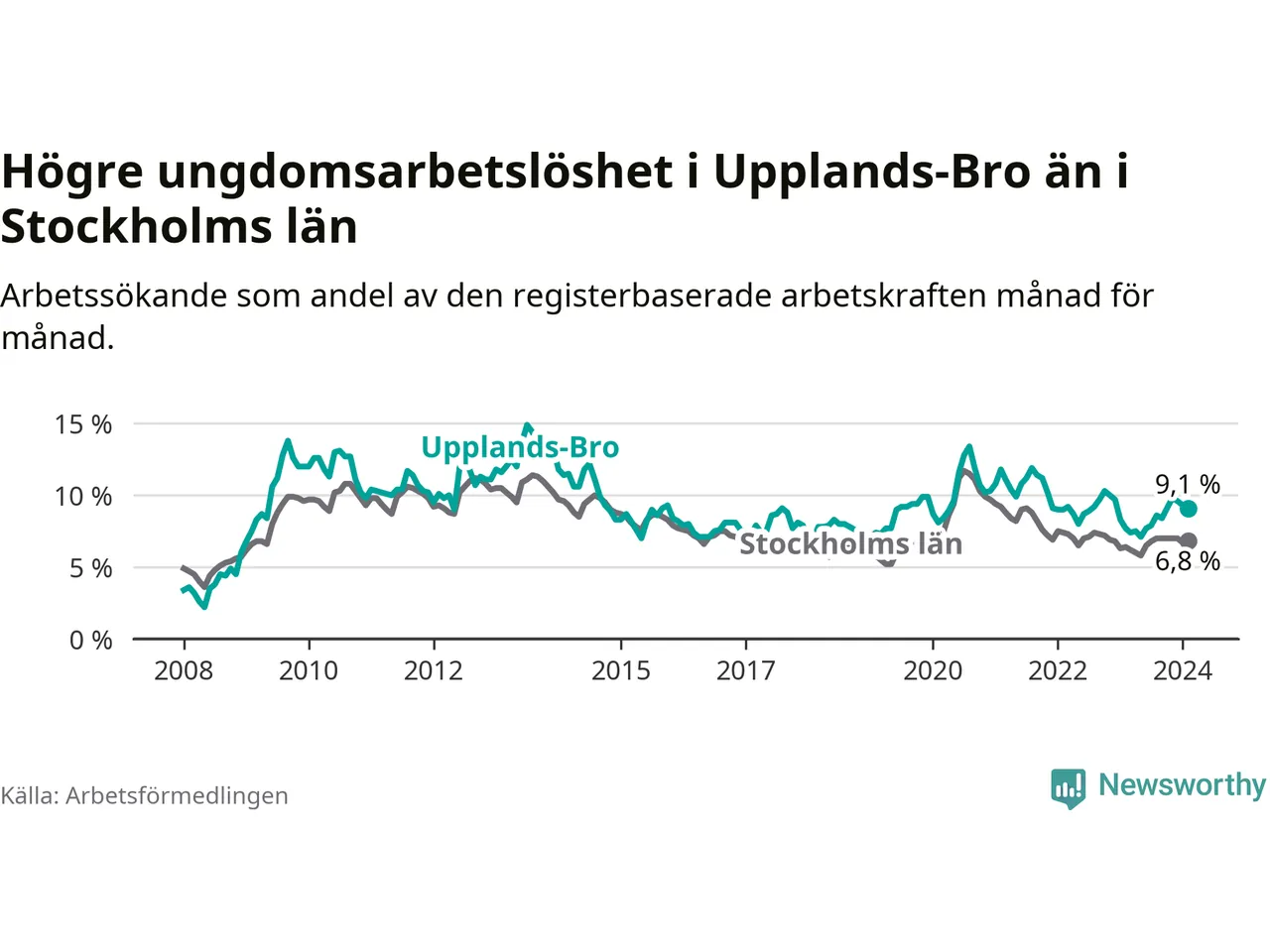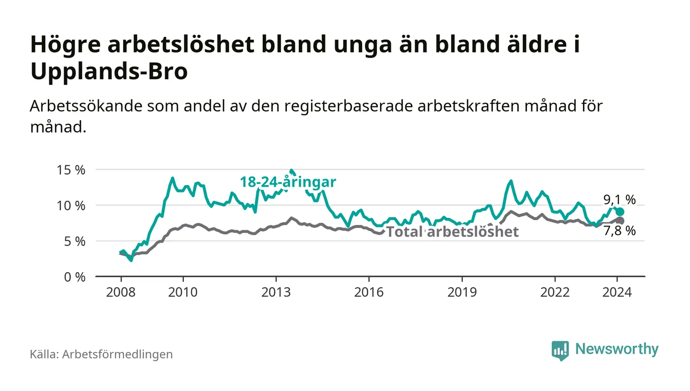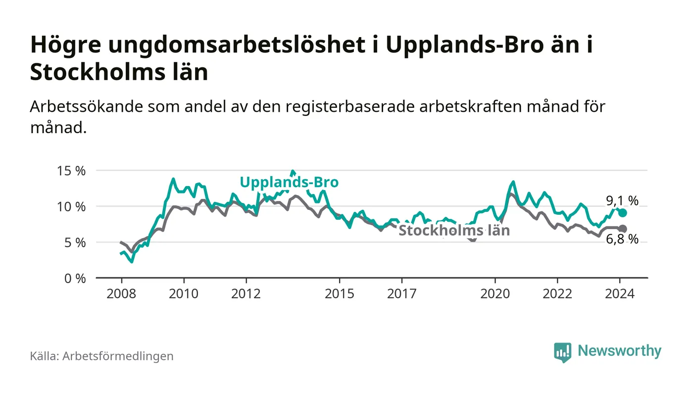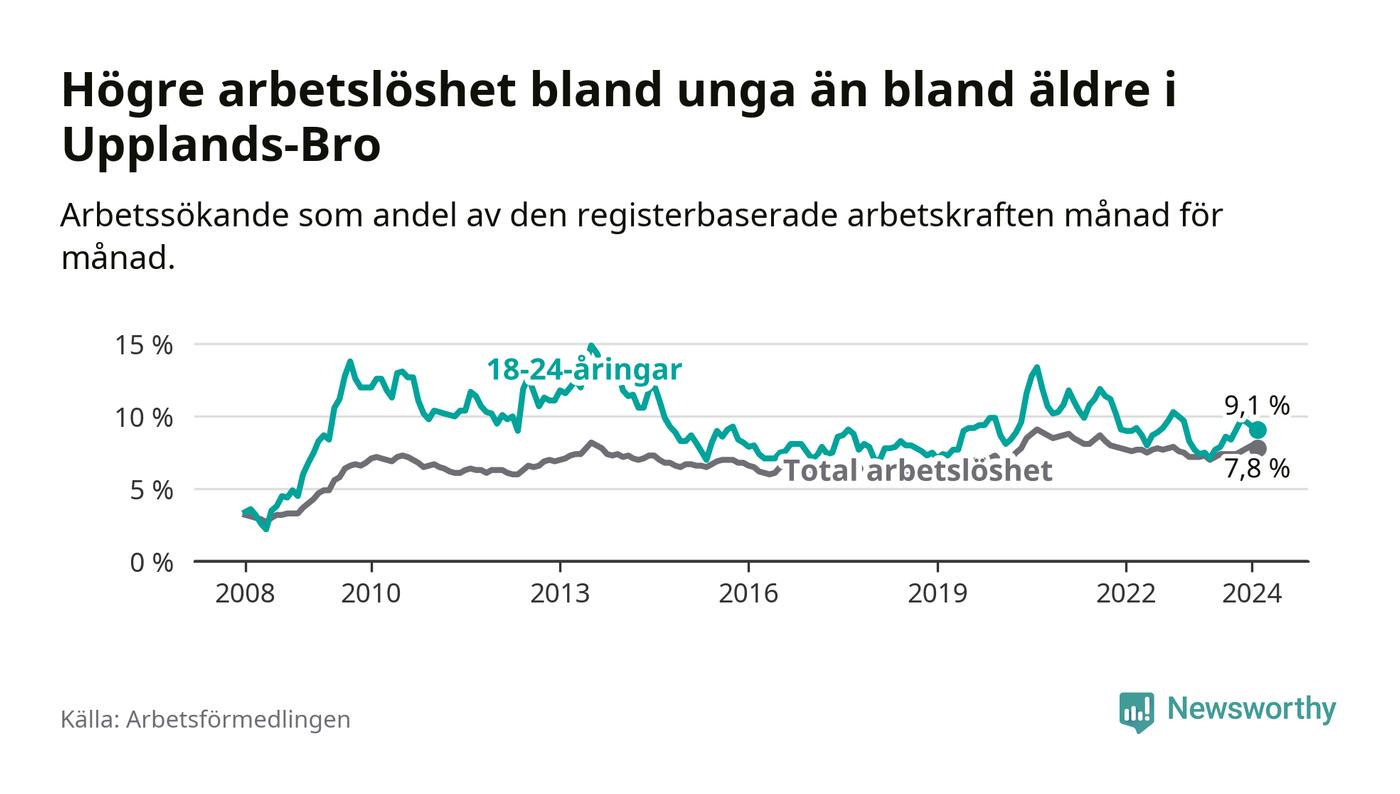 Den senaste månadsstatistiken från Arbetsförmedlingen visar på en uppgång i ungdomsarbetslöshet i Upplands-Bro kommun med 1,4 procentenheter. Arbetslösheten bland personer i åldern 18–24 år låg i februari på 9,1 procent.
