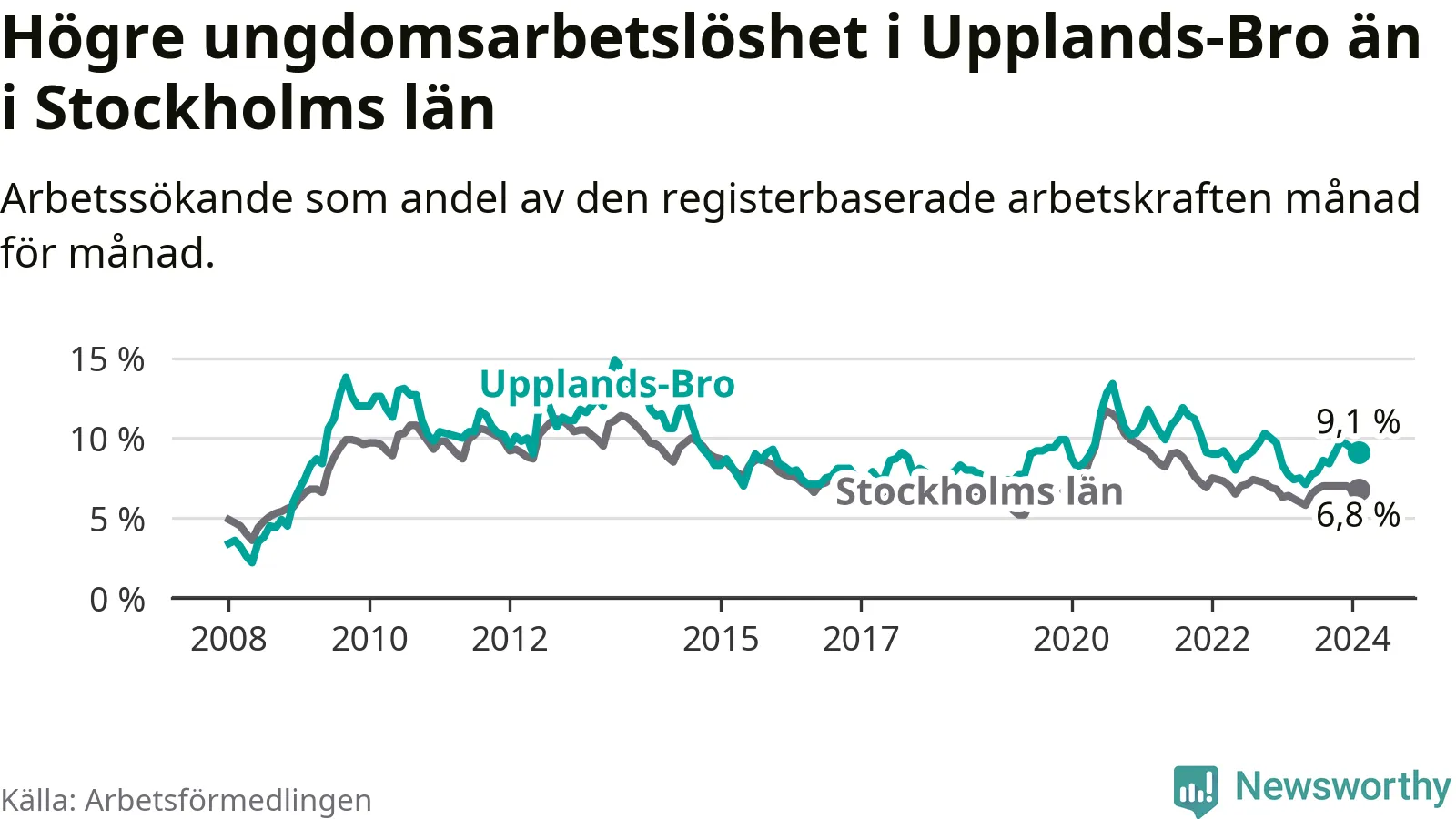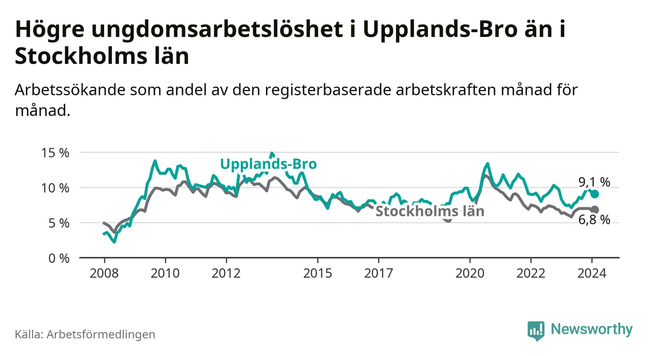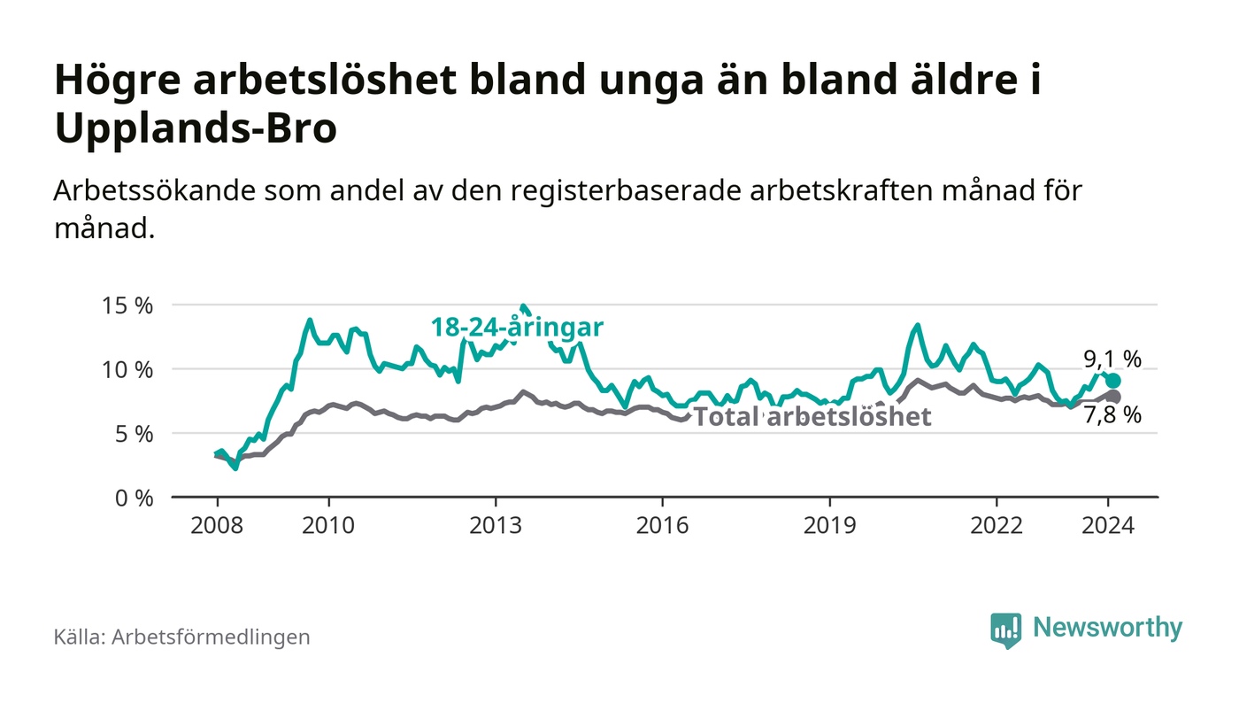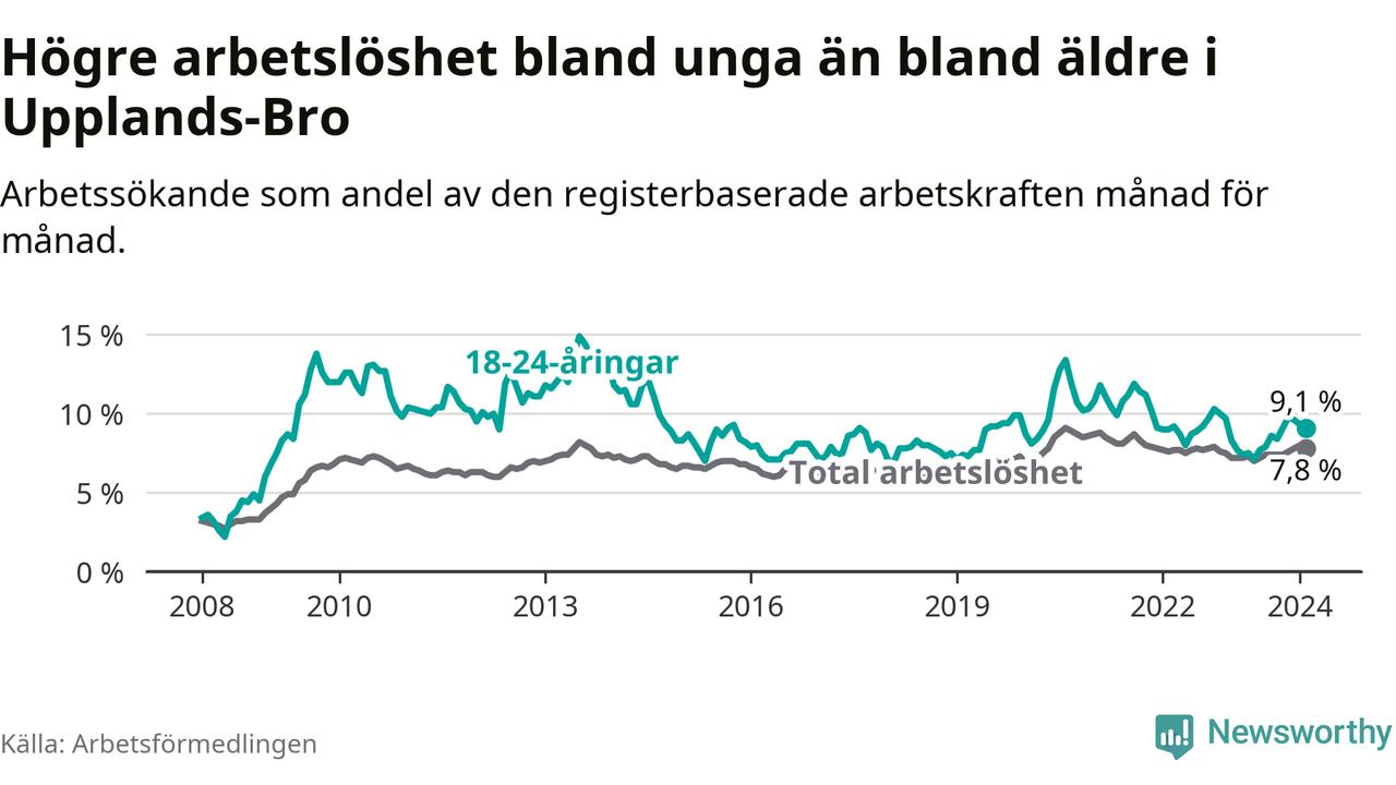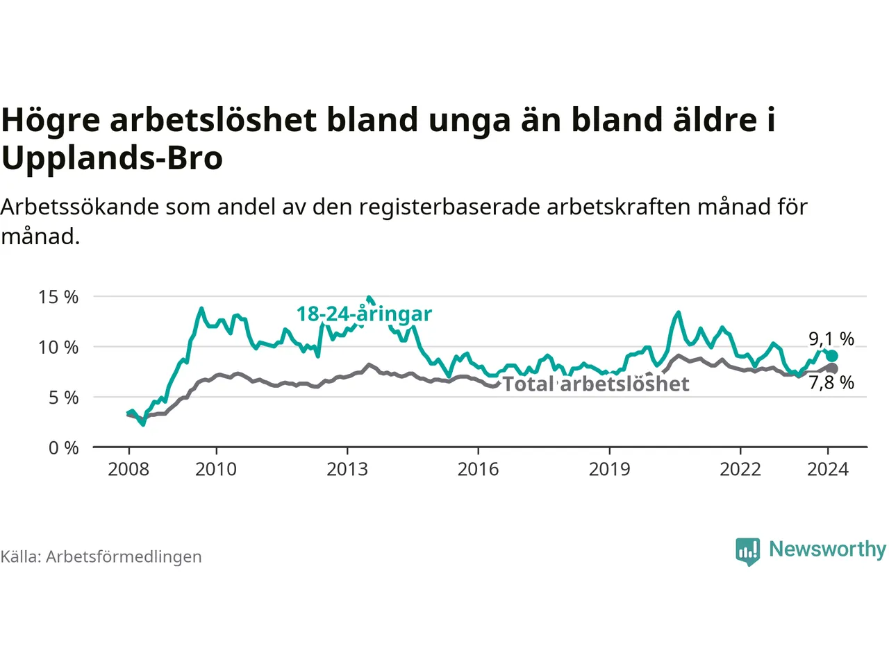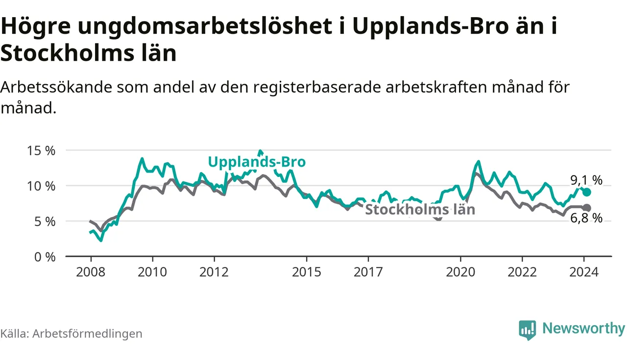 Den senaste månadsstatistiken från Arbetsförmedlingen visar på en uppgång i ungdomsarbetslöshet i Upplands-Bro kommun med 1,4 procentenheter. Arbetslösheten bland personer i åldern 18–24 år låg i februari på 9,1 procent.
