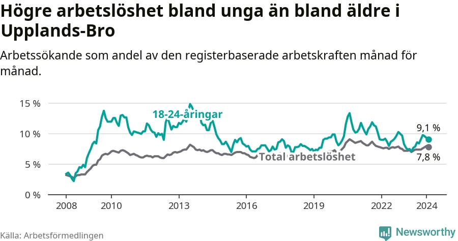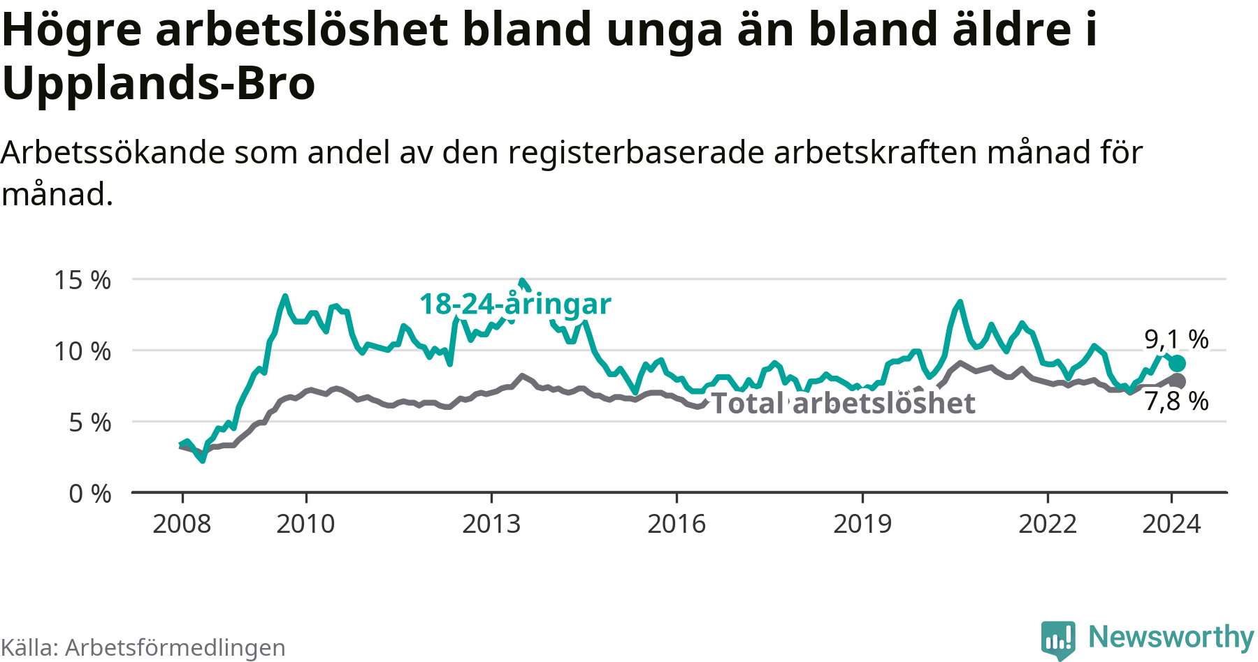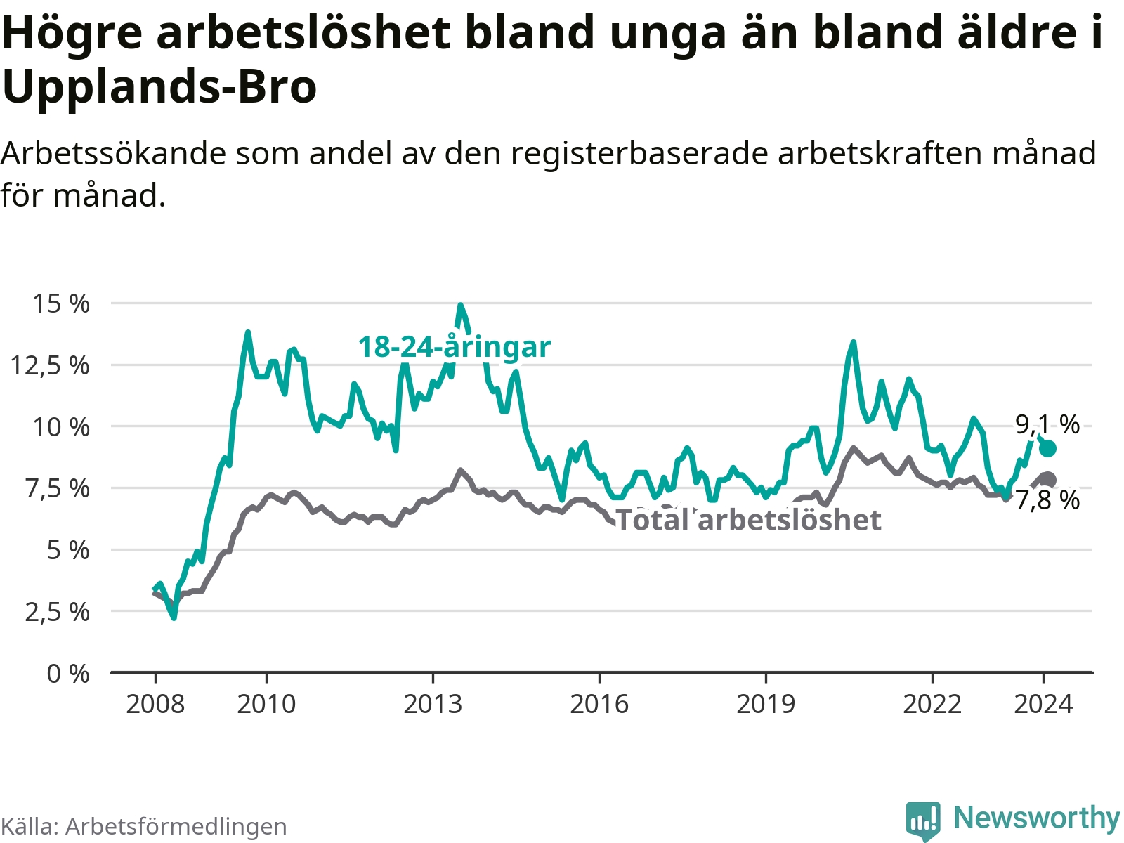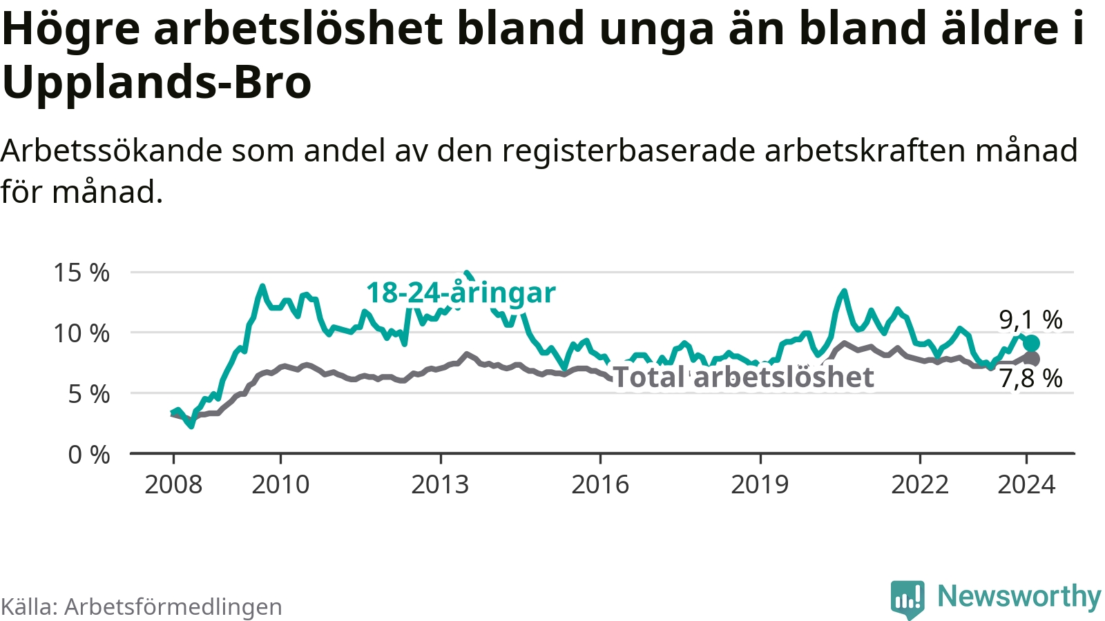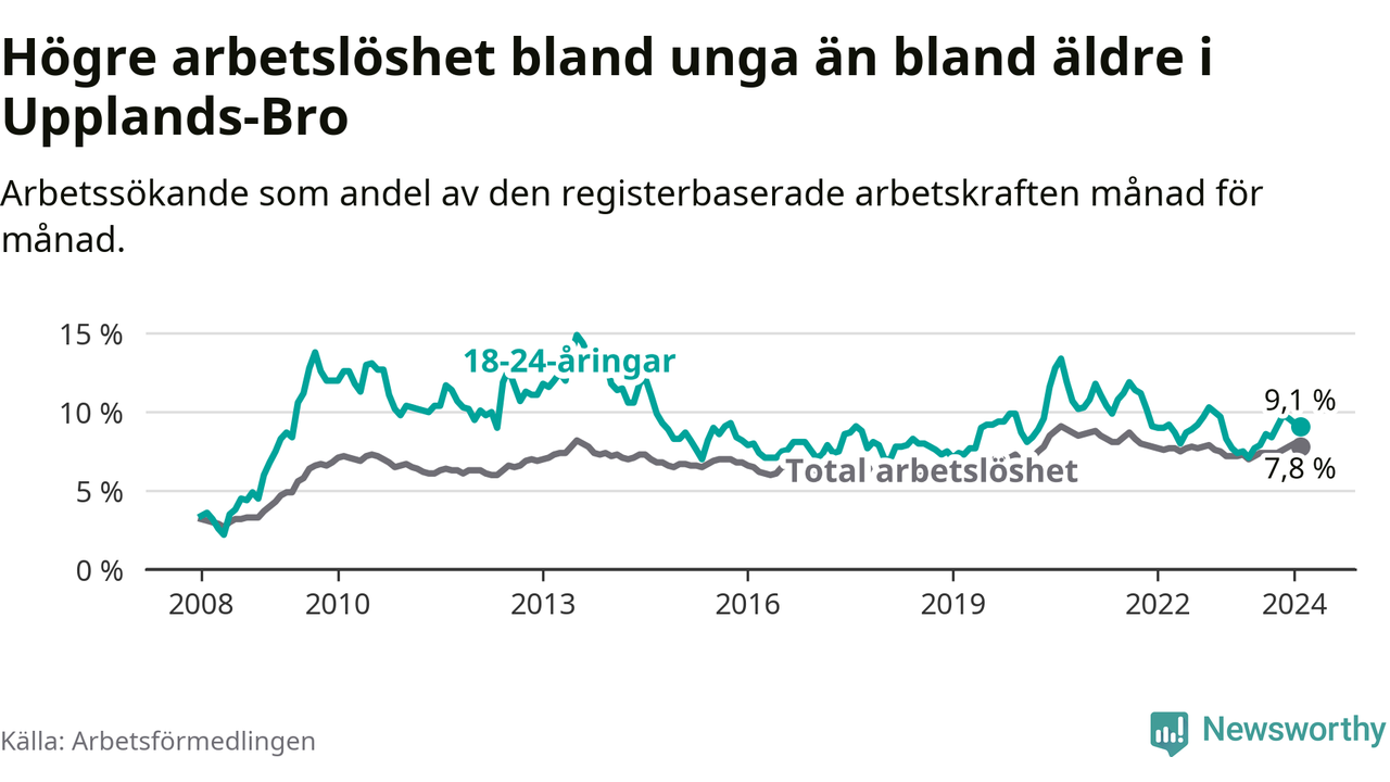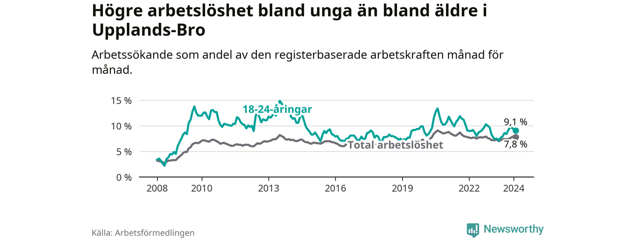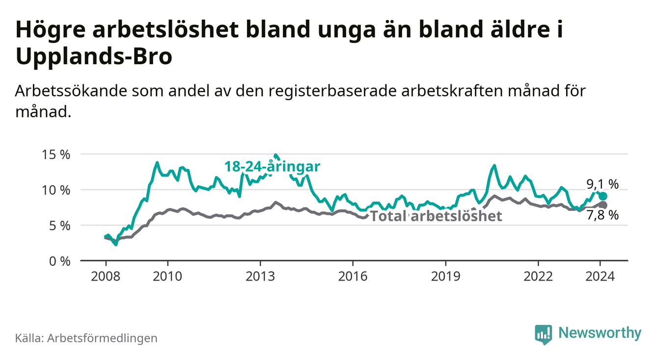 Den senaste månadsstatistiken från Arbetsförmedlingen visar på en uppgång i ungdomsarbetslöshet i Upplands-Bro kommun med 1,4 procentenheter. Arbetslösheten bland personer i åldern 18–24 år låg i februari på 9,1 procent.
