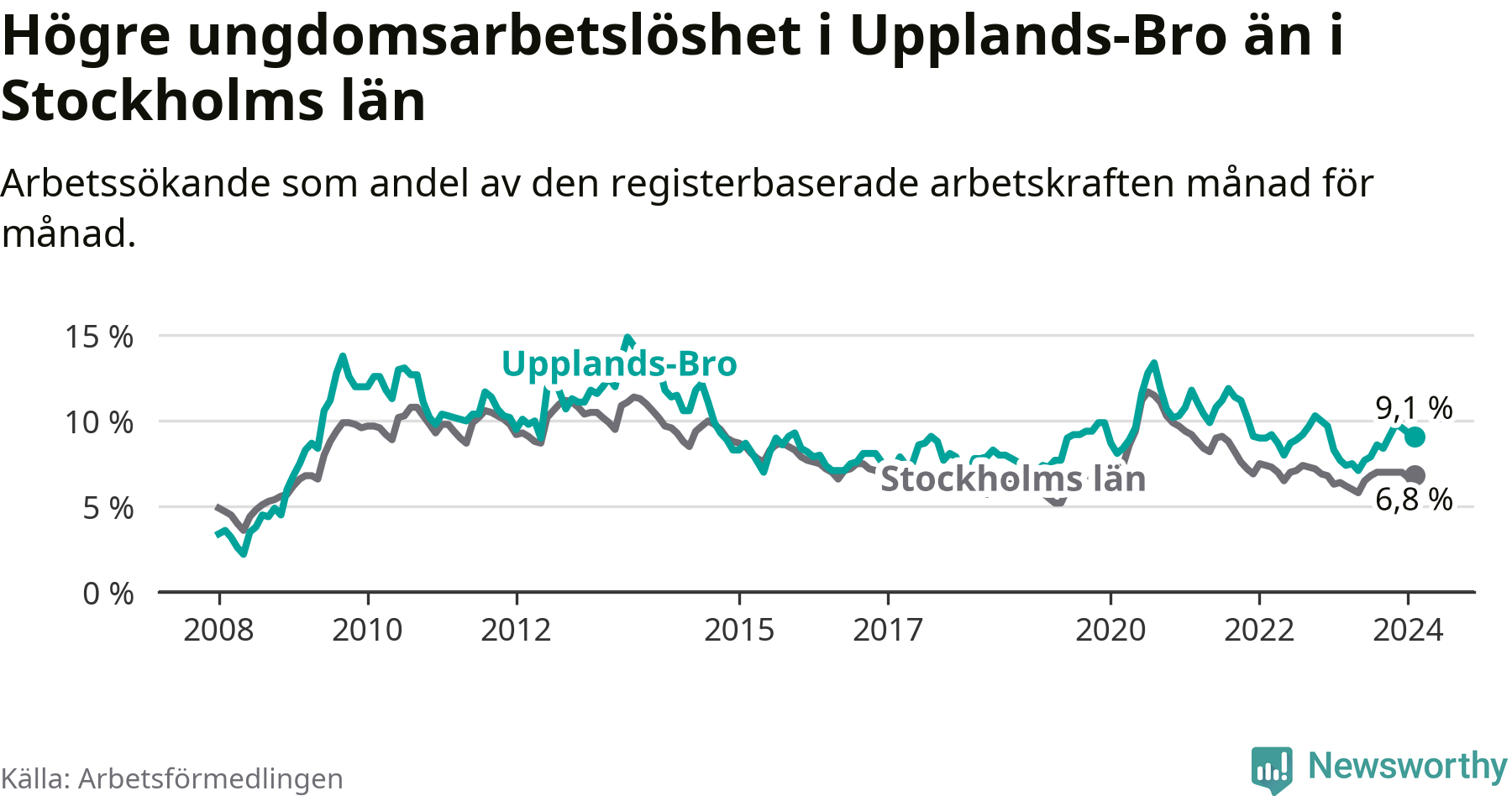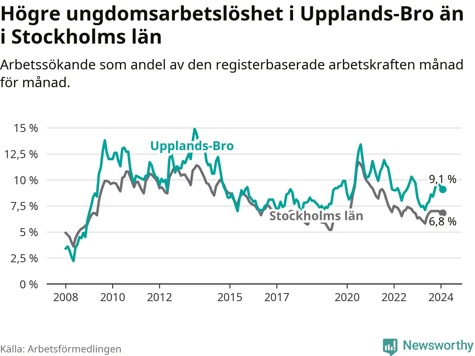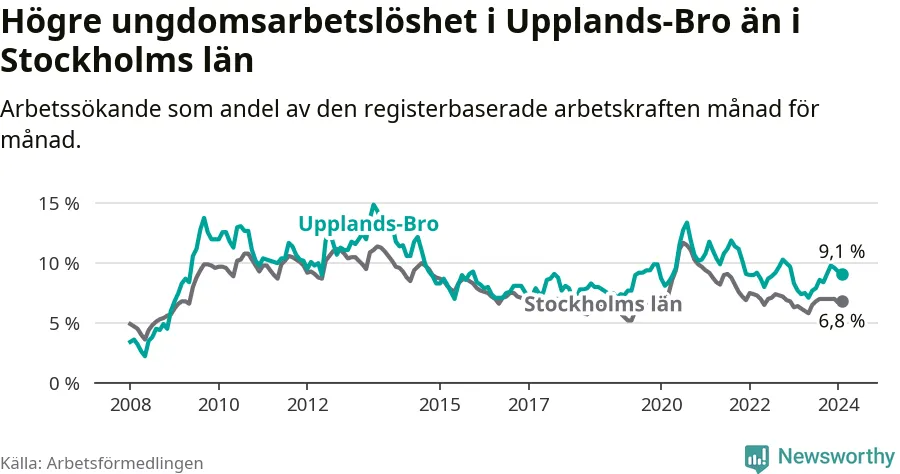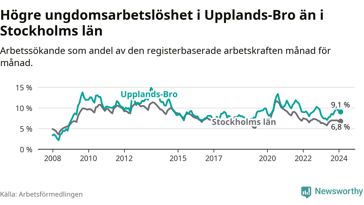 Precis som den totala arbetslösheten ligger ungdomsarbetslösheten i Upplands-Bro högre än i Stockholms län som helhet. Skillnaden mellan kommunen och länet är 2,3 procentenheter.