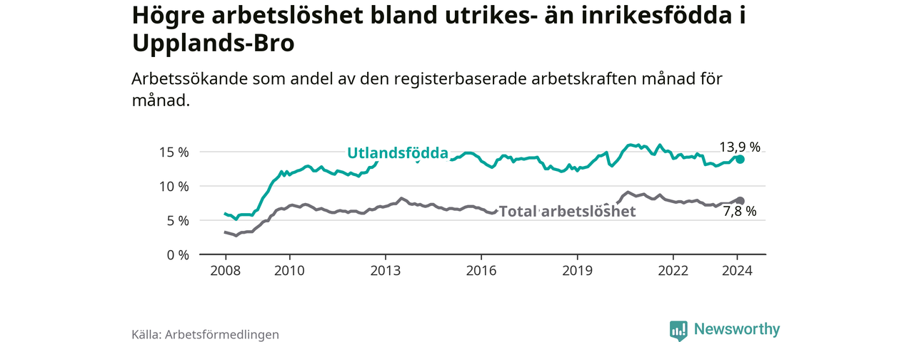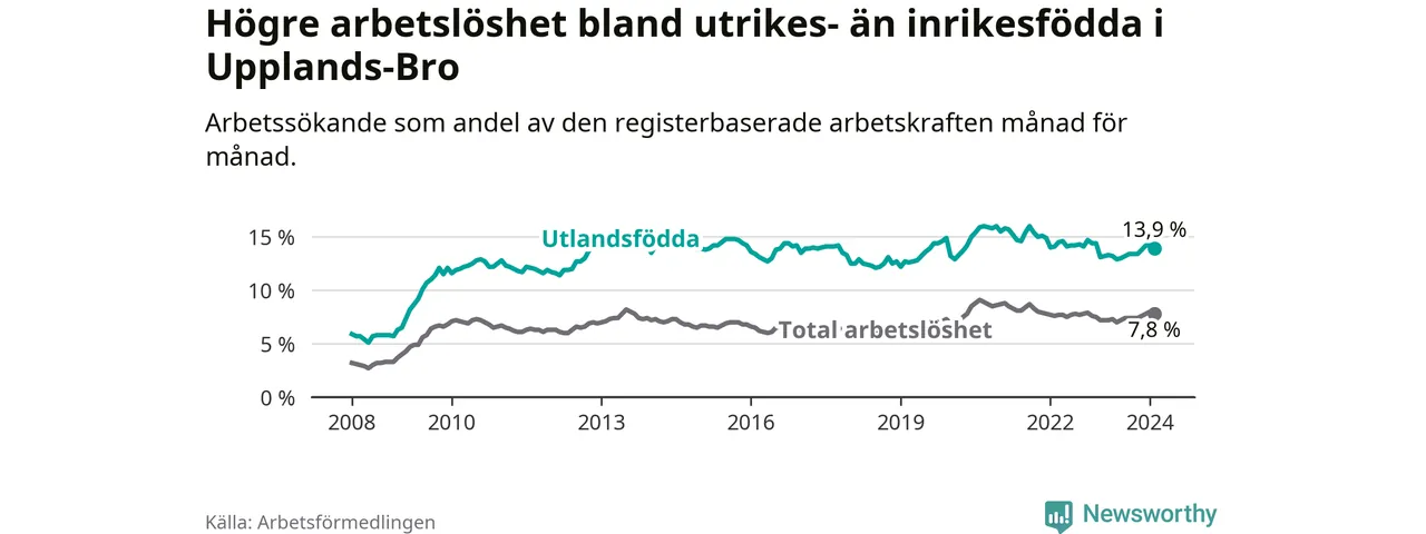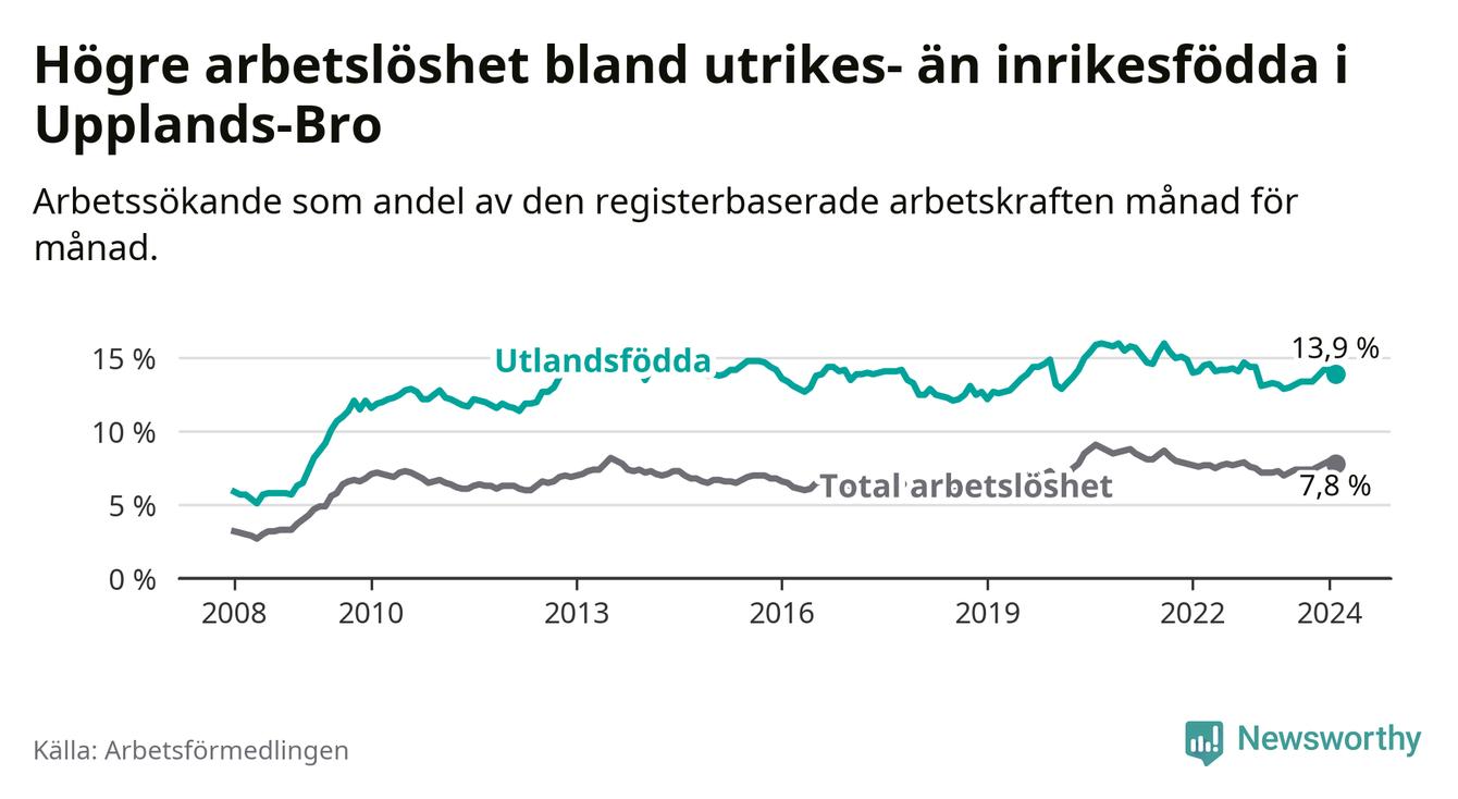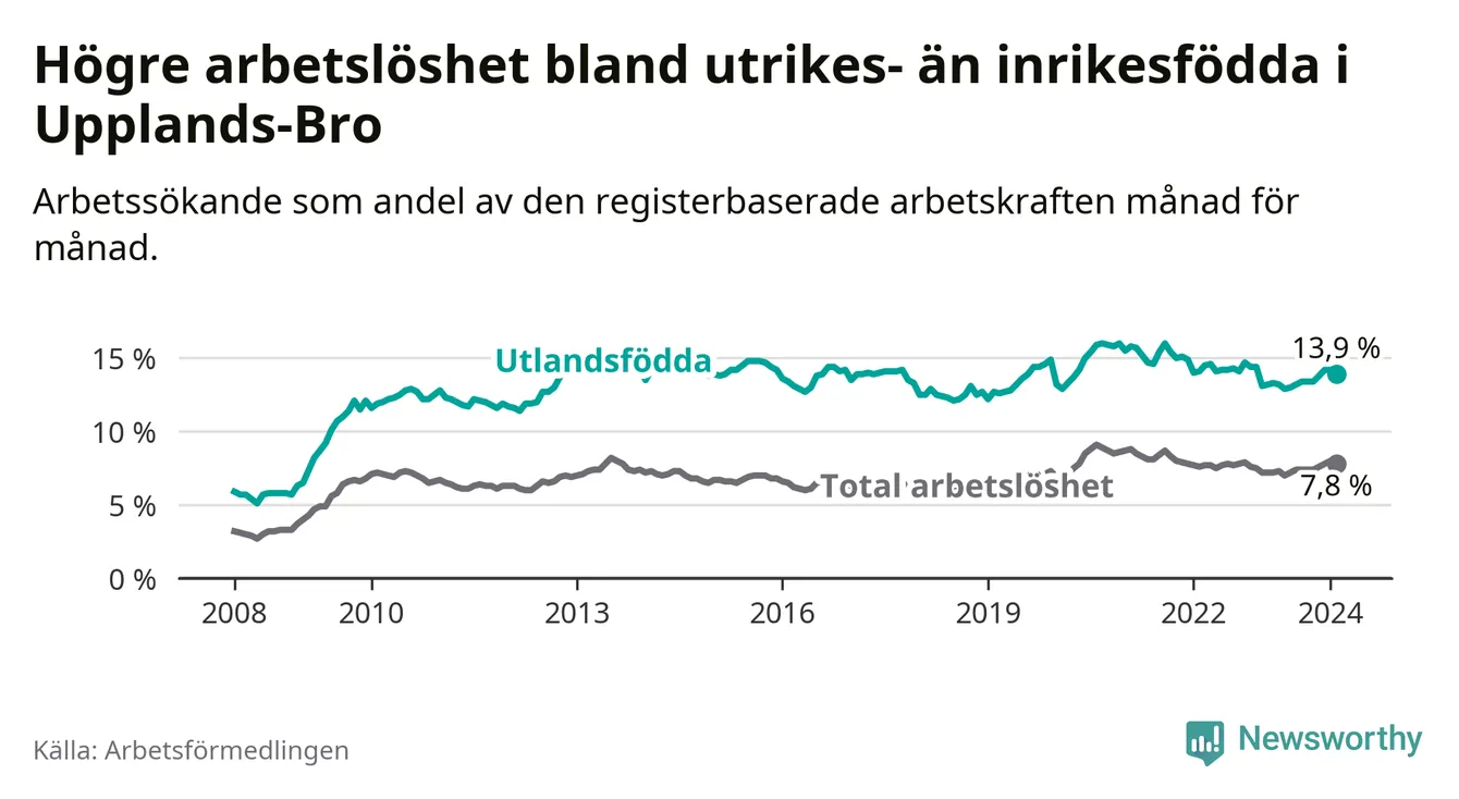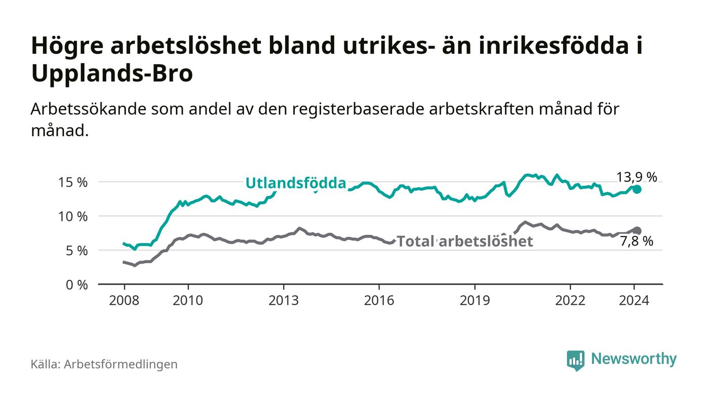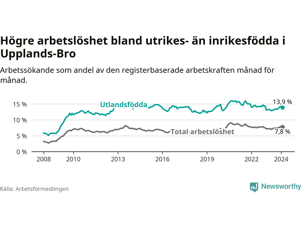 Arbetslösheten bland utlandsfödda var 13,9 procent i Upplands-Bro under februari månad, motsvarande 14 av 101 personer. Det är 0,7 procentenheter fler än vid samma tidpunkt i fjol (−822 om man räknar personer).