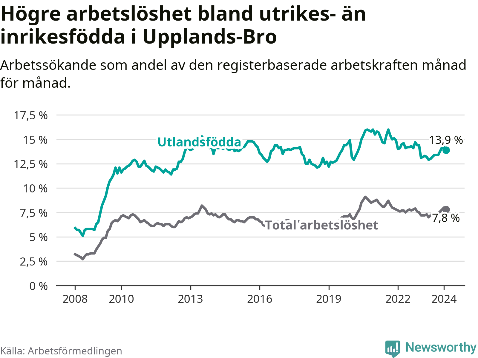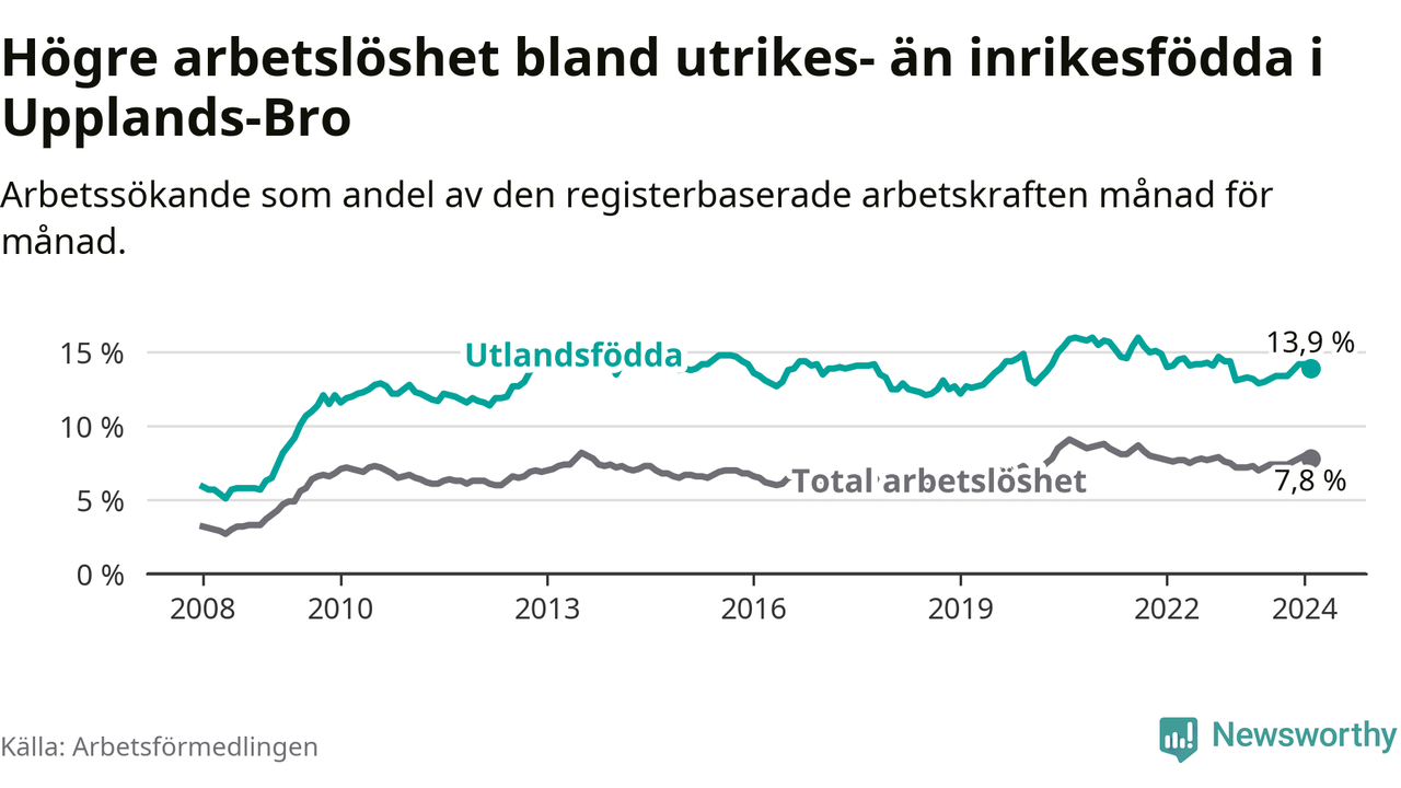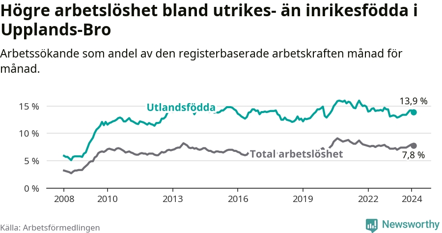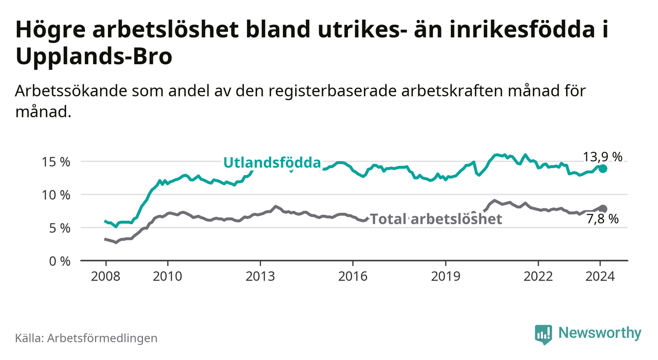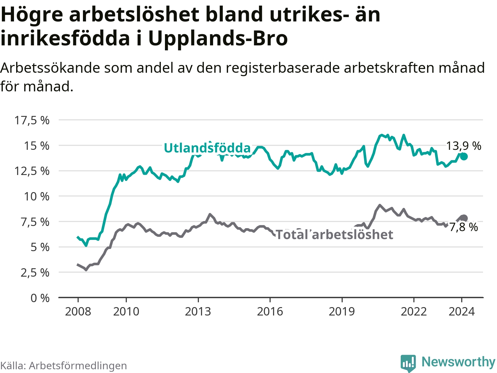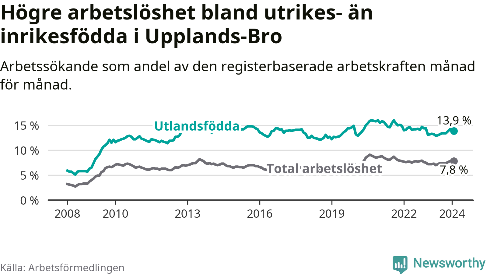 Arbetslösheten bland utlandsfödda var 13,9 procent i Upplands-Bro under februari månad, motsvarande 14 av 101 personer. Det är 0,7 procentenheter fler än vid samma tidpunkt i fjol (−822 om man räknar personer).