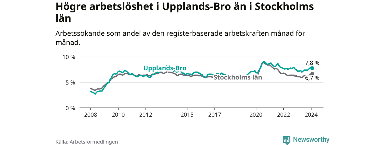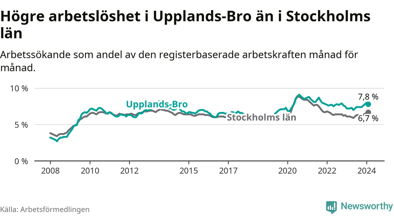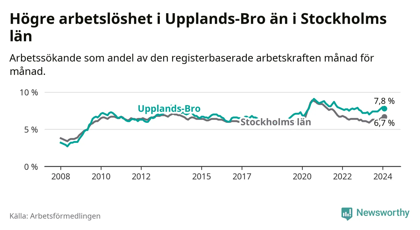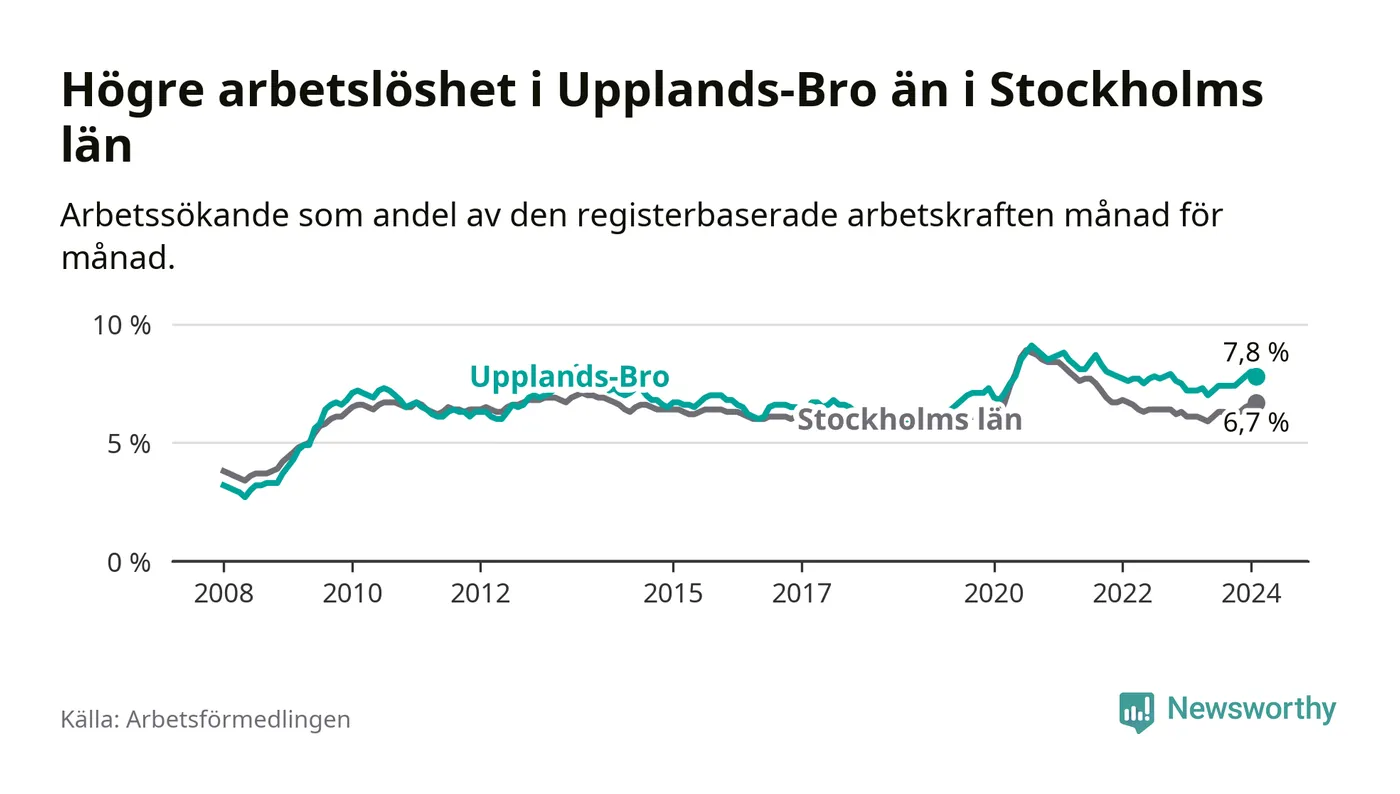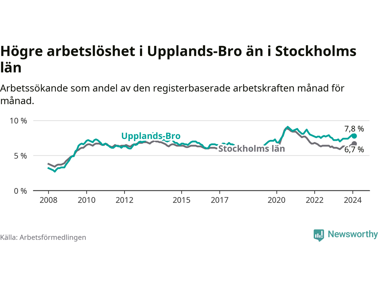 Upplands-Bro hade redan tidigare högre arbetslöshet än snittet i hela Stockholms län och nu växer klyftan (7,8 procent i kommunen, jämfört med 6,7 procent i hela länet). Ekerö har den lägsta arbetslösheten i länet (3,5 procent), medan Botkyrka har den högsta (11,1 procent).