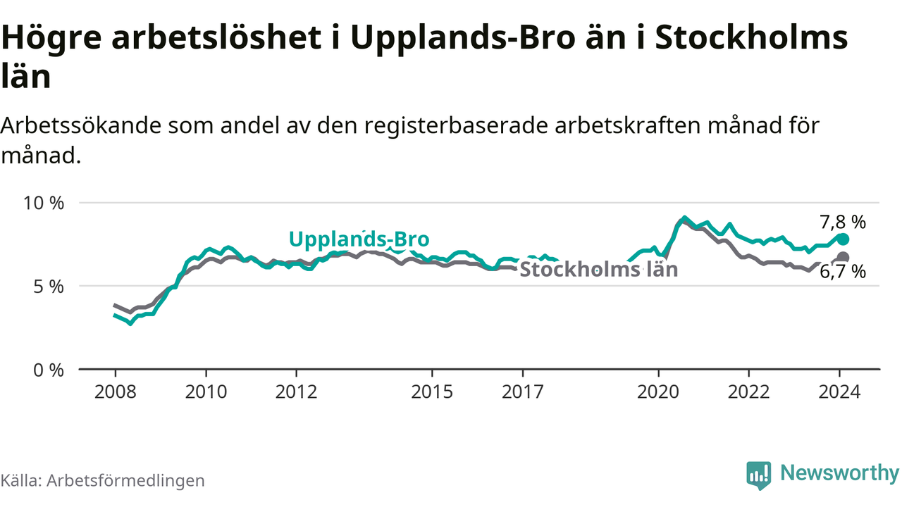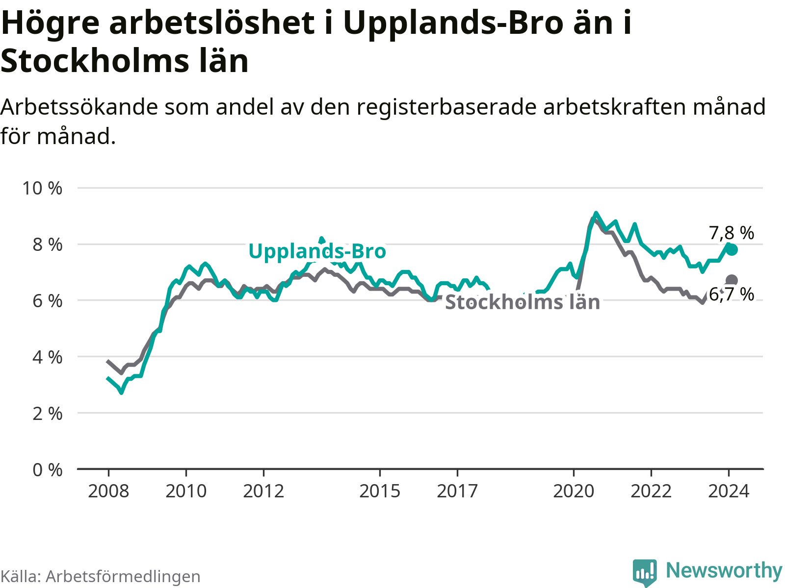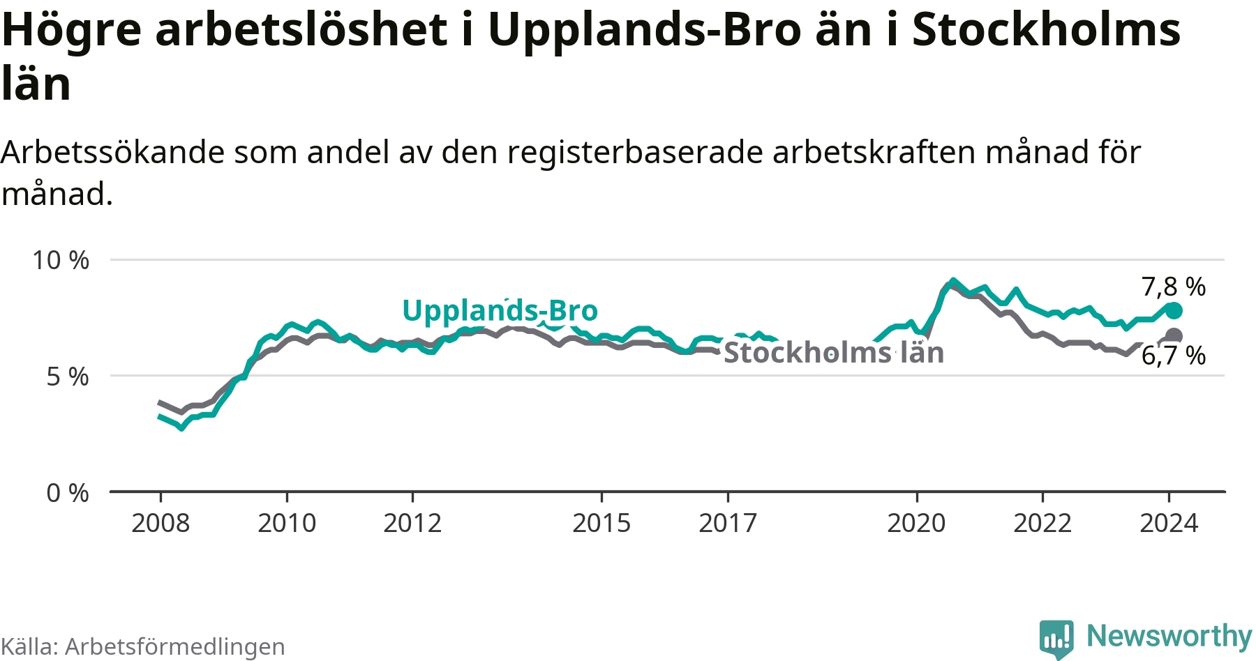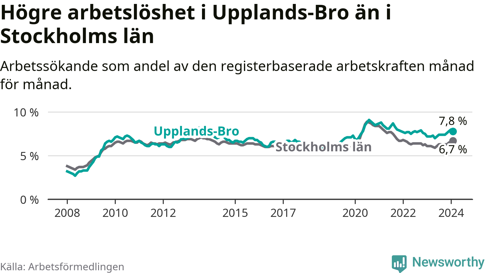 Upplands-Bro hade redan tidigare högre arbetslöshet än snittet i hela Stockholms län och nu växer klyftan (7,8 procent i kommunen, jämfört med 6,7 procent i hela länet). Ekerö har den lägsta arbetslösheten i länet (3,5 procent), medan Botkyrka har den högsta (11,1 procent).