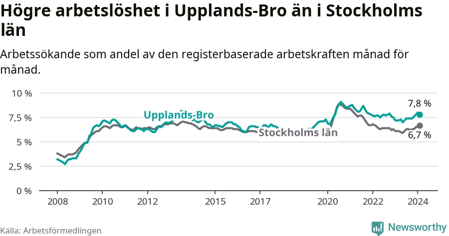 Under februari månad rapporterade Upplands-Bro kommun en total arbetslöshet på 7,8 procent. Det är en ökning jämfört med samma tidpunkt i fjol (+0,6 procentenheter). Även i Stockholms län stiger arbetslösheten .