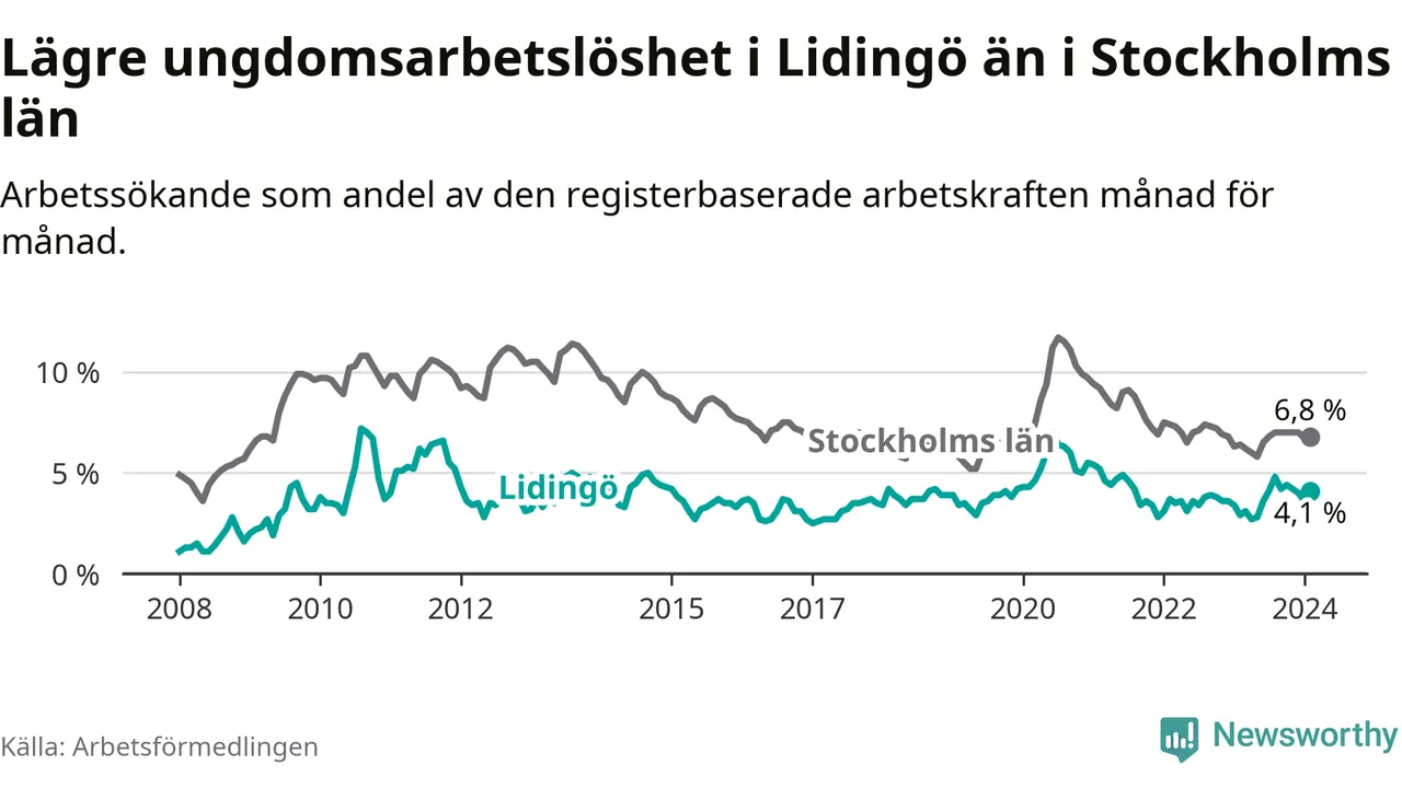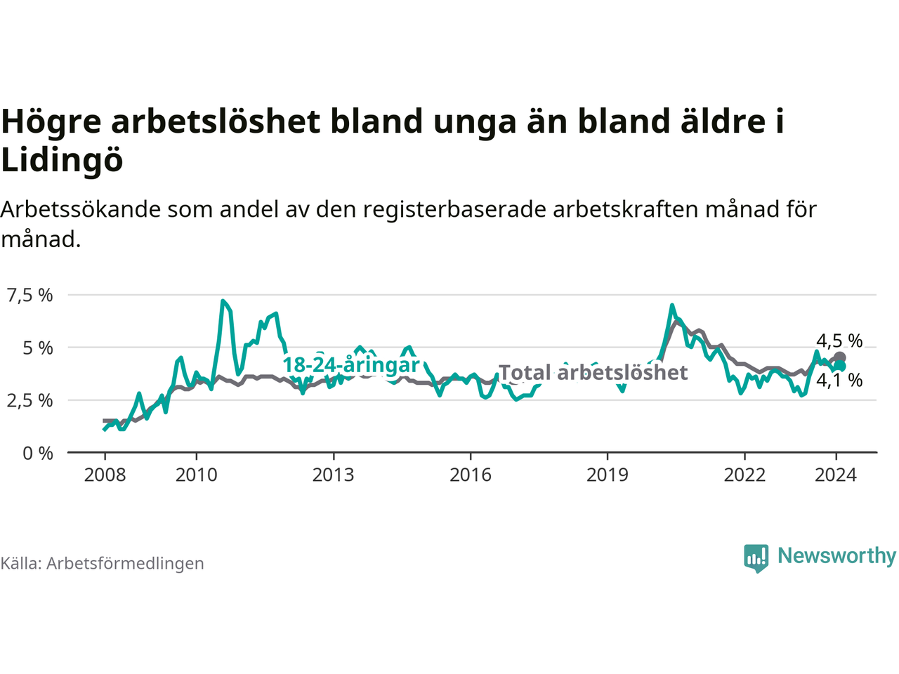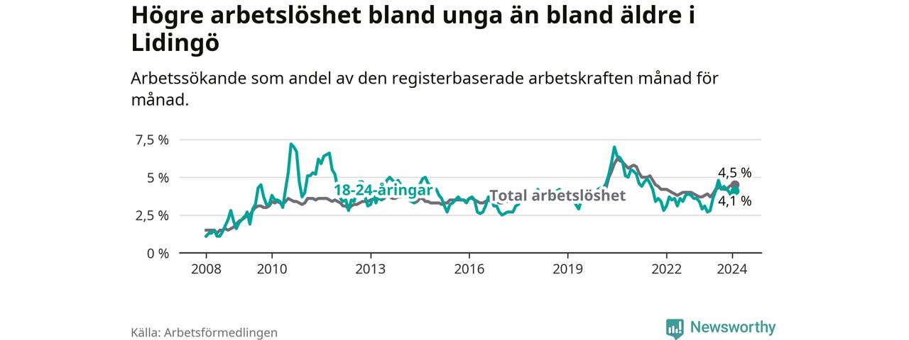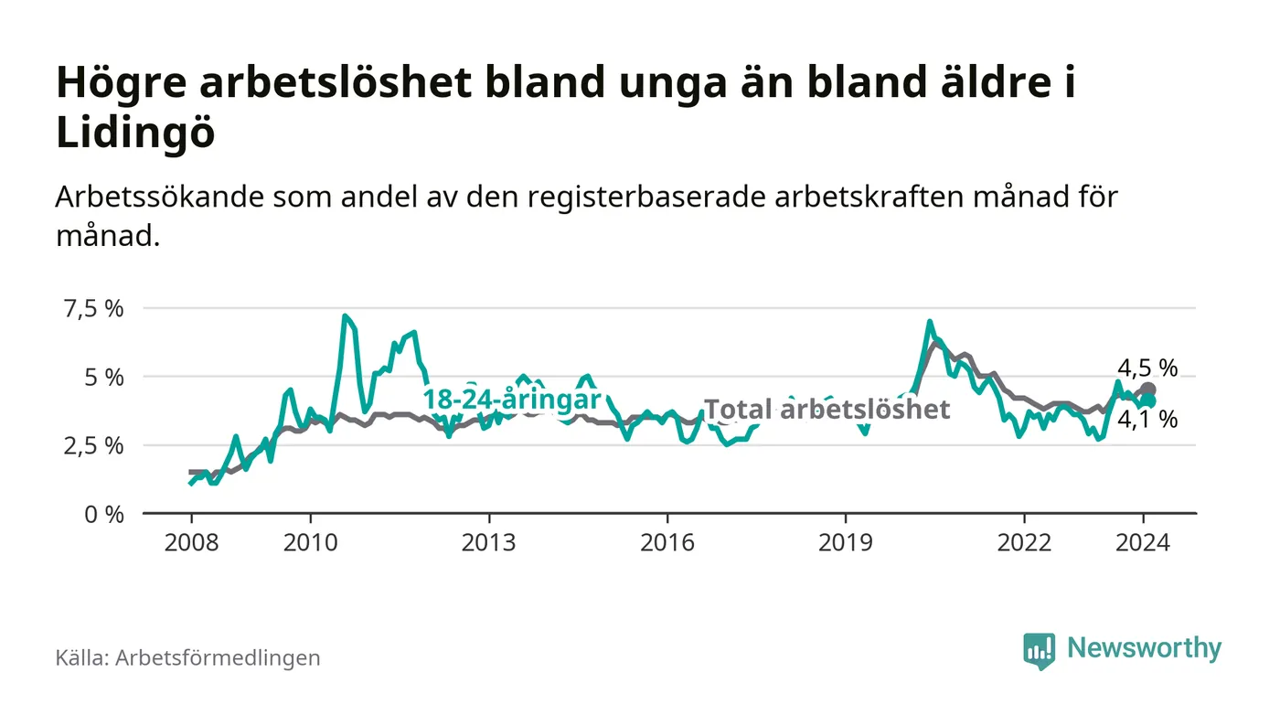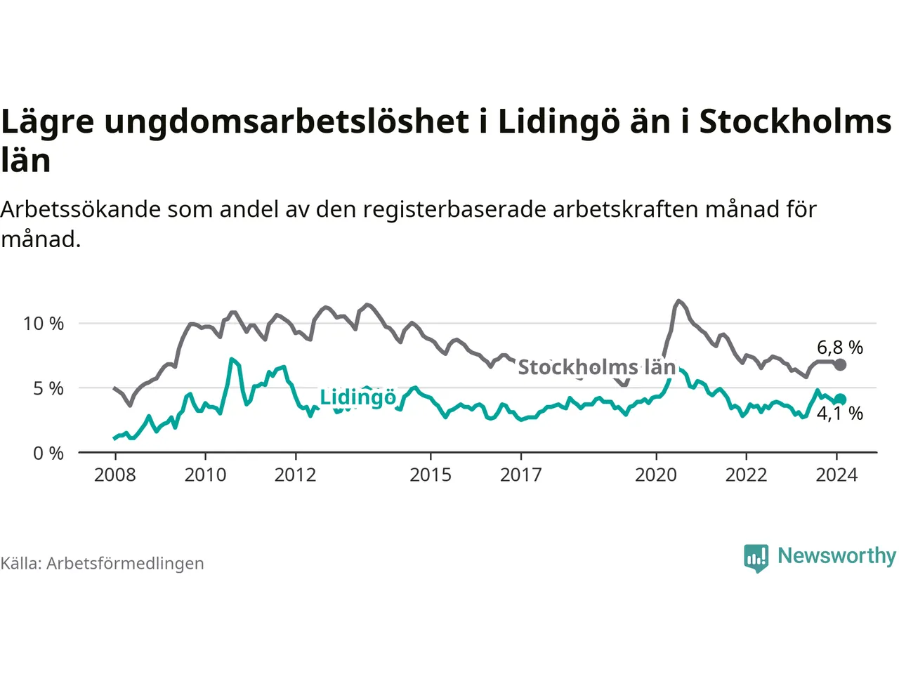 Den senaste månadsstatistiken från Arbetsförmedlingen visar på en uppgång i ungdomsarbetslöshet i Lidingö kommun med 1,2 procentenheter. Arbetslösheten bland personer i åldern 18–24 år låg i februari på 4,1 procent.
