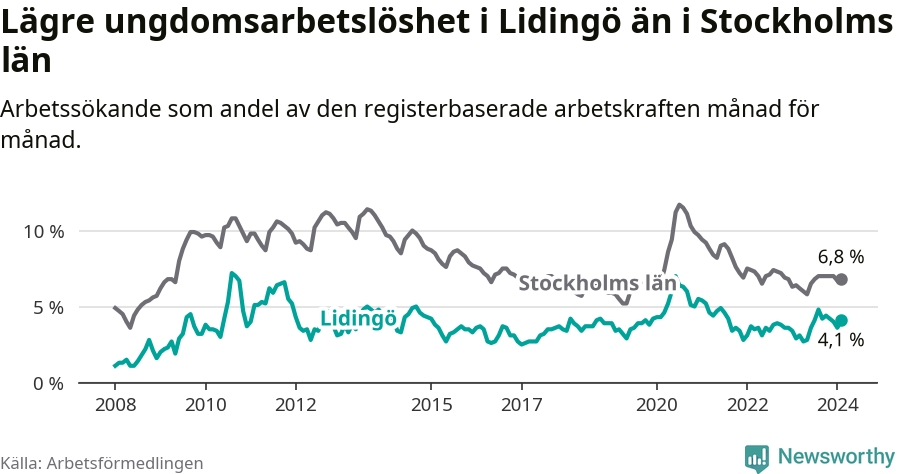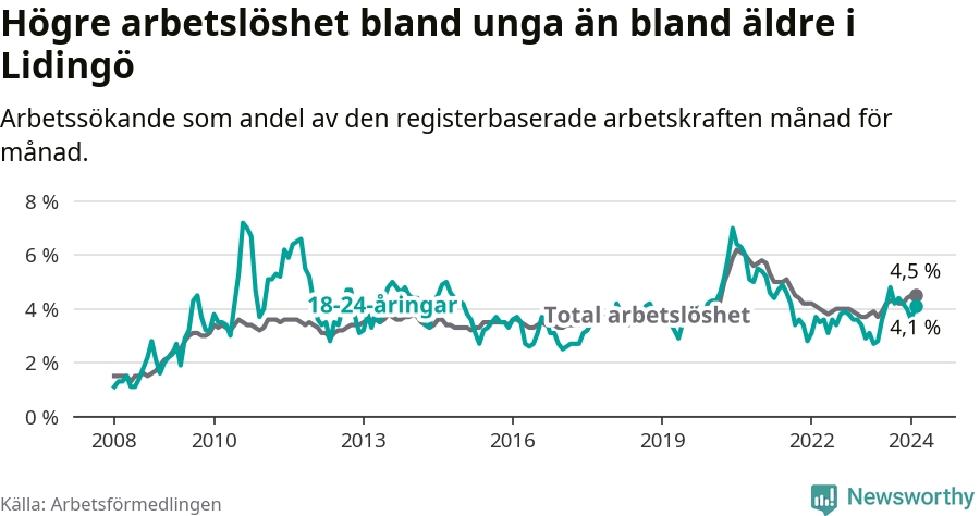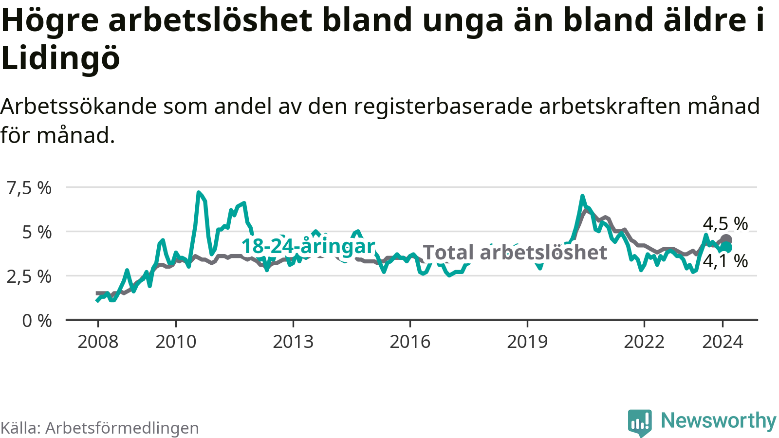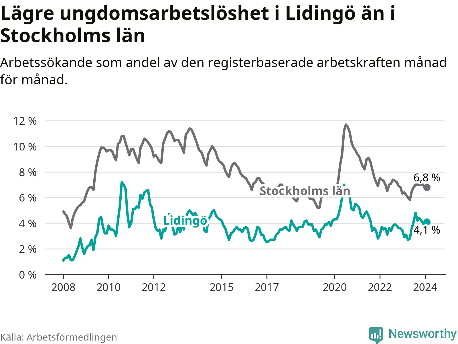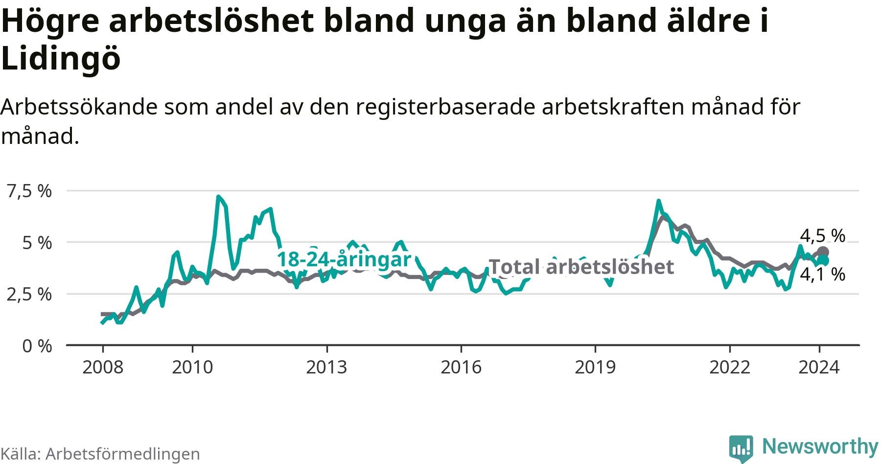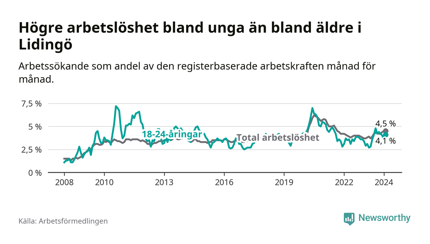 Den senaste månadsstatistiken från Arbetsförmedlingen visar på en uppgång i ungdomsarbetslöshet i Lidingö kommun med 1,2 procentenheter. Arbetslösheten bland personer i åldern 18–24 år låg i februari på 4,1 procent.