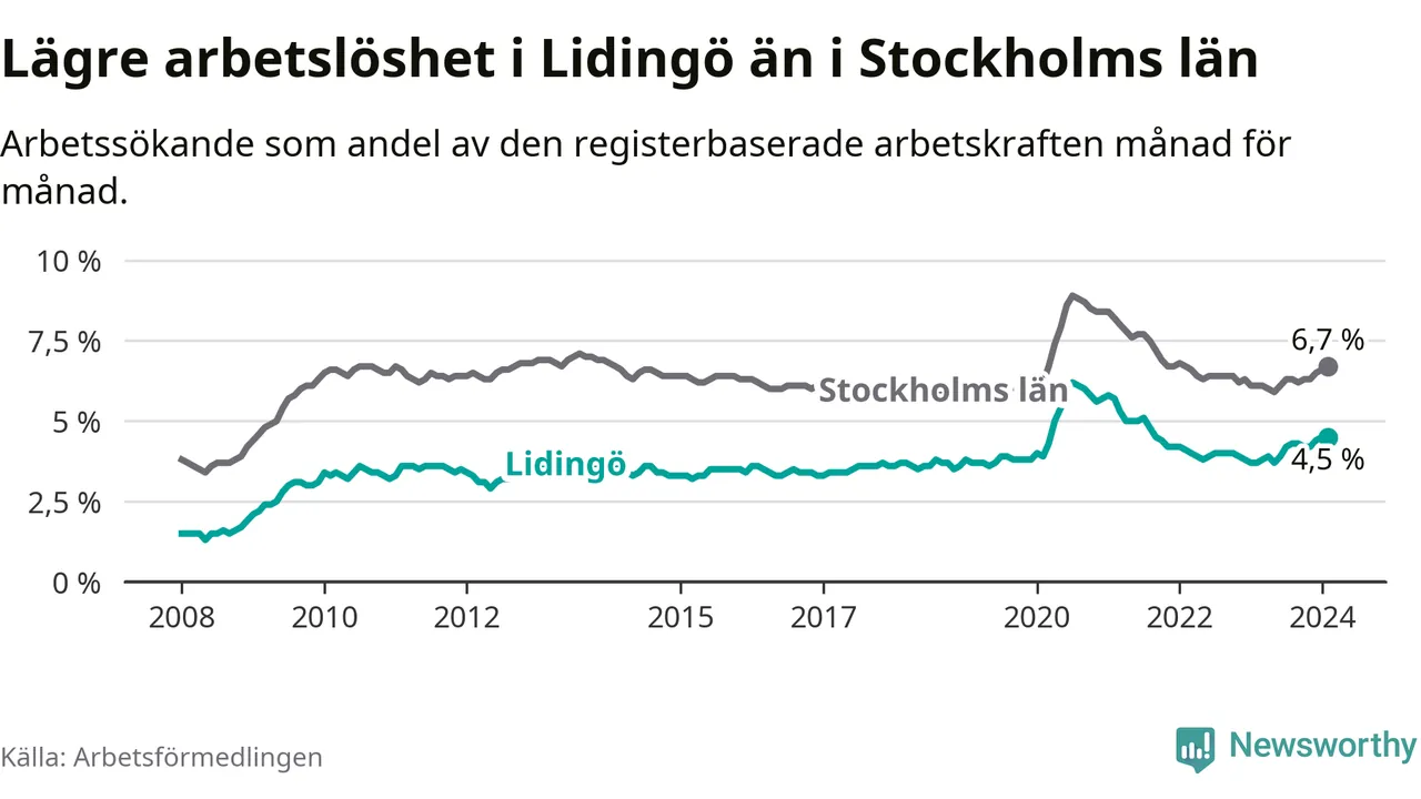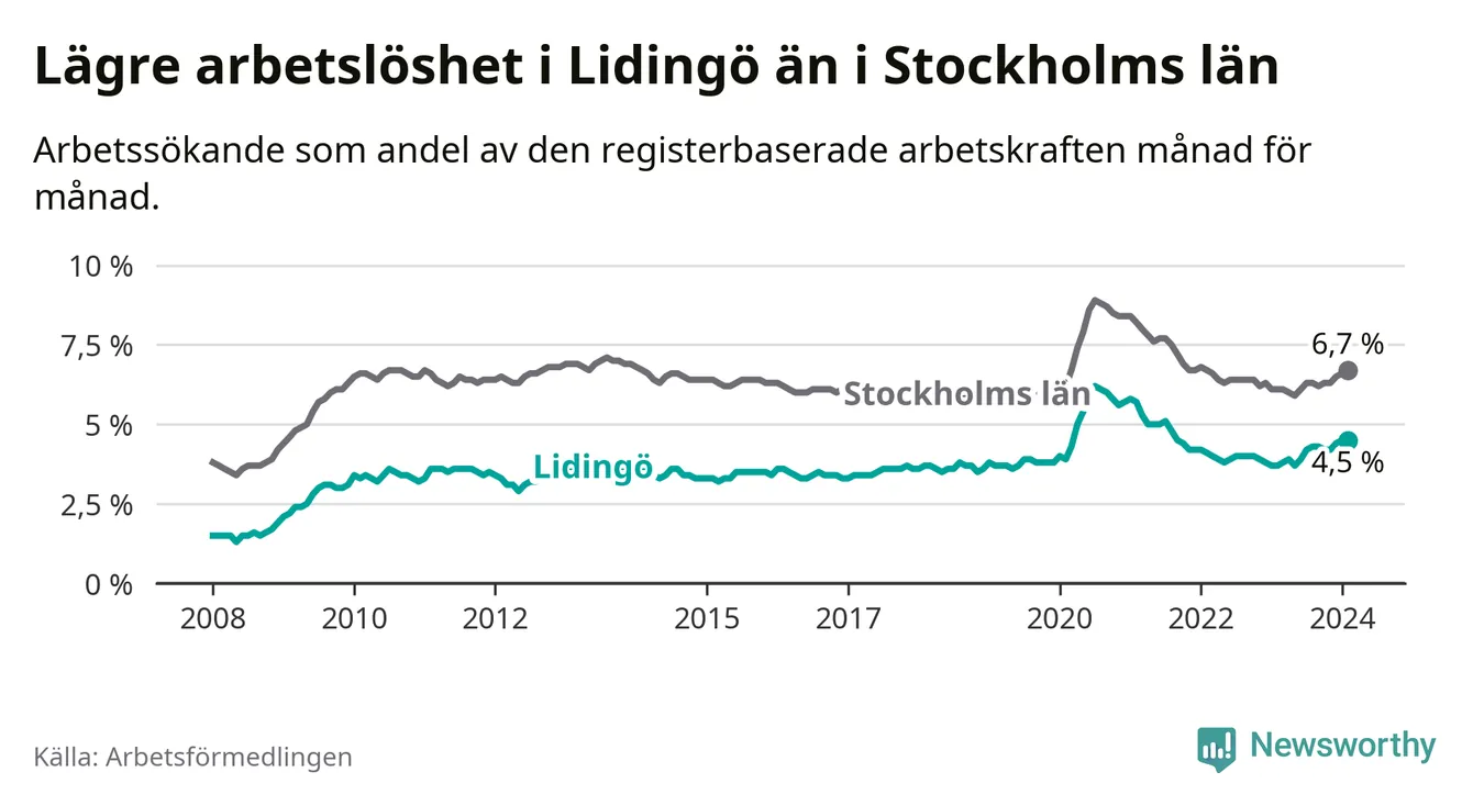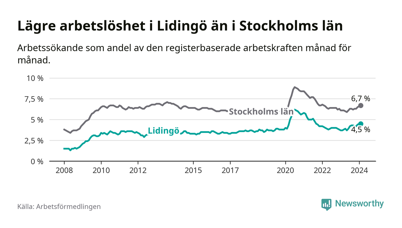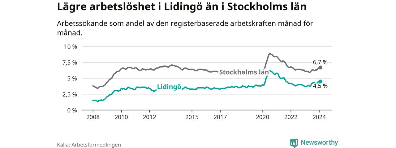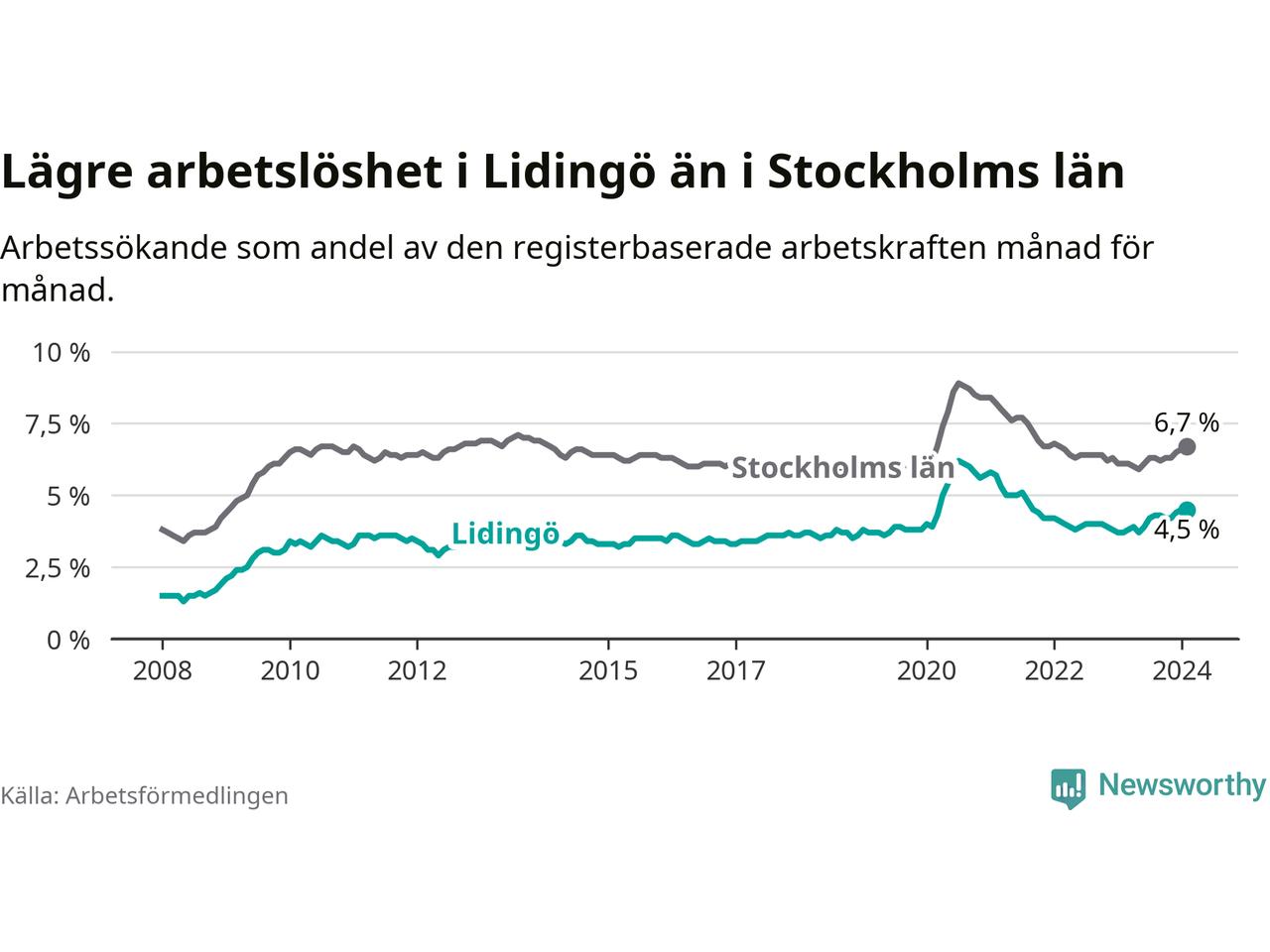 Även om arbetslösheten på Lidingö alltså ökar, så ligger den fortfarande under snittet i hela Stockholms län (4,5 procent i kommunen, jämfört med 6,7 procent i hela länet). Ekerö har den lägsta arbetslösheten i länet (3,5 procent), medan Botkyrka har den högsta (11,1 procent).