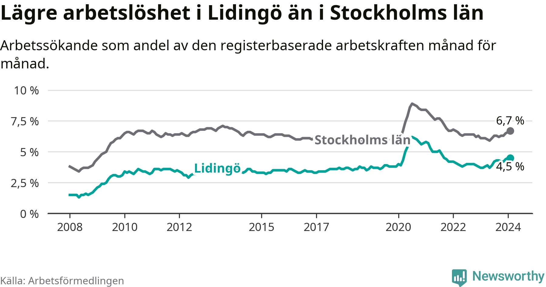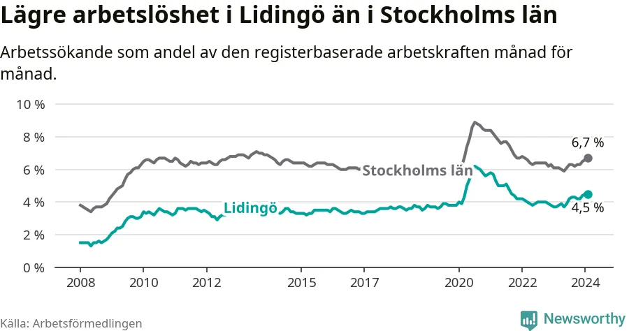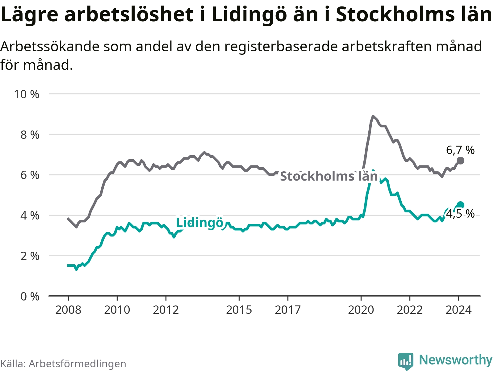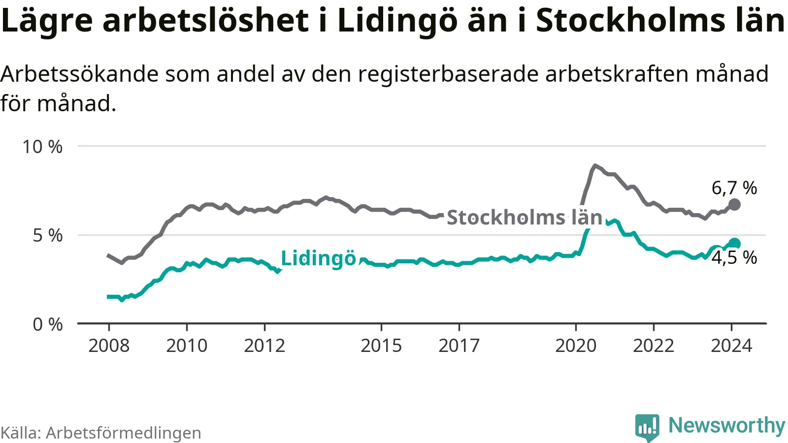 Även om arbetslösheten på Lidingö alltså ökar, så ligger den fortfarande under snittet i hela Stockholms län (4,5 procent i kommunen, jämfört med 6,7 procent i hela länet). Ekerö har den lägsta arbetslösheten i länet (3,5 procent), medan Botkyrka har den högsta (11,1 procent).