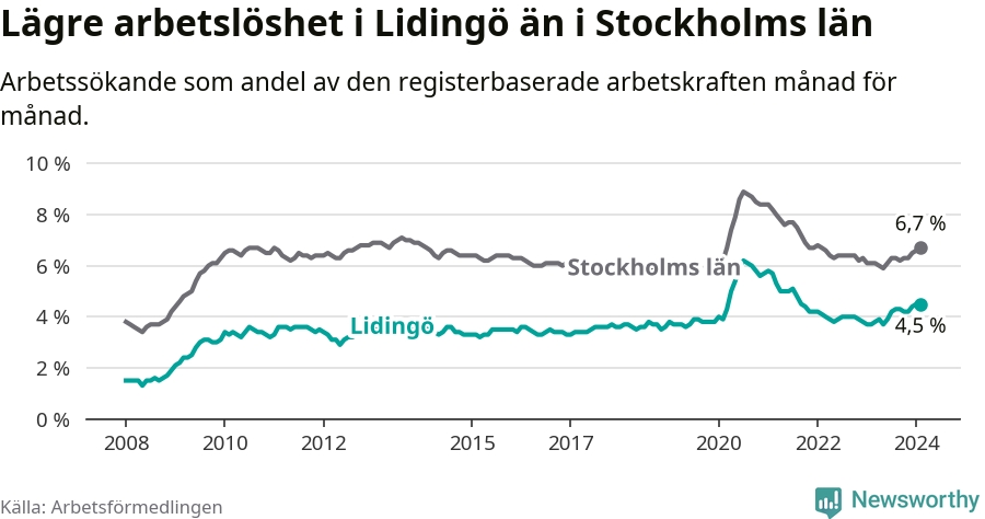 Under februari månad rapporterade Lidingö kommun en total arbetslöshet på 4,5 procent. Det är en ökning jämfört med samma tidpunkt i fjol (+0,8 procentenheter). Även i Stockholms län stiger arbetslösheten .