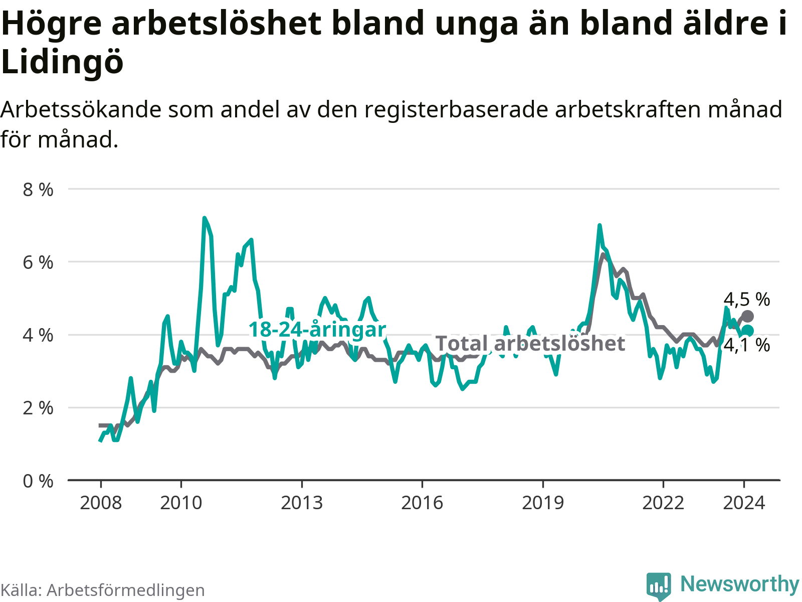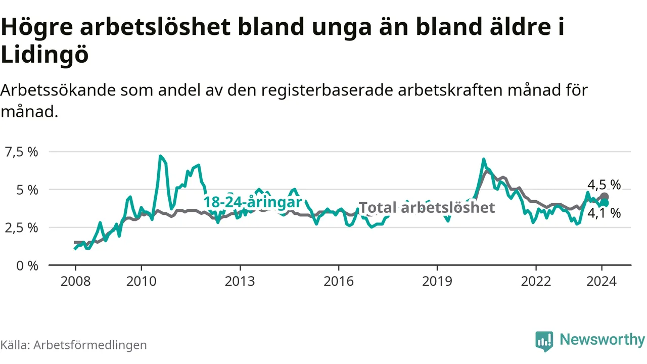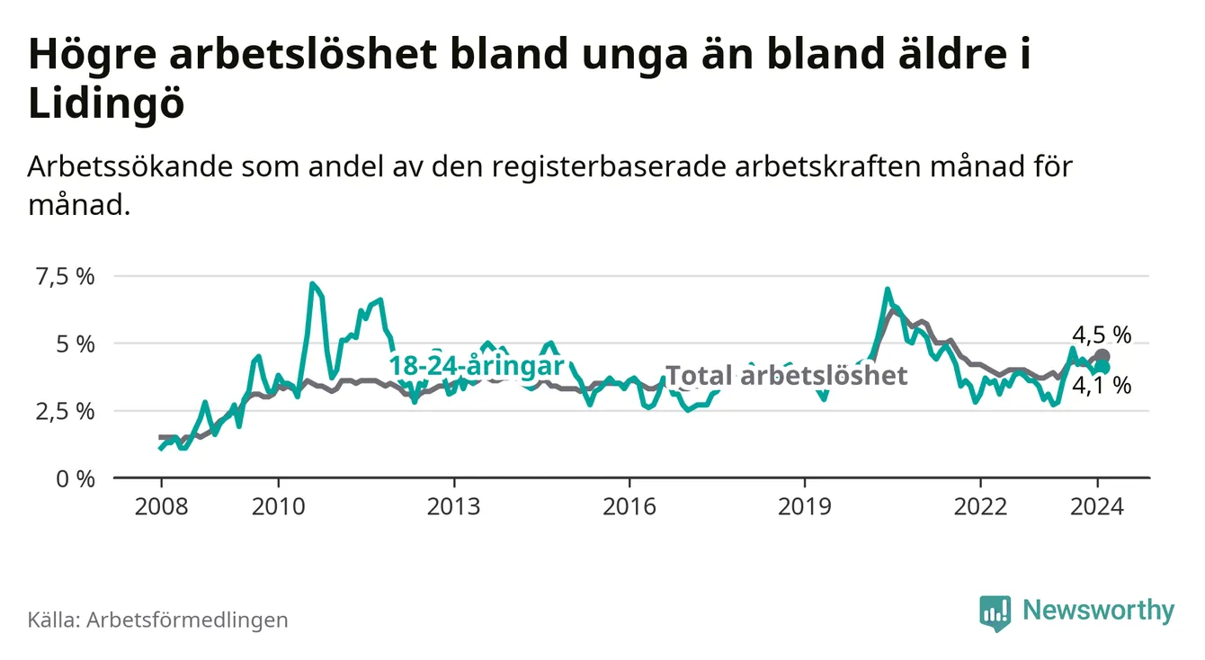 I och med den senaste månadens uppgång har de ungas arbetslöshet på Lidingö stigit åtta månader i följd (upp från 3,6 procent i juni 2023 till 4,1 procent nu).