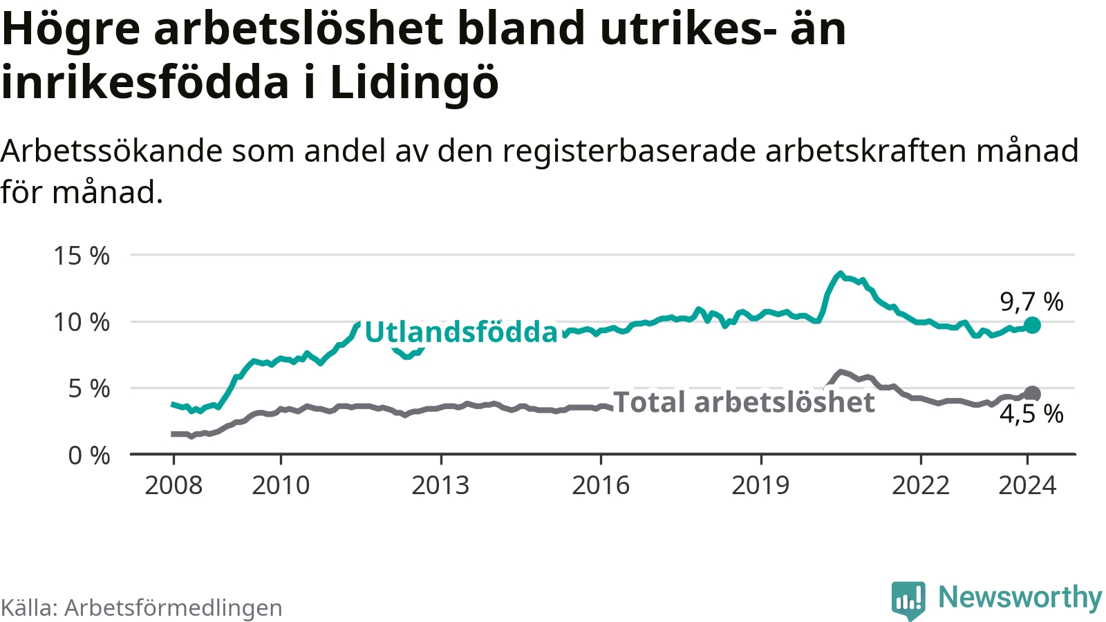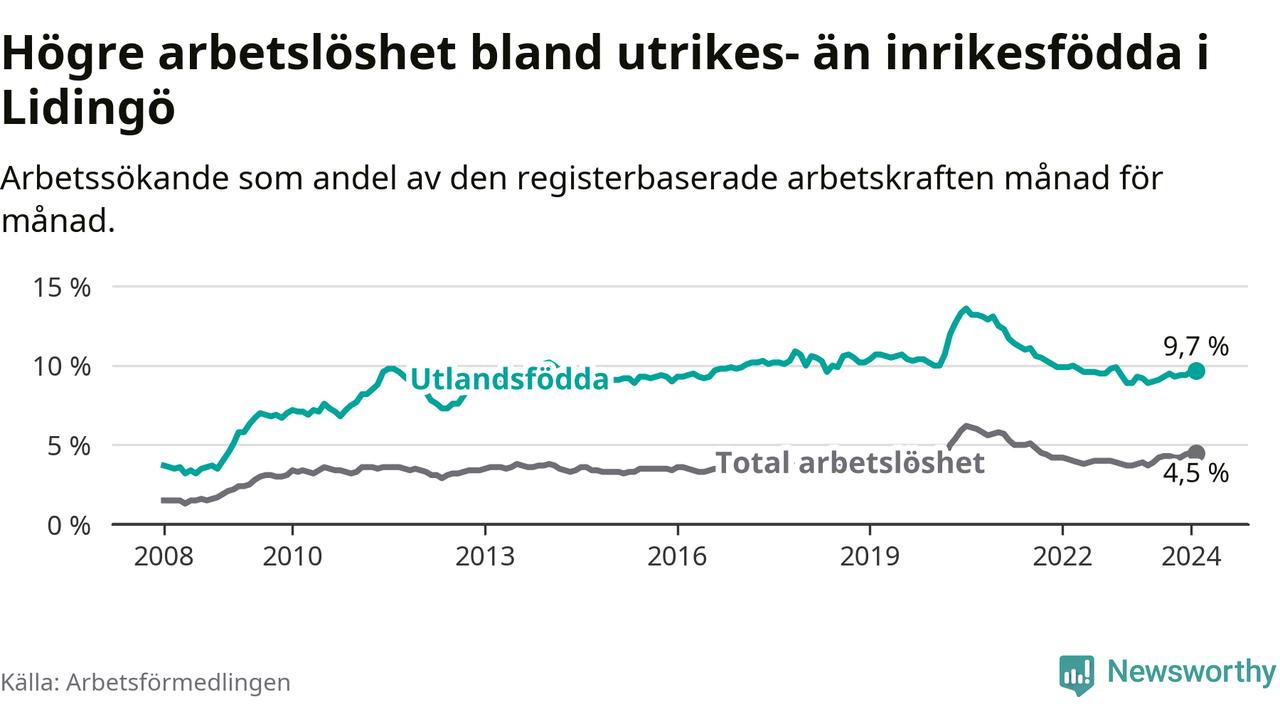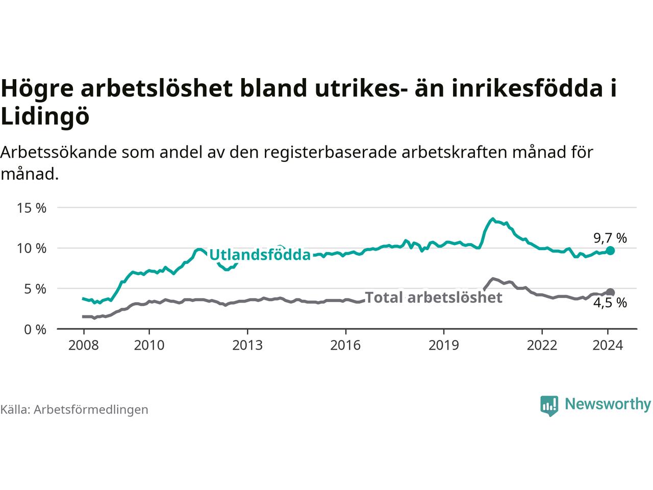 Arbetslösheten bland utlandsfödda var 9,7 procent på Lidingö under februari månad, motsvarande tio av 103 personer. Det är 0,8 procentenheter fler än vid samma tidpunkt i fjol (−431 om man räknar personer).