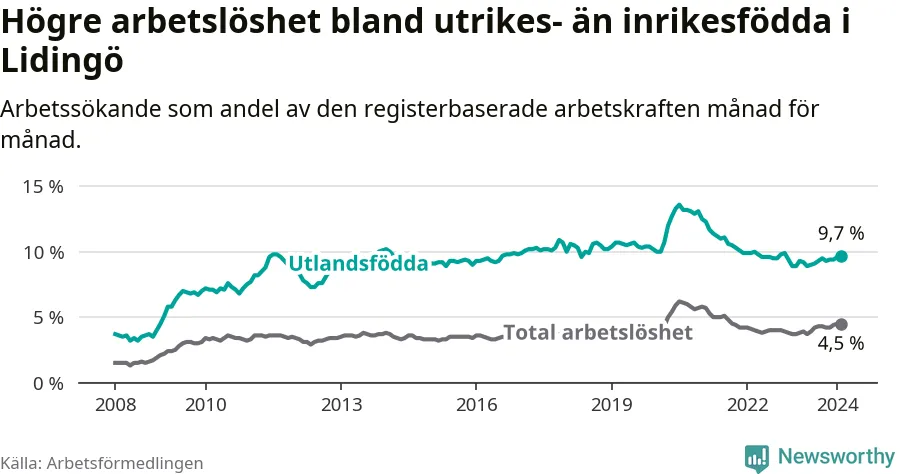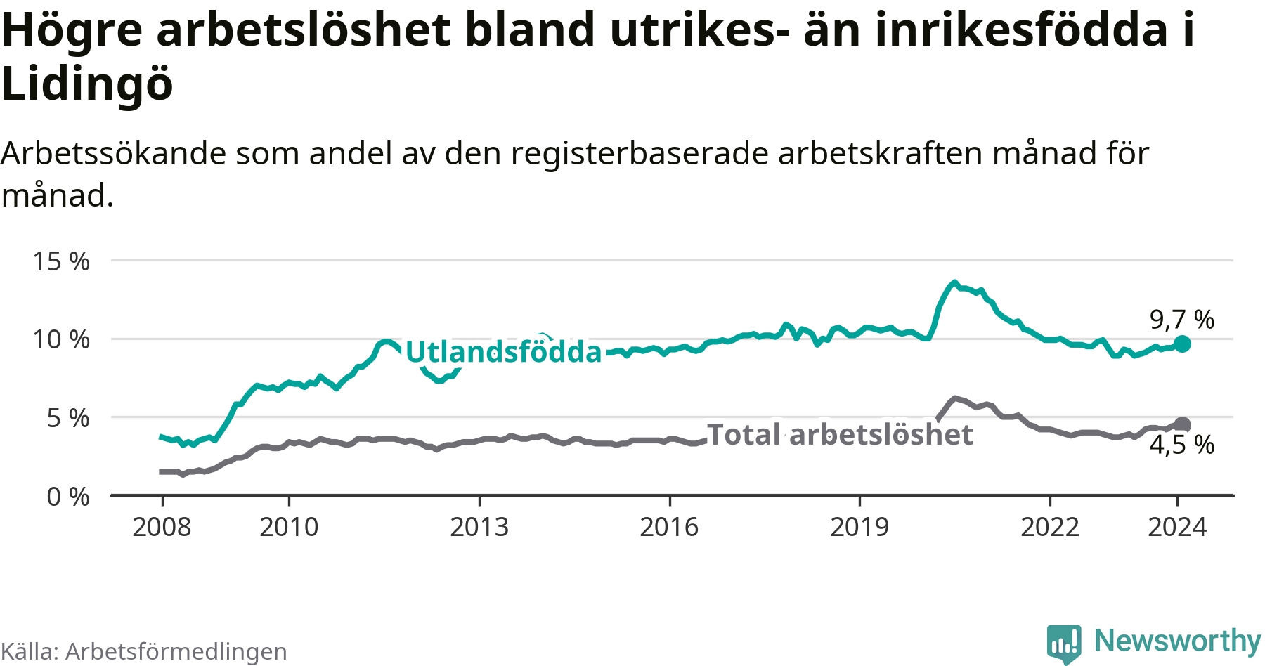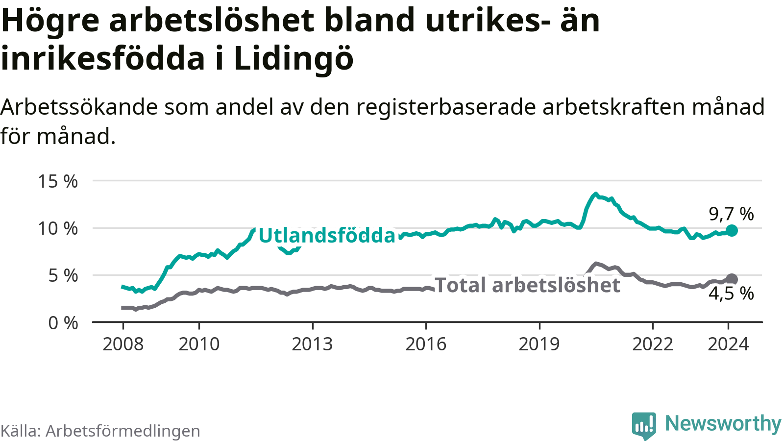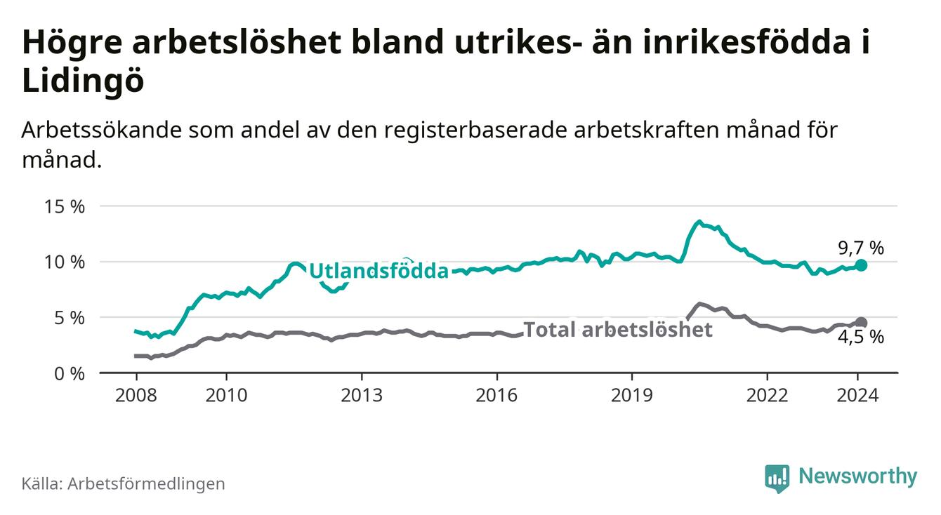 Arbetslösheten bland utlandsfödda var 9,7 procent på Lidingö under februari månad, motsvarande tio av 103 personer. Det är 0,8 procentenheter fler än vid samma tidpunkt i fjol (−431 om man räknar personer).
