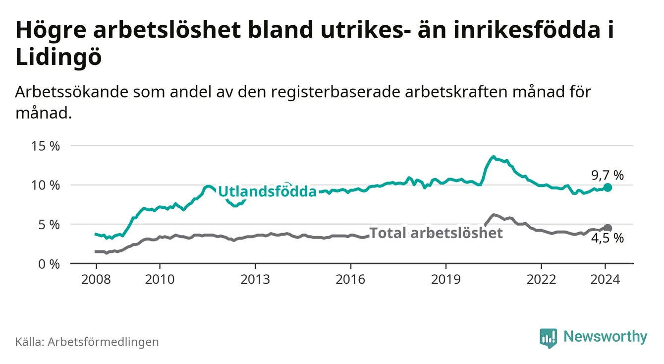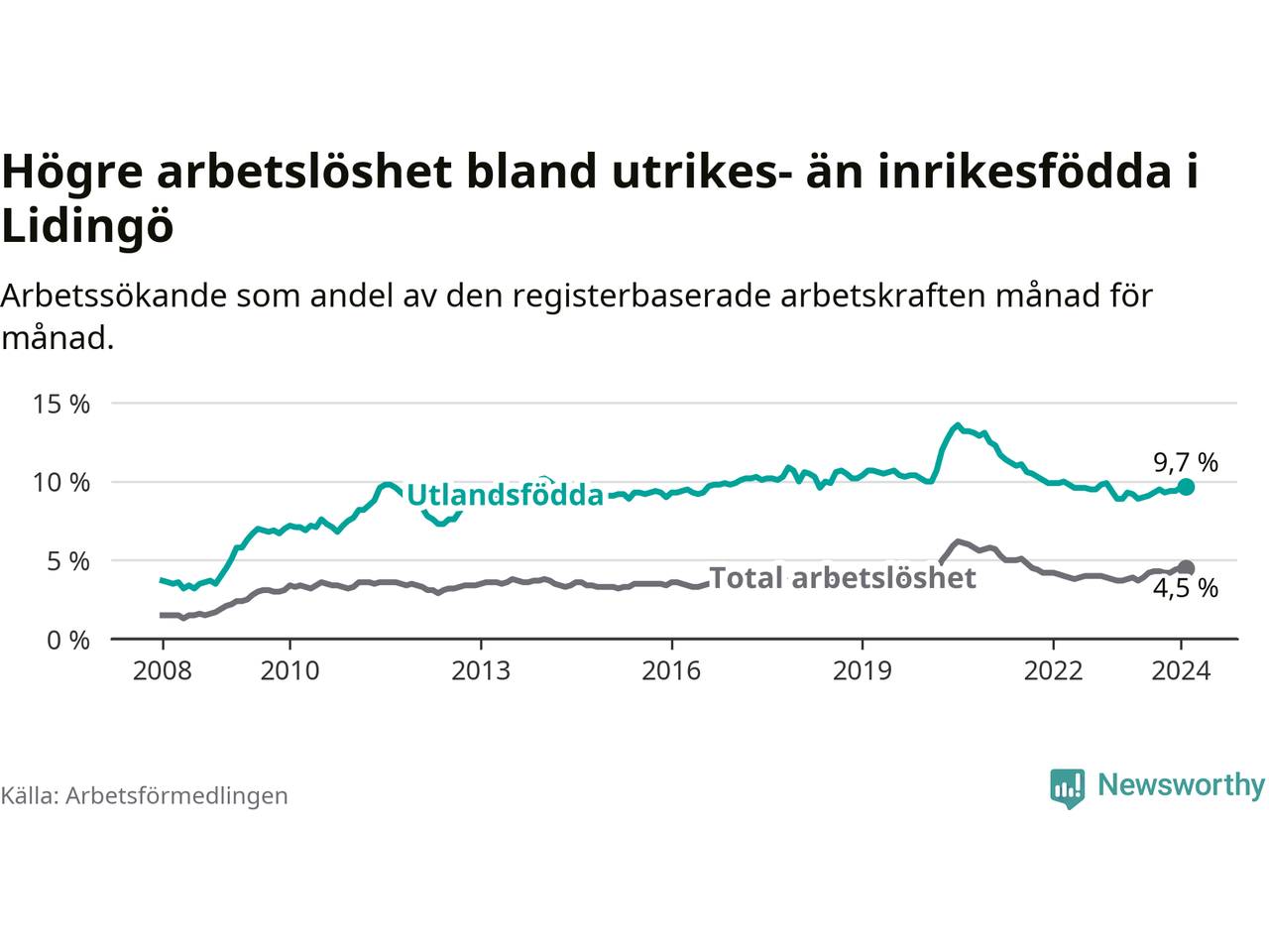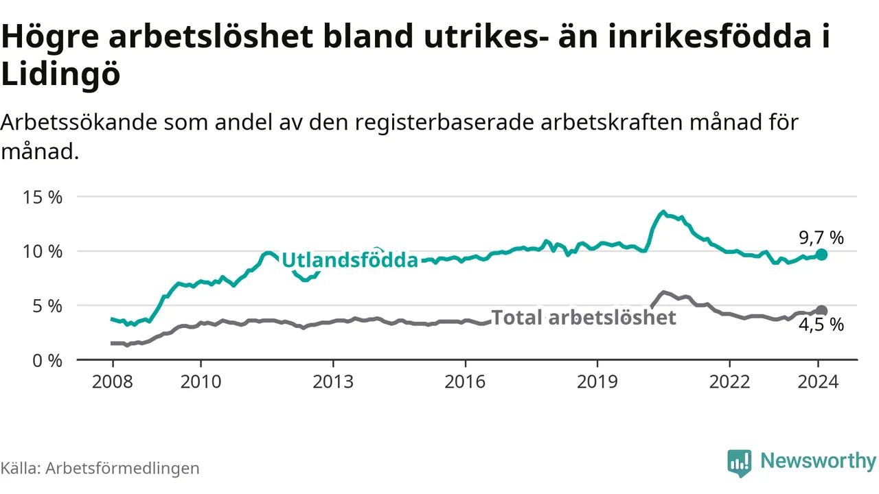 Skillnaden i arbetslöshet mellan utrikesfödda och hela befolkningen är 5,2 procentenheter på Lidingö. Det är ungefär samma skillnad som för ett år sedan.