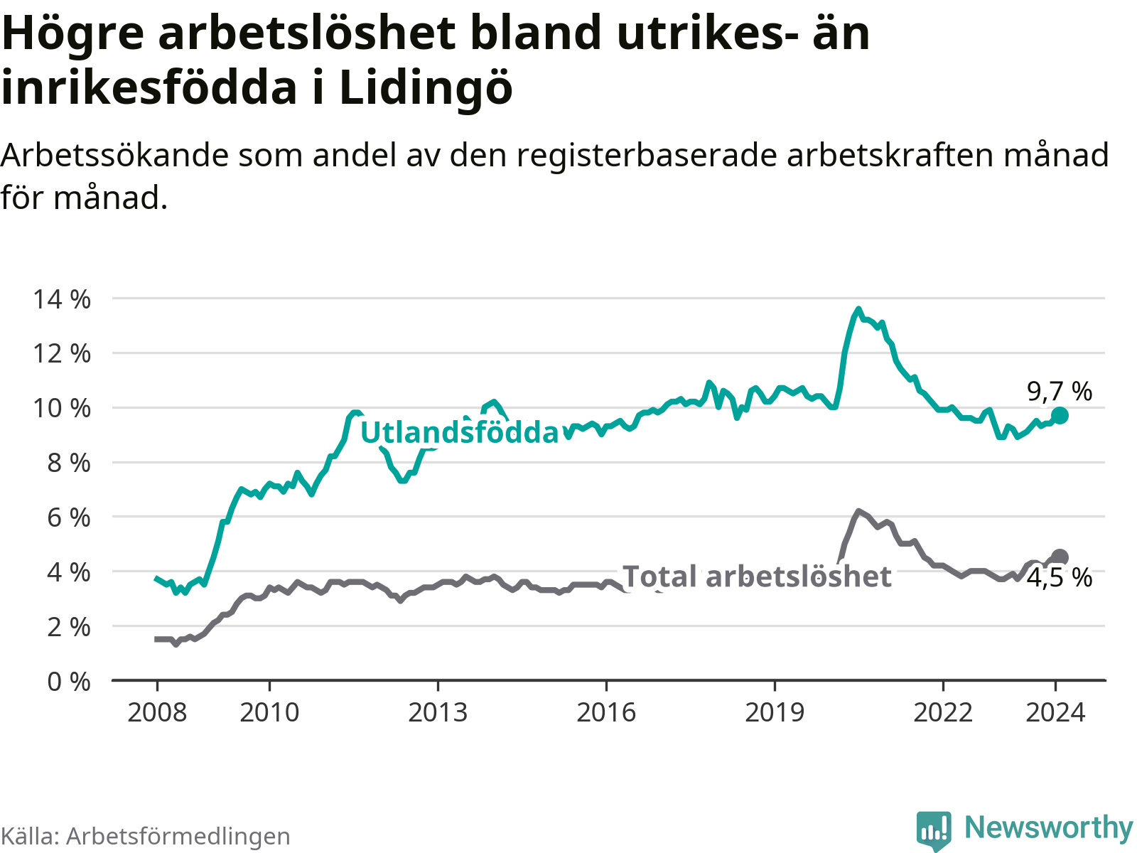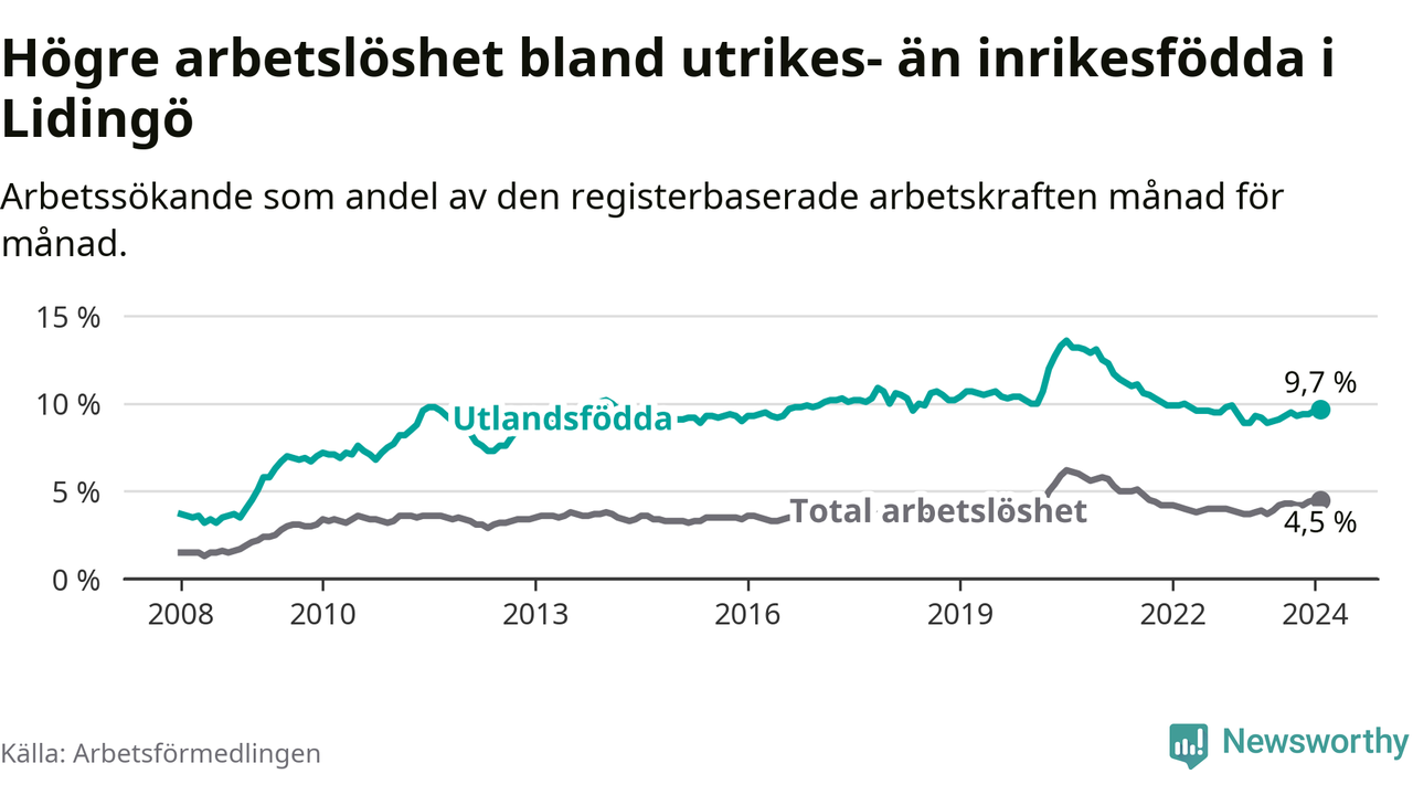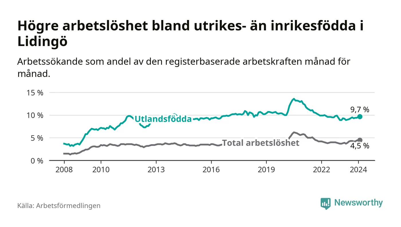 Skillnaden i arbetslöshet mellan utrikesfödda och hela befolkningen är 5,2 procentenheter på Lidingö. Det är ungefär samma skillnad som för ett år sedan.