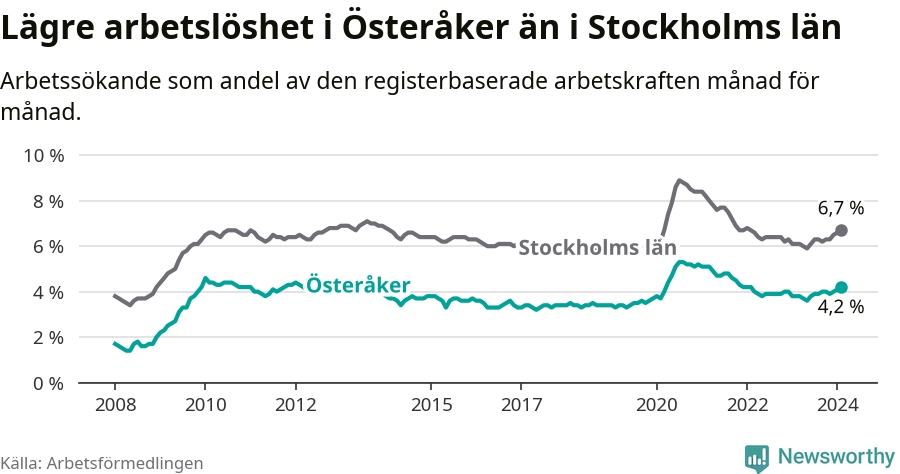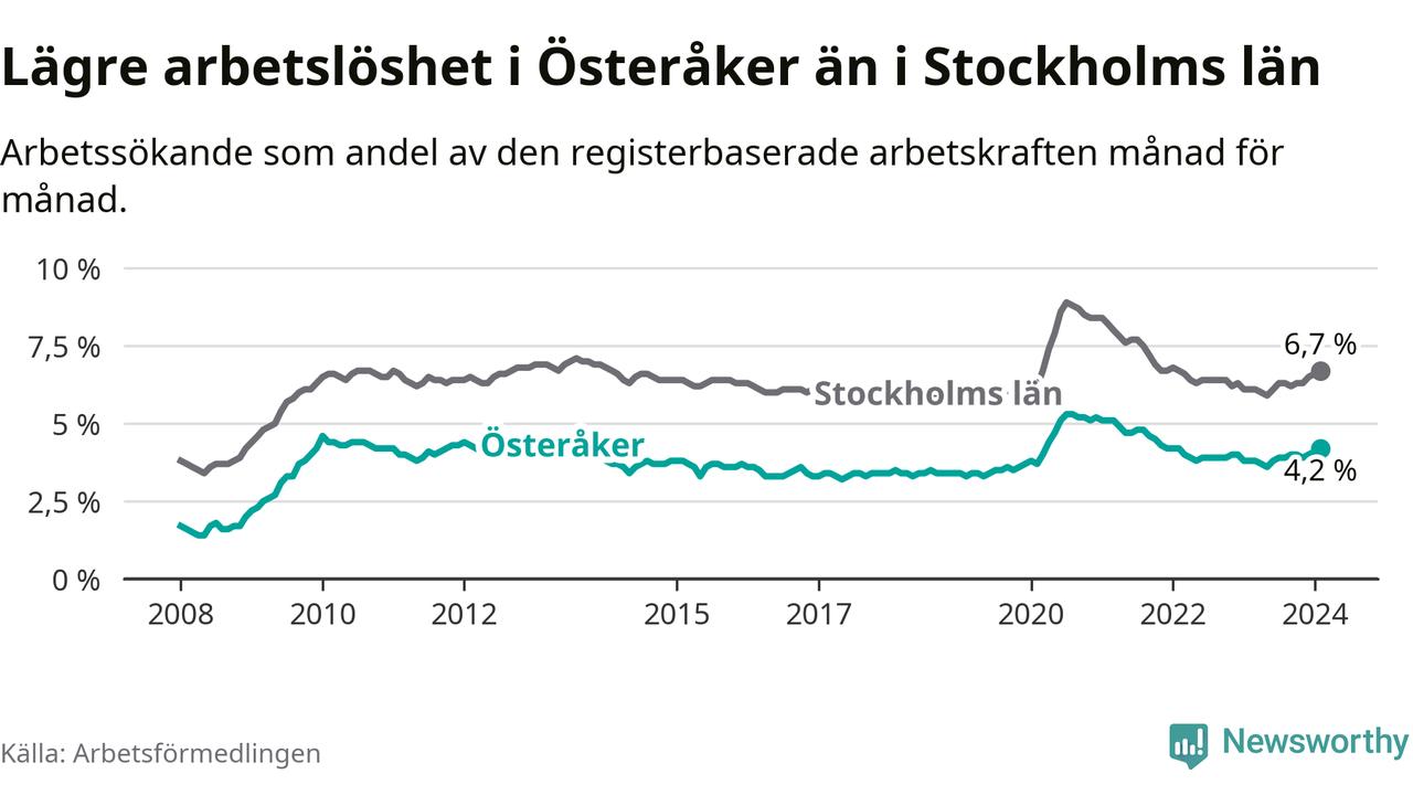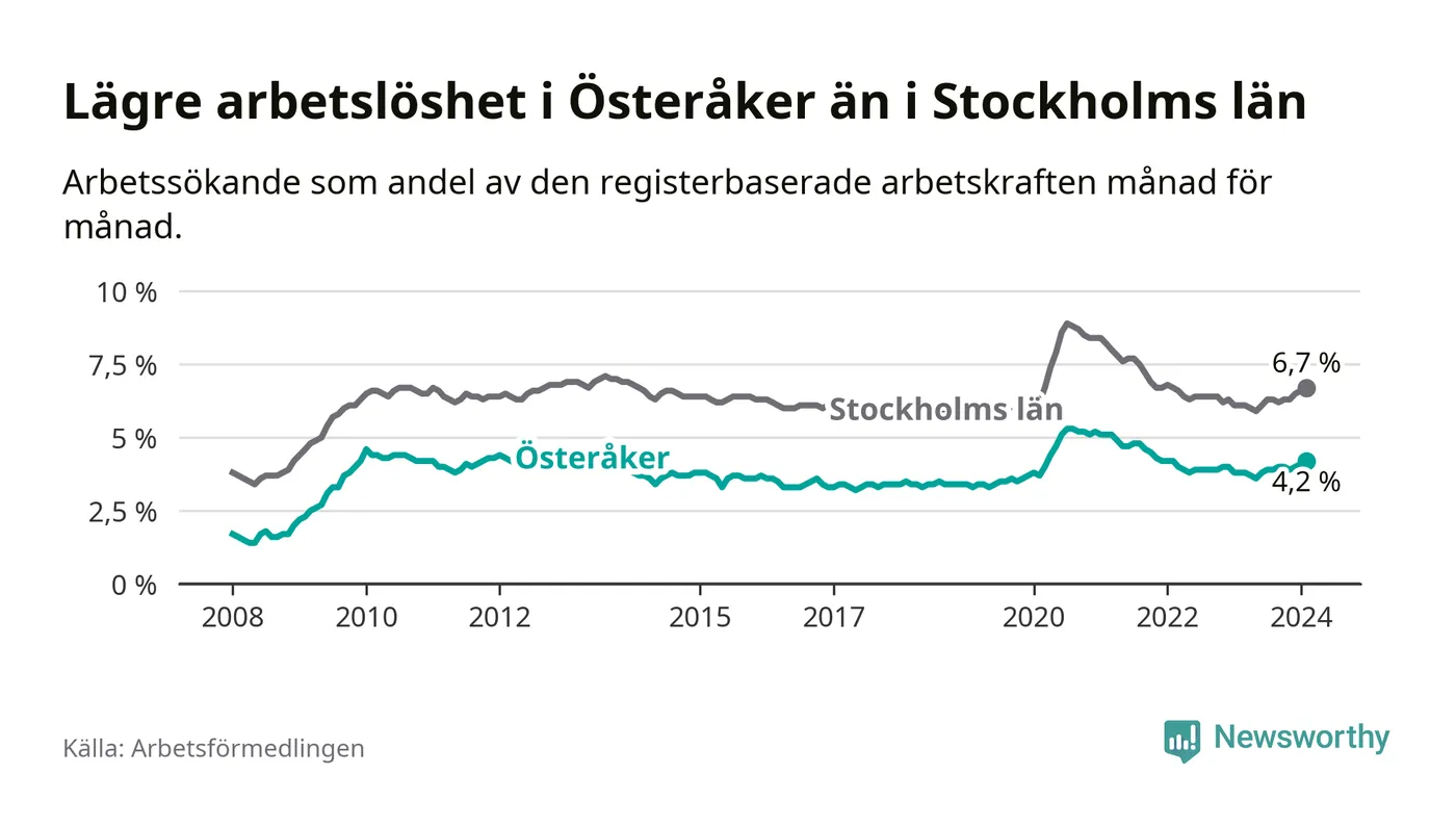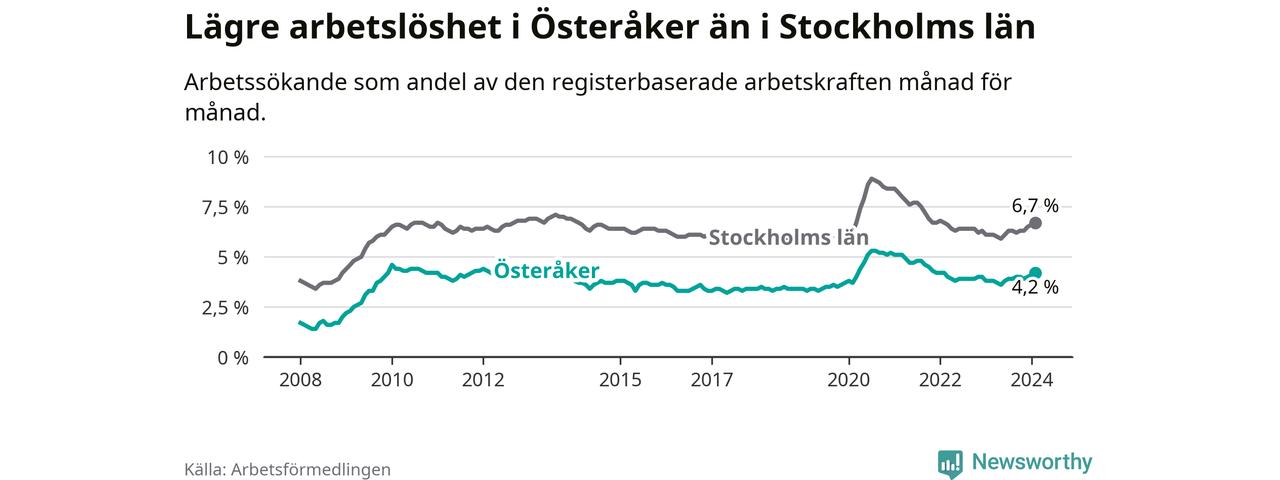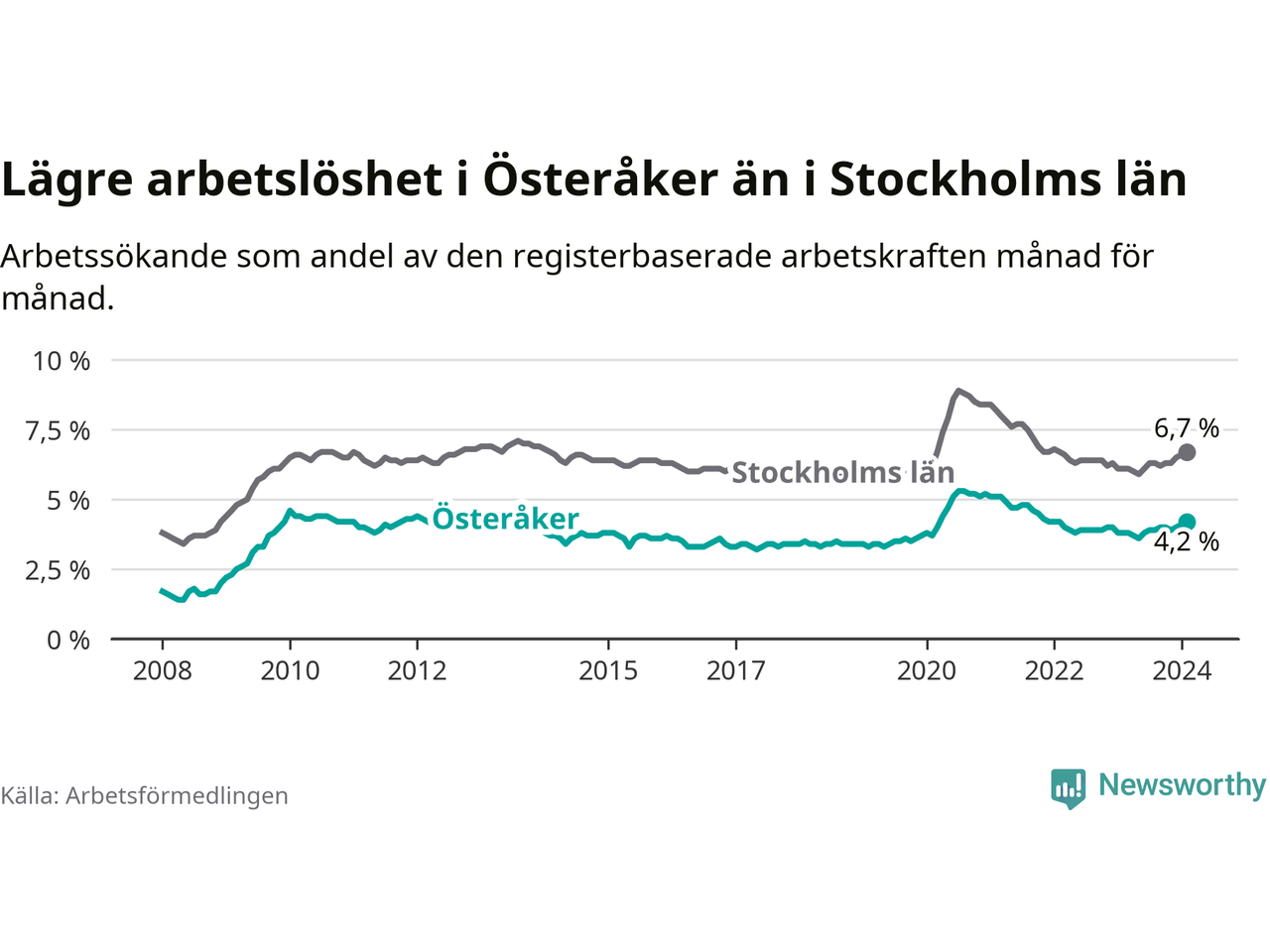 Även om arbetslösheten i Österåker alltså ökar, så ligger den fortfarande under snittet i hela Stockholms län (4,2 procent i kommunen, jämfört med 6,7 procent i hela länet). Ekerö har den lägsta arbetslösheten i länet (3,5 procent), medan Botkyrka har den högsta (11,1 procent).