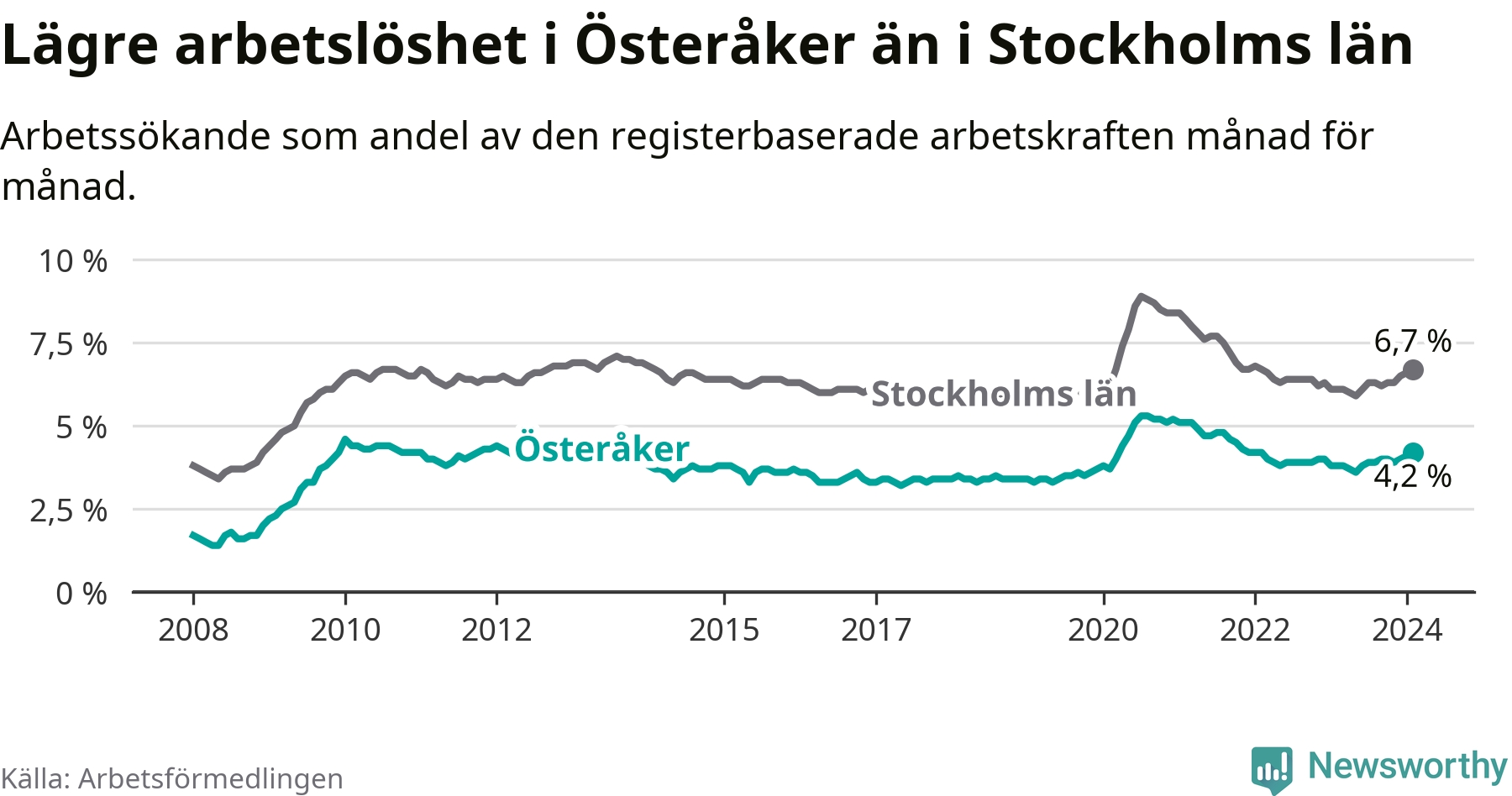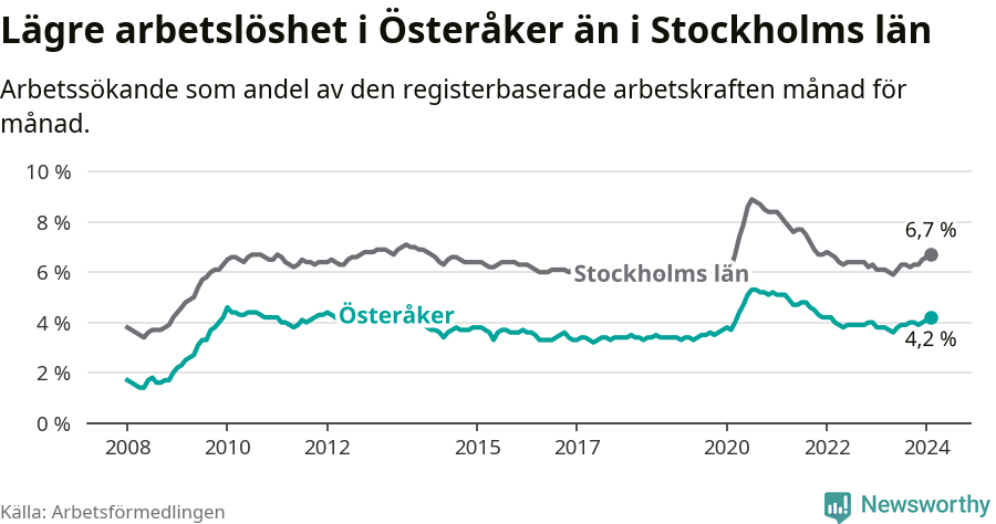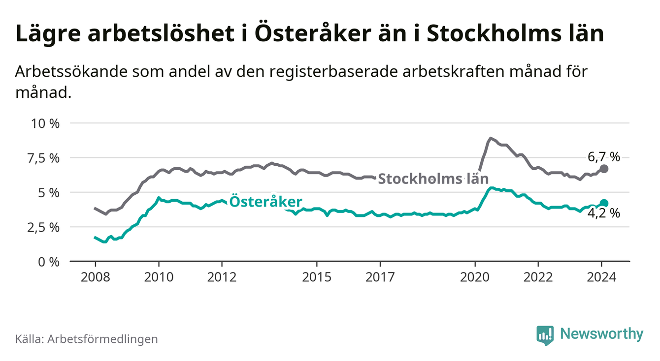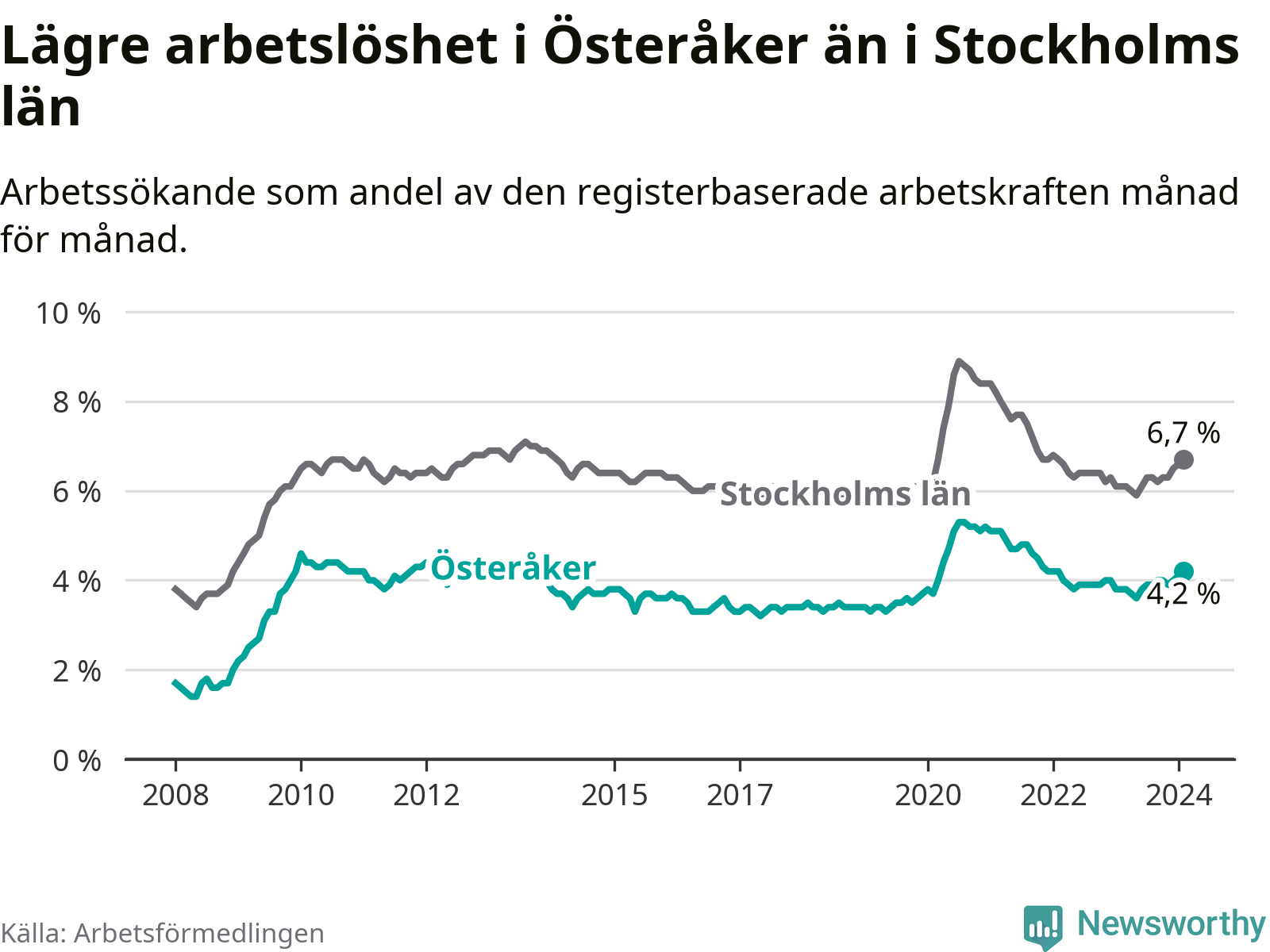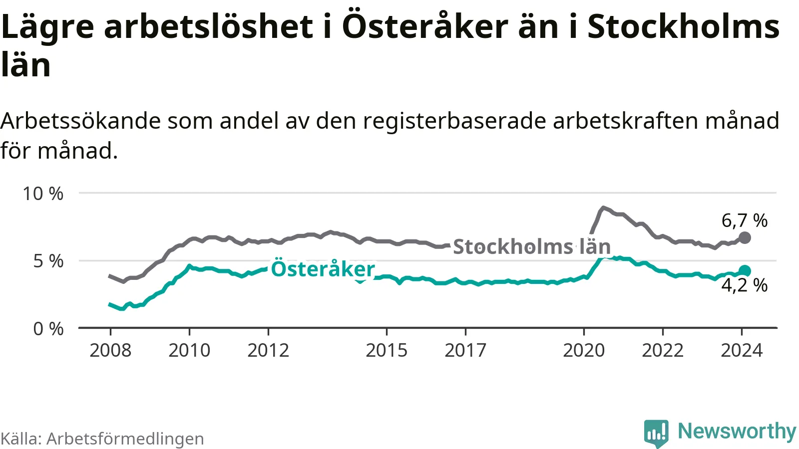 Även om arbetslösheten i Österåker alltså ökar, så ligger den fortfarande under snittet i hela Stockholms län (4,2 procent i kommunen, jämfört med 6,7 procent i hela länet). Ekerö har den lägsta arbetslösheten i länet (3,5 procent), medan Botkyrka har den högsta (11,1 procent).