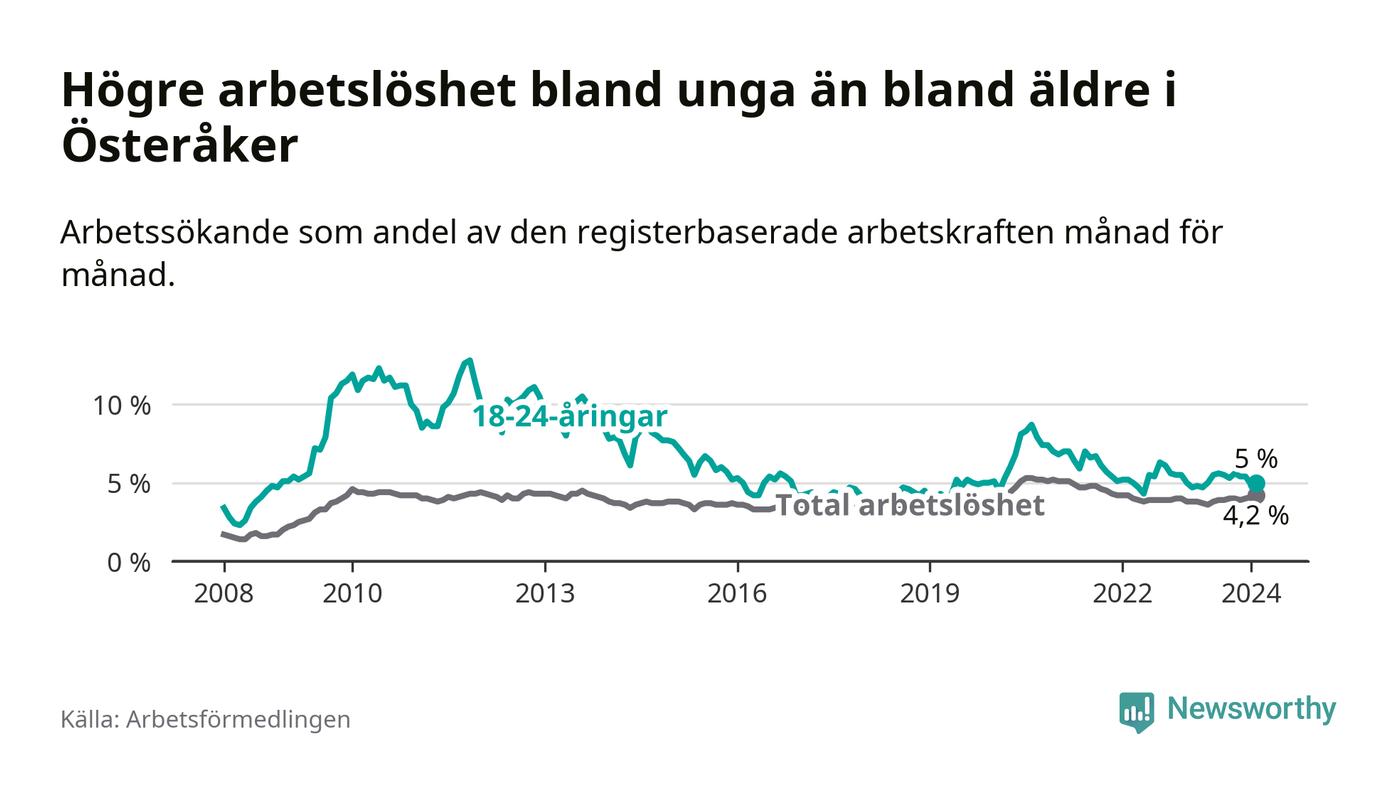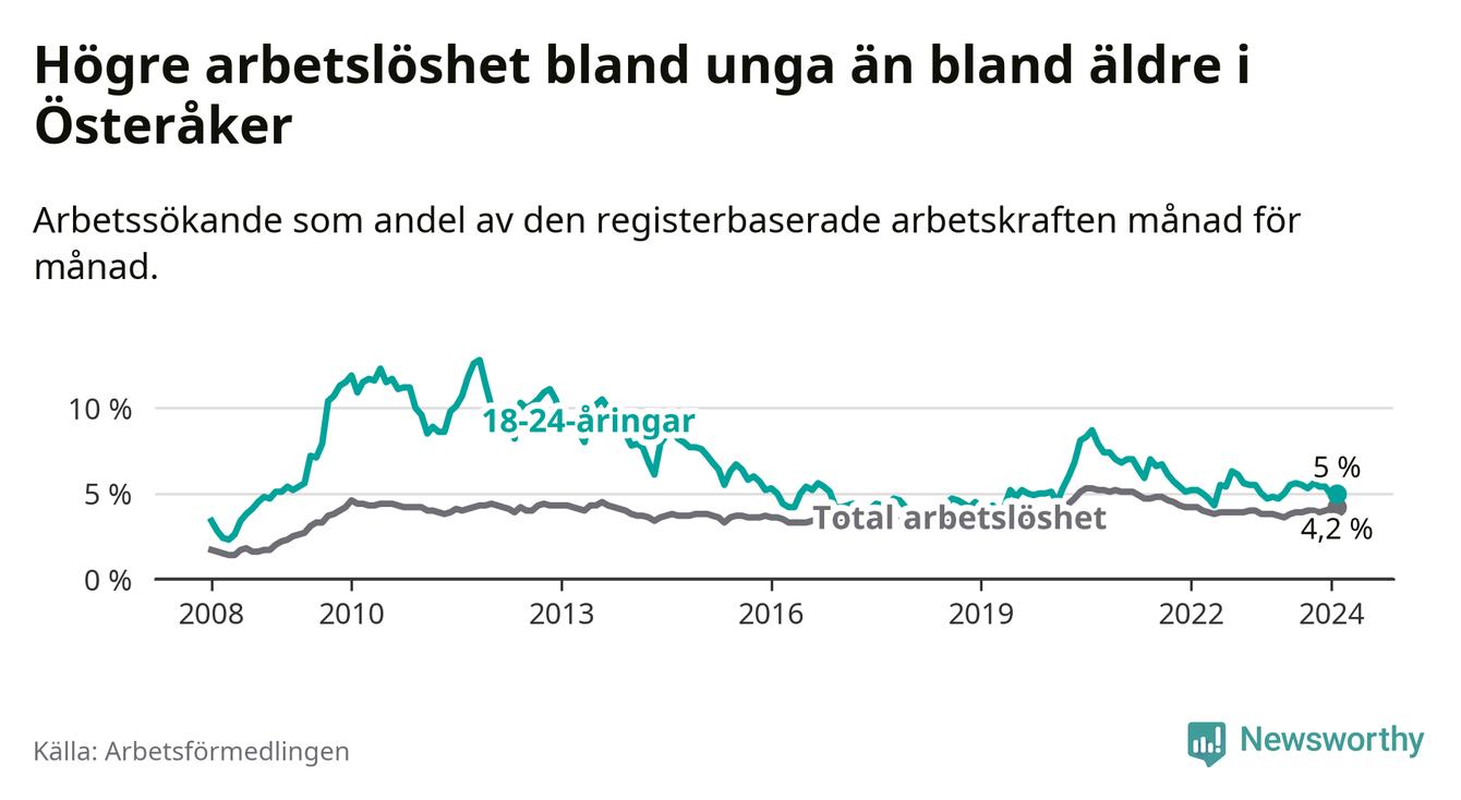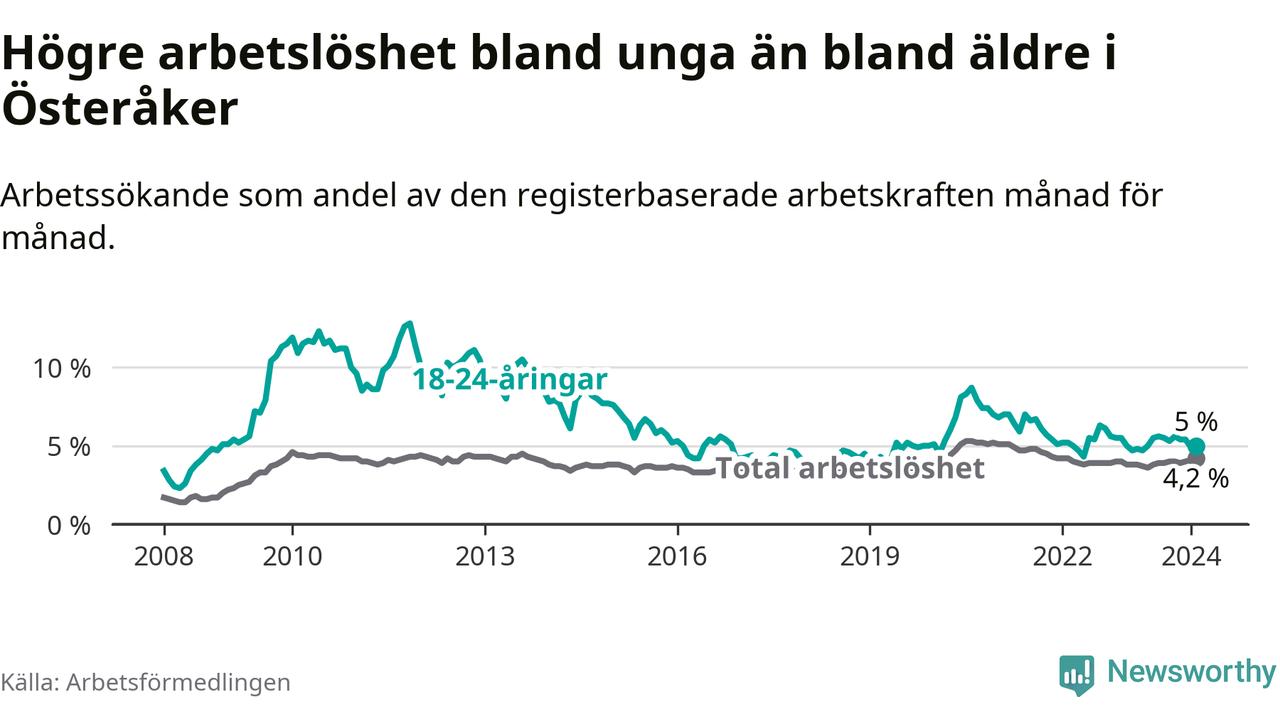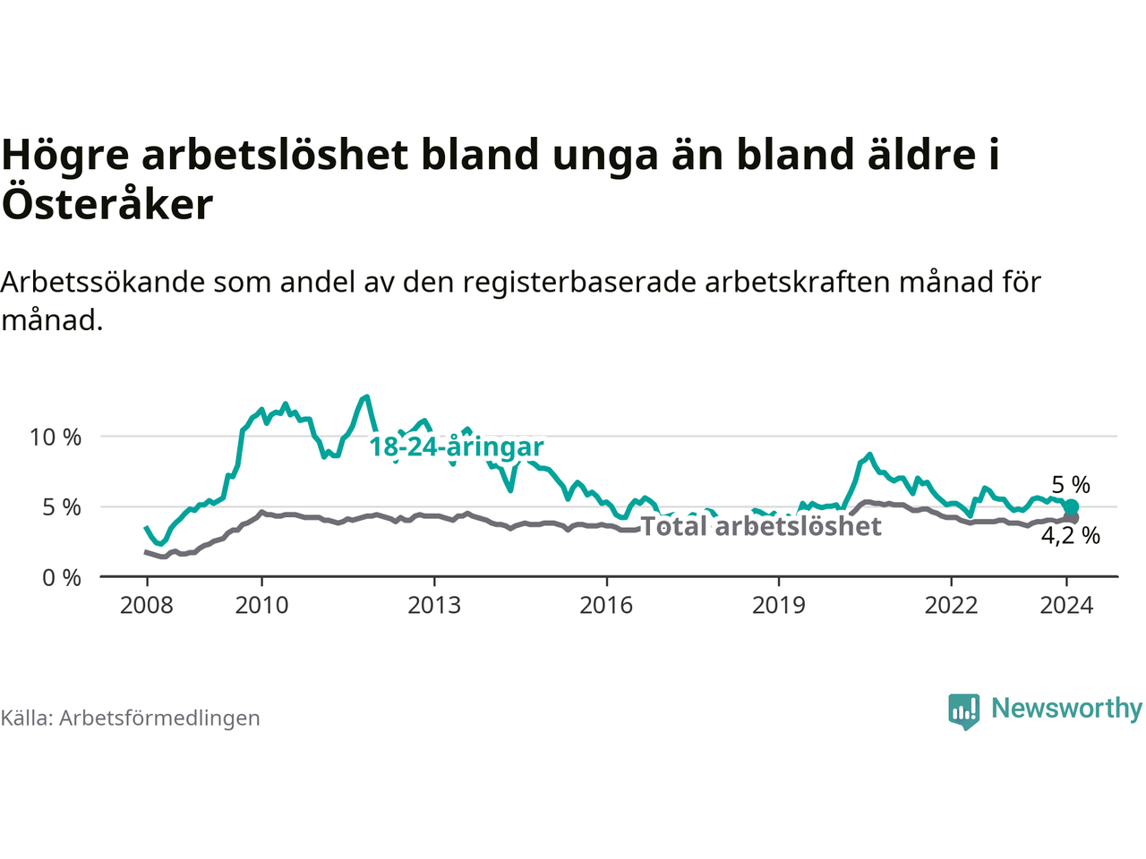 Även om arbetslösheten i Österåker alltså ökar, så ligger den fortfarande under snittet i hela Stockholms län (4,2 procent i kommunen, jämfört med 6,7 procent i hela länet). Ekerö har den lägsta arbetslösheten i länet (3,5 procent), medan Botkyrka har den högsta (11,1 procent).