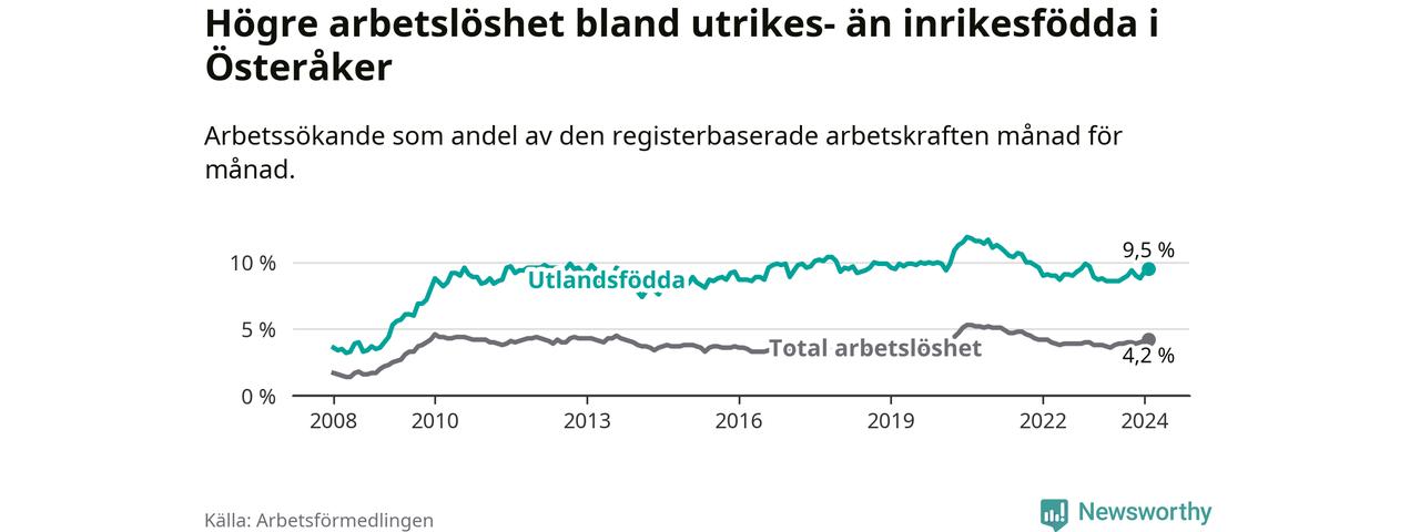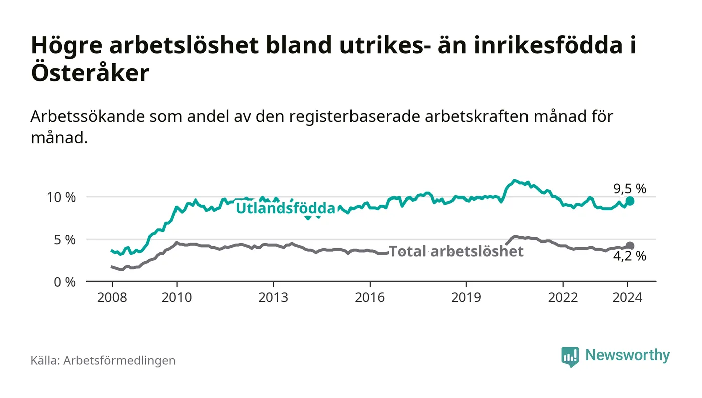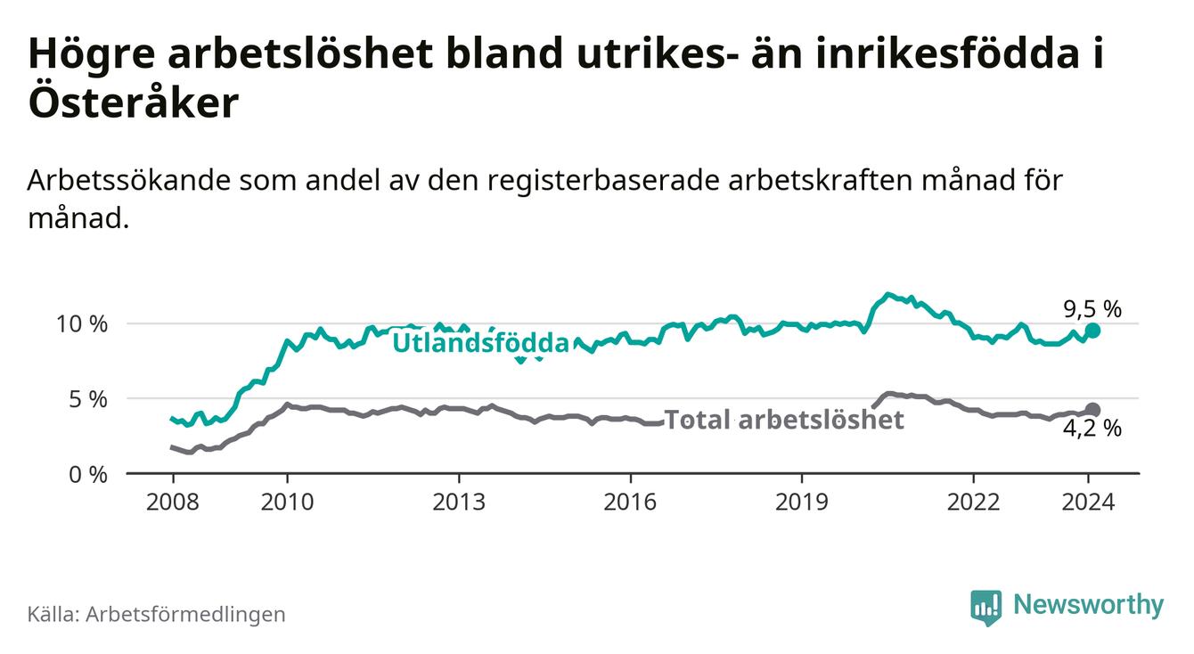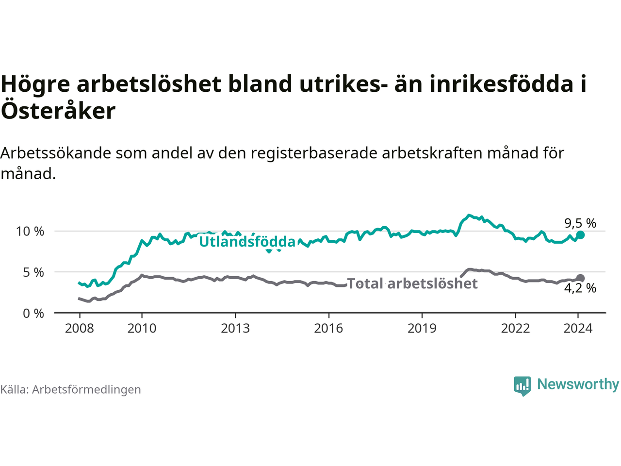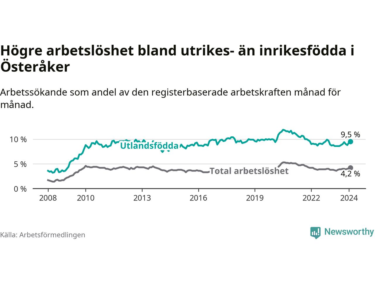 Arbetslösheten bland utlandsfödda var 9,5 procent i Österåker under februari månad, motsvarande tio av 105 personer. Det är 0,8 procentenheter fler än vid samma tidpunkt i fjol (−448 om man räknar personer).