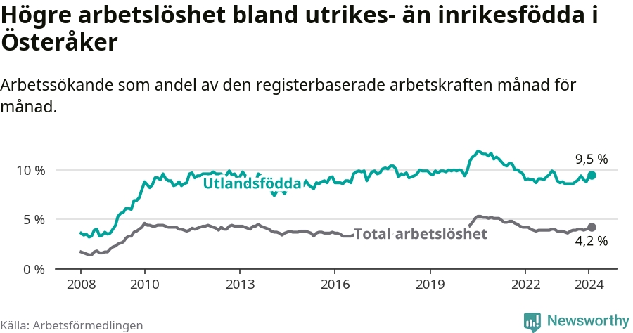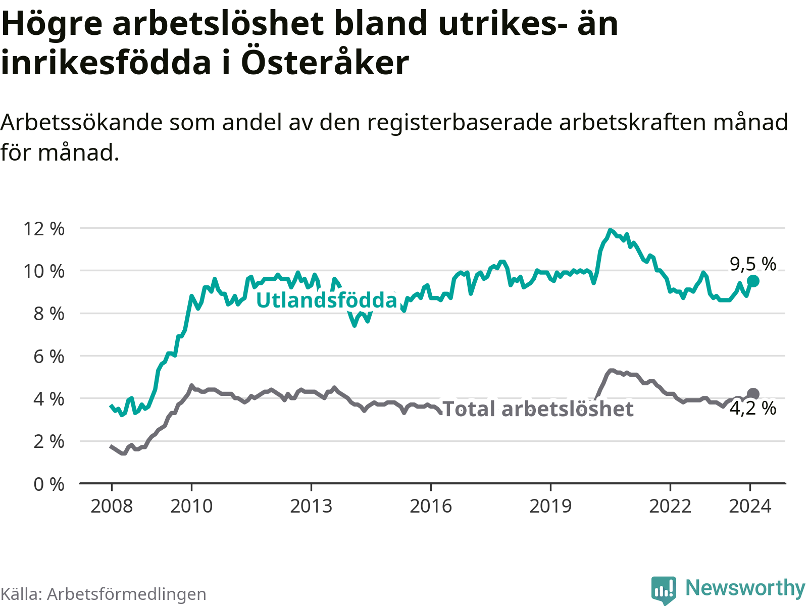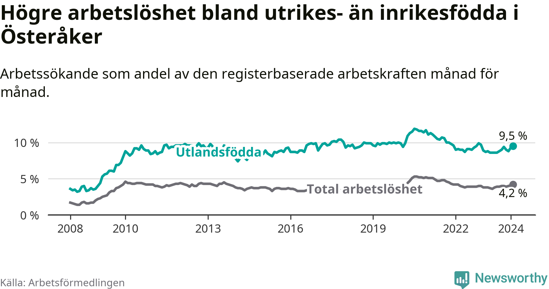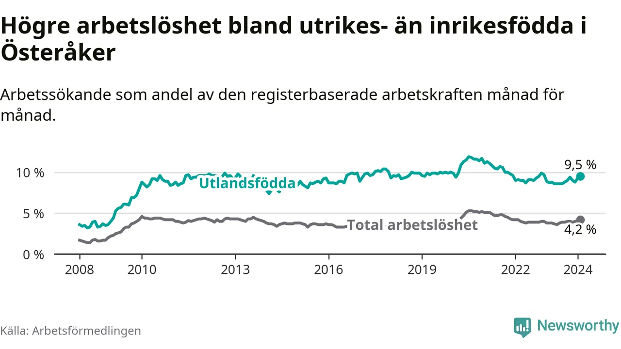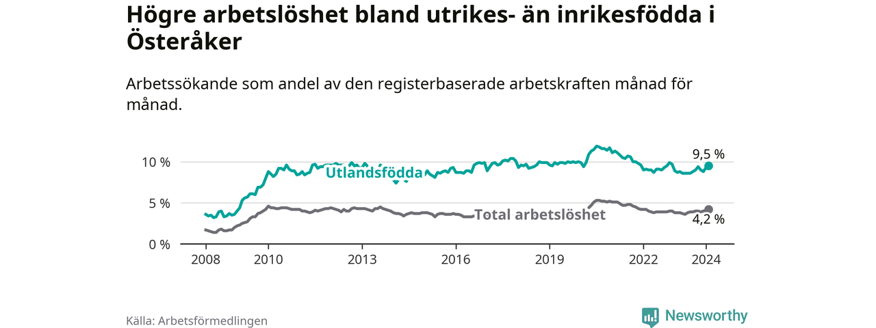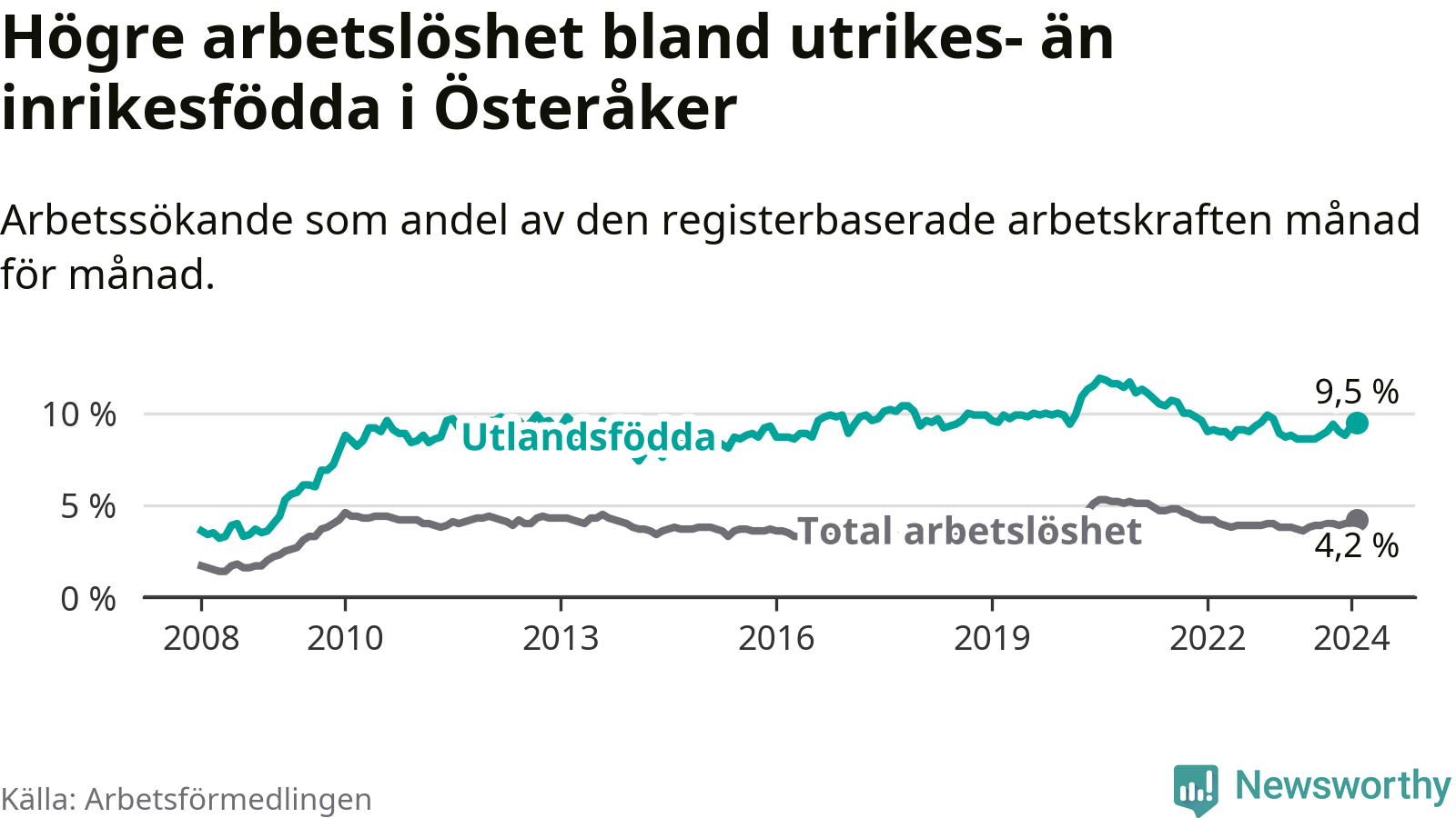 Arbetslösheten bland utlandsfödda var 9,5 procent i Österåker under februari månad, motsvarande tio av 105 personer. Det är 0,8 procentenheter fler än vid samma tidpunkt i fjol (−448 om man räknar personer).