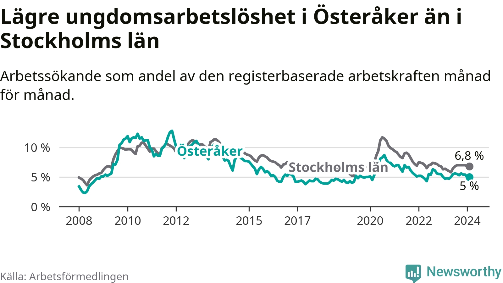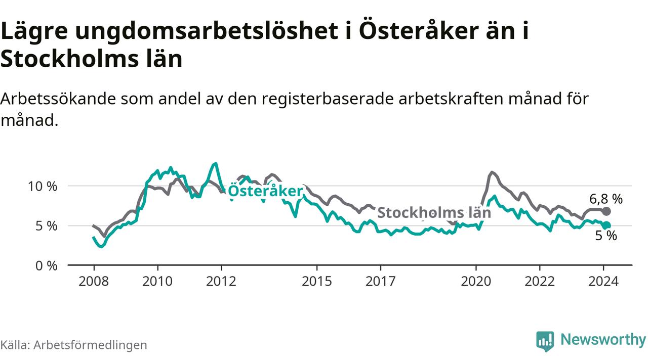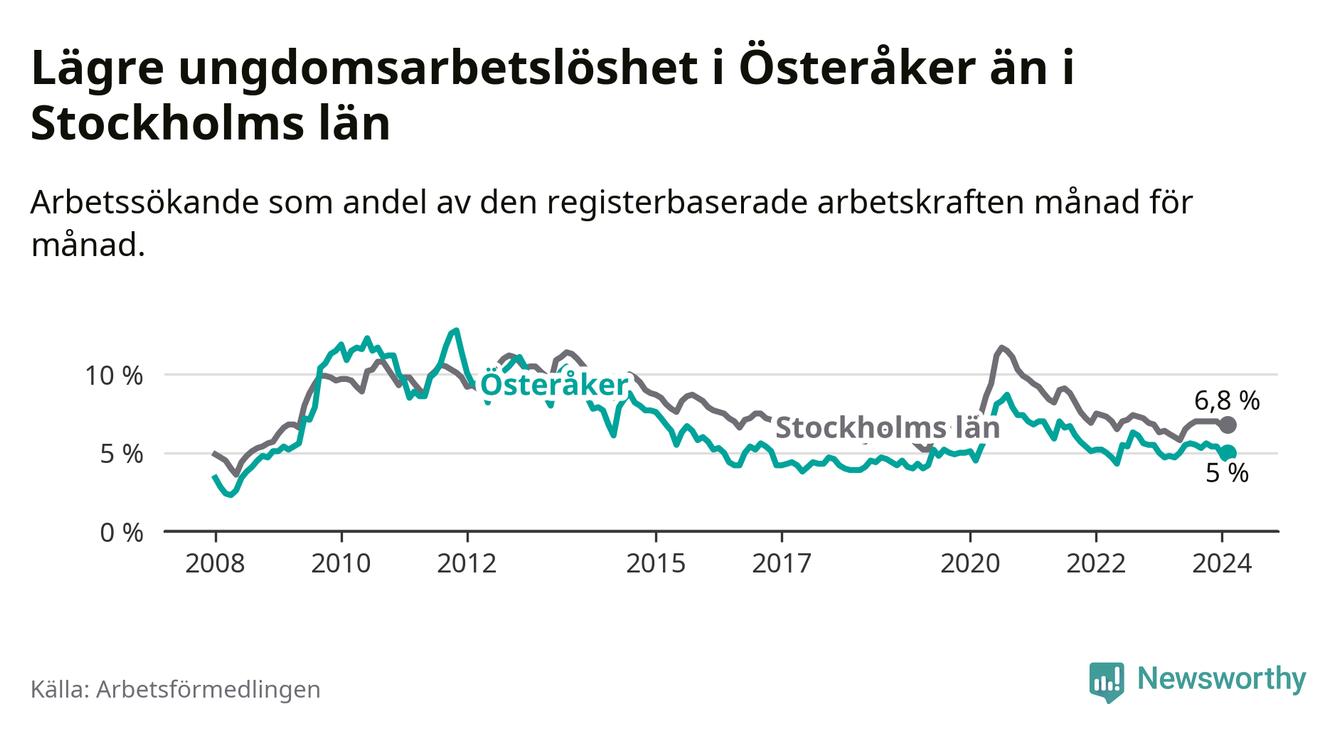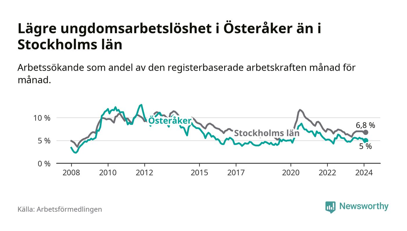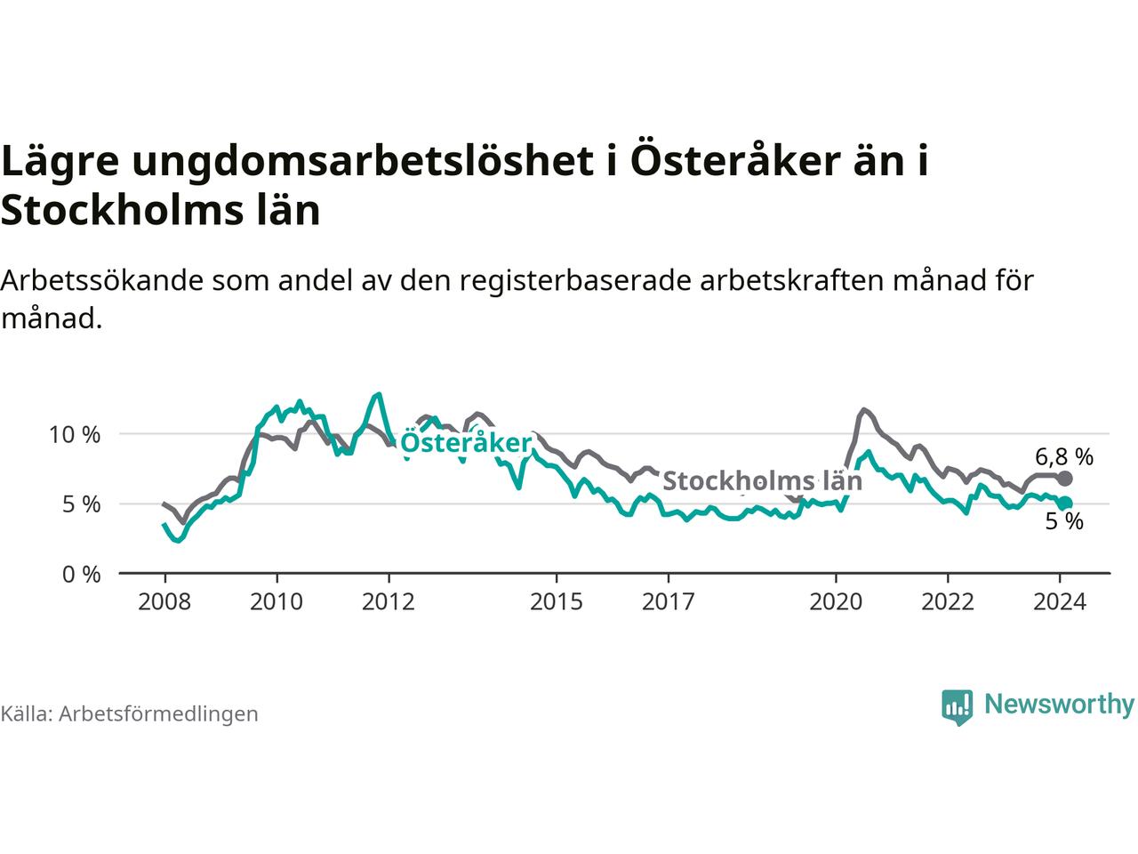 Precis som den totala arbetslösheten ligger ungdomsarbetslösheten i Österåker lägre än i Stockholms län som helhet. Skillnaden mellan kommunen och länet är 1,8 procentenheter.