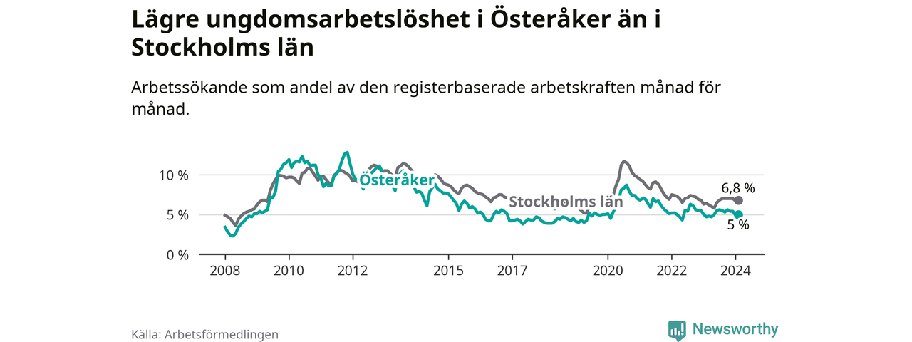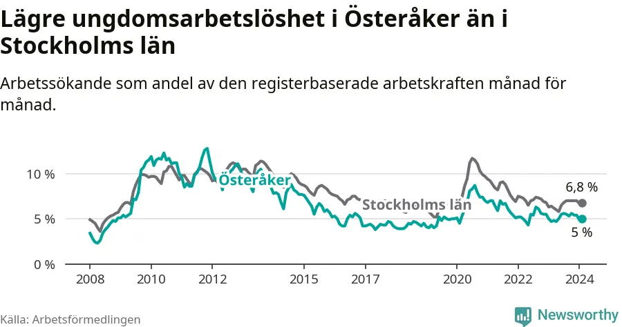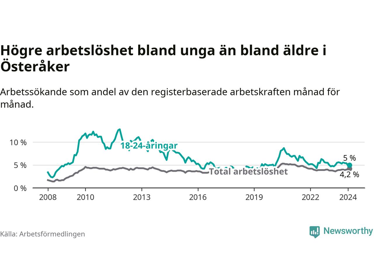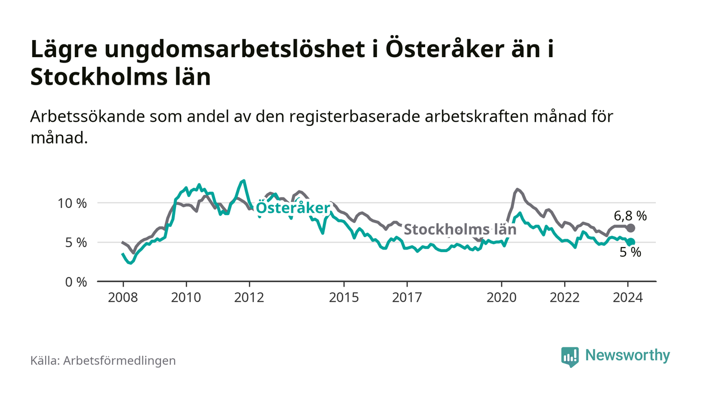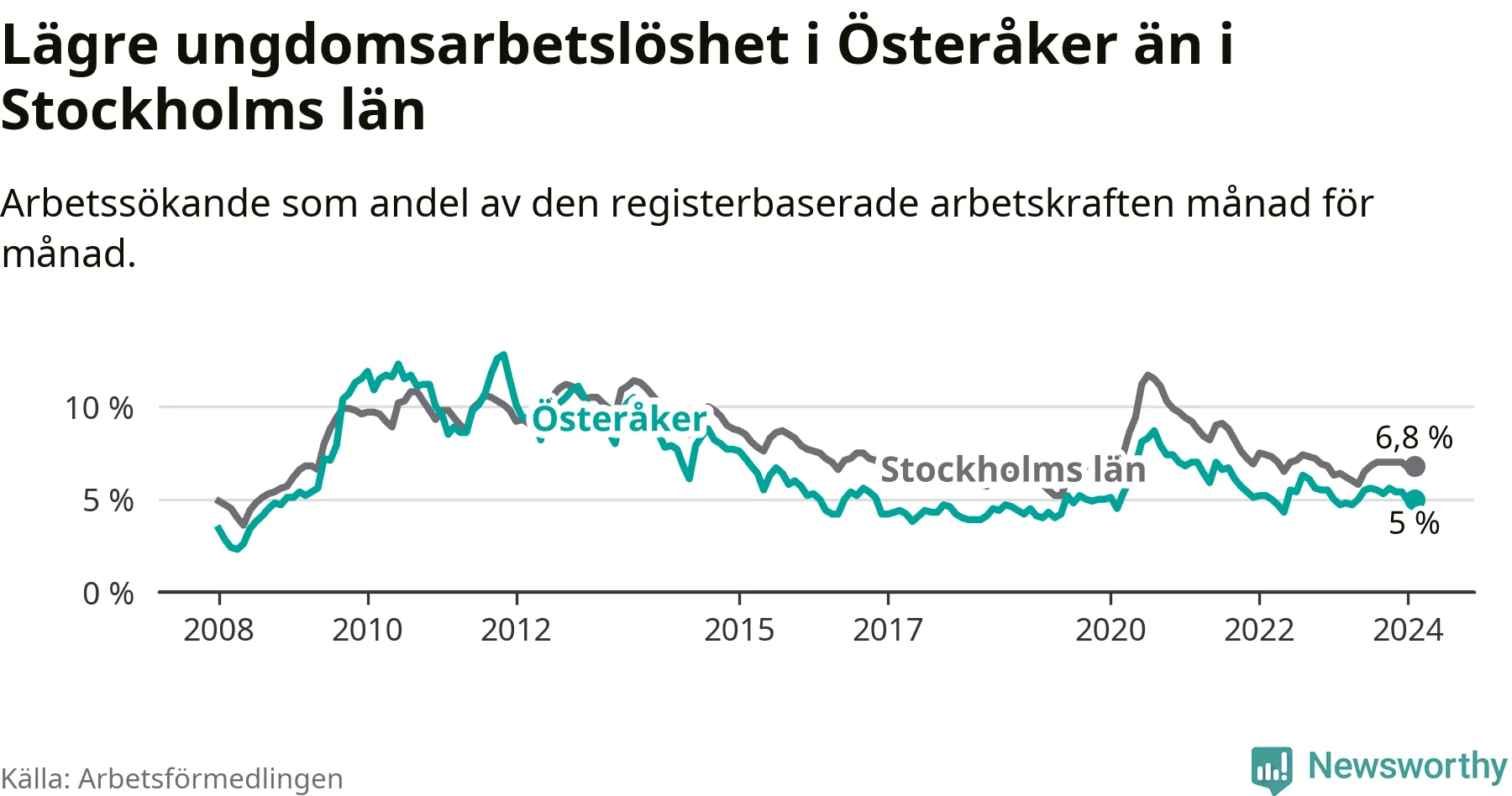 Precis som den totala arbetslösheten ligger ungdomsarbetslösheten i Österåker lägre än i Stockholms län som helhet. Skillnaden mellan kommunen och länet är 1,8 procentenheter.