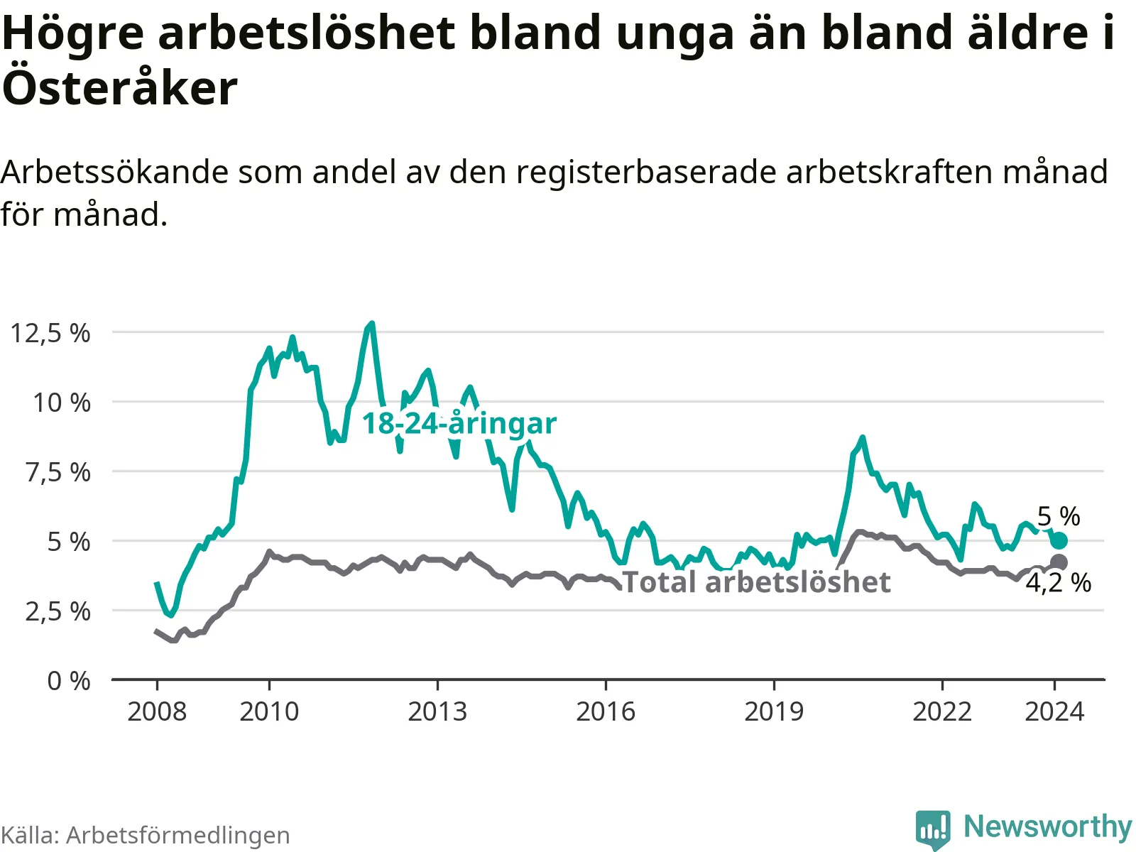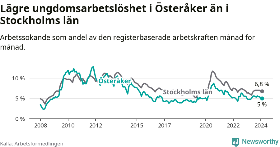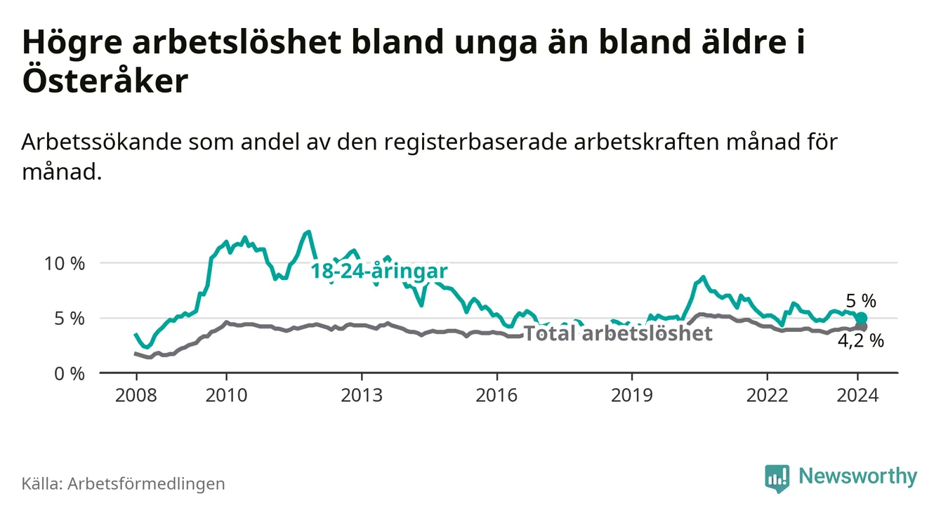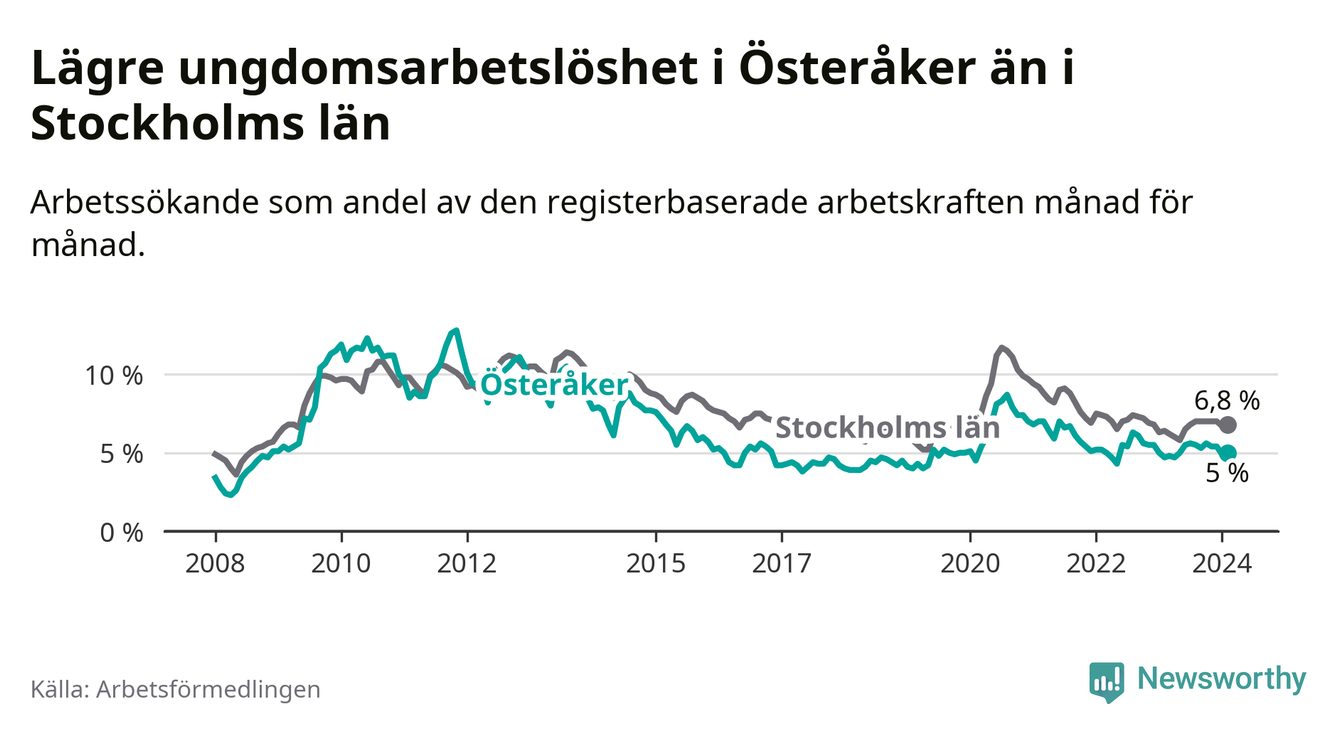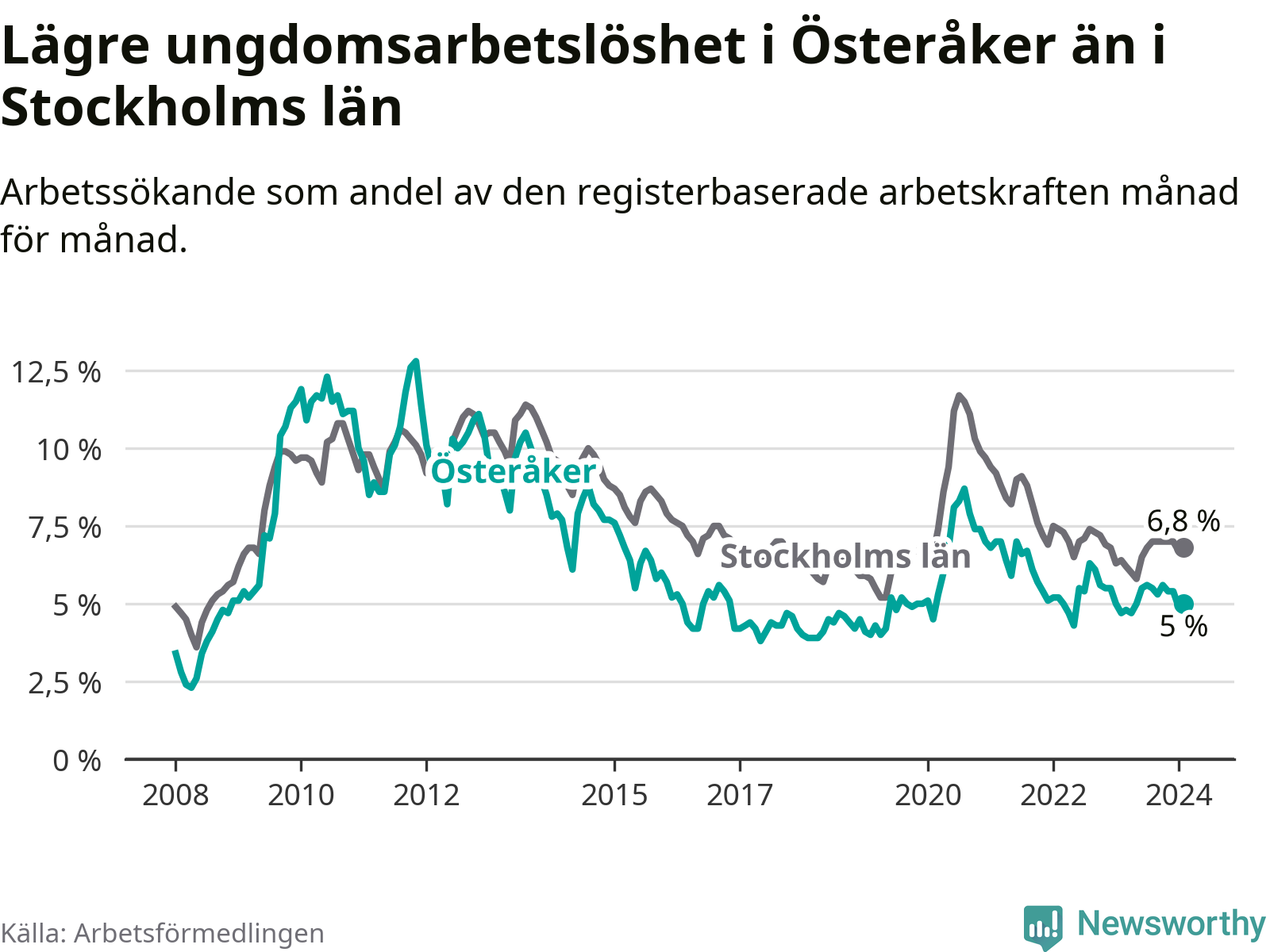 Precis som den totala arbetslösheten ligger ungdomsarbetslösheten i Österåker lägre än i Stockholms län som helhet. Skillnaden mellan kommunen och länet är 1,8 procentenheter.