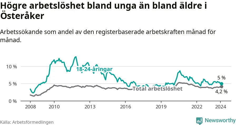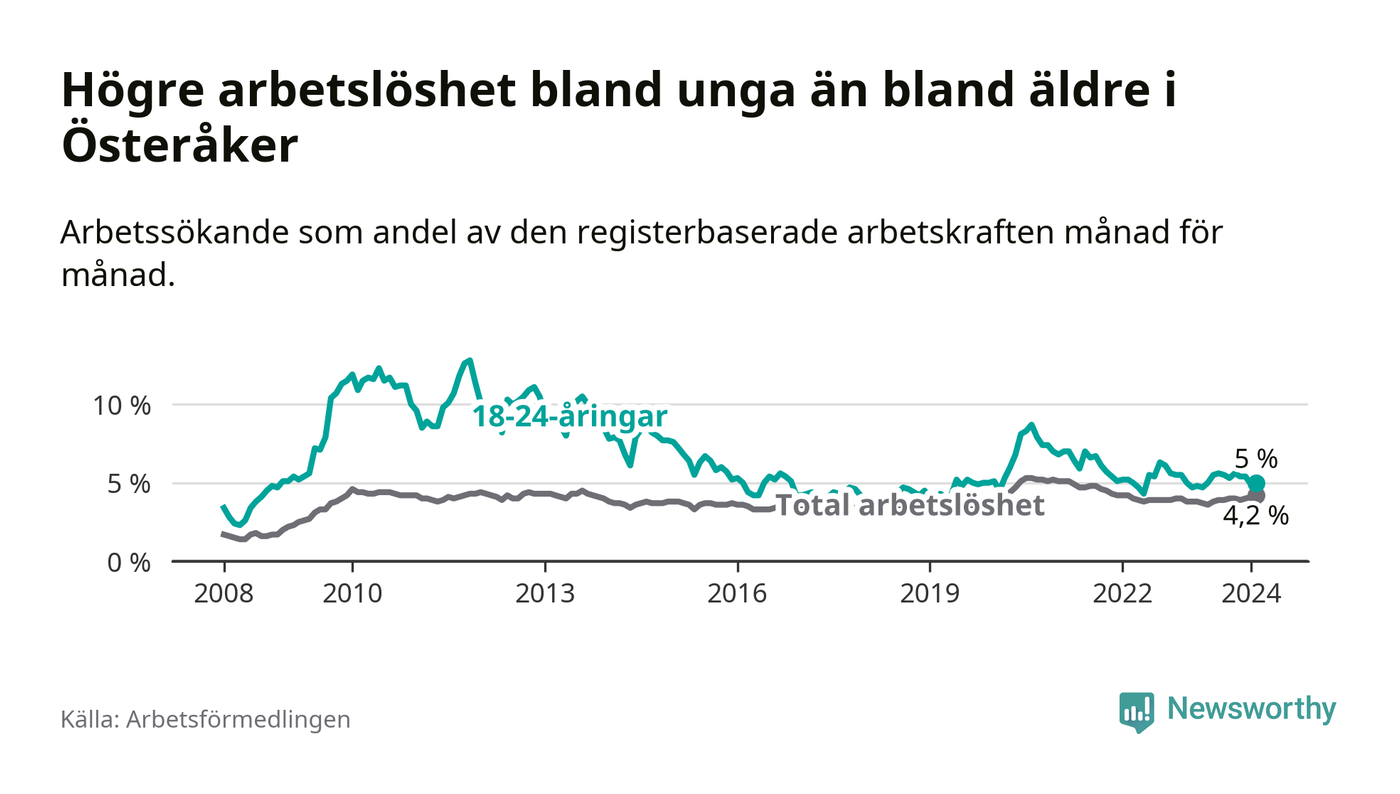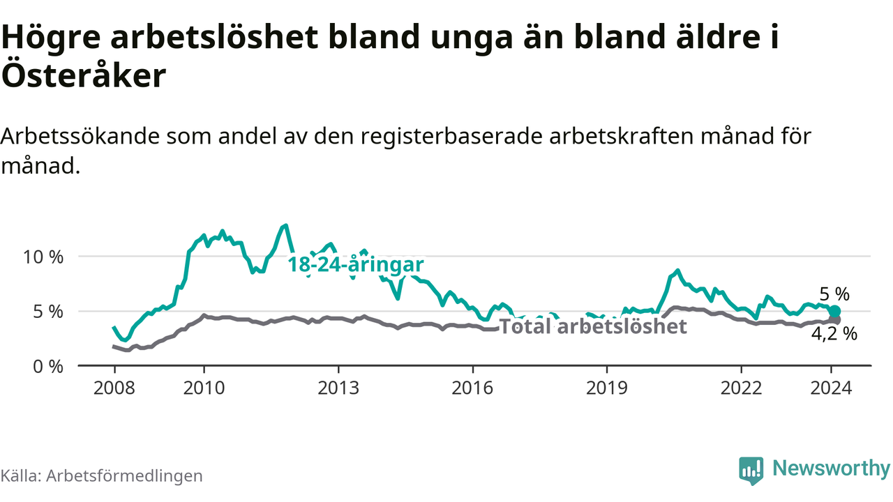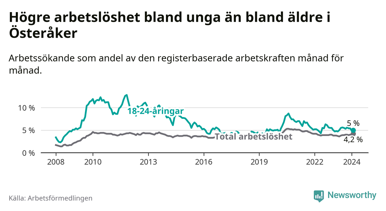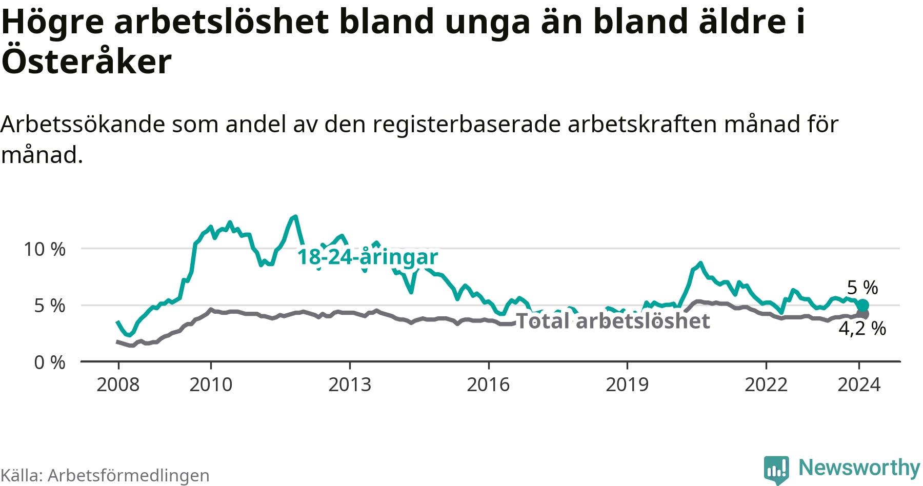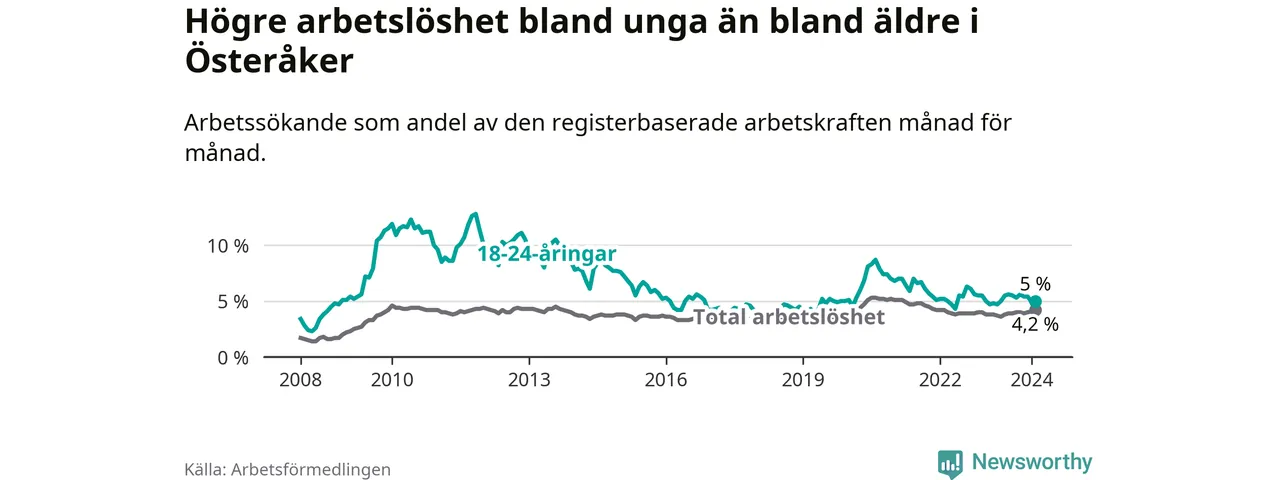 Precis som den totala arbetslösheten ligger ungdomsarbetslösheten i Österåker lägre än i Stockholms län som helhet. Skillnaden mellan kommunen och länet är 1,8 procentenheter.
