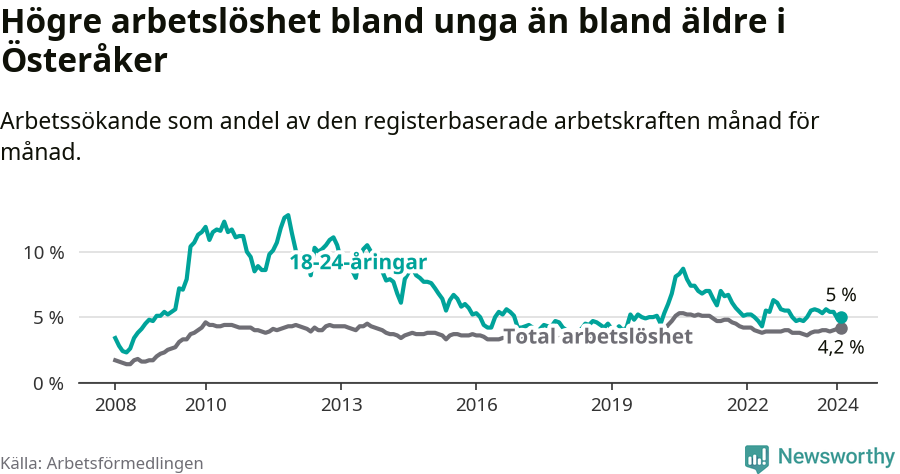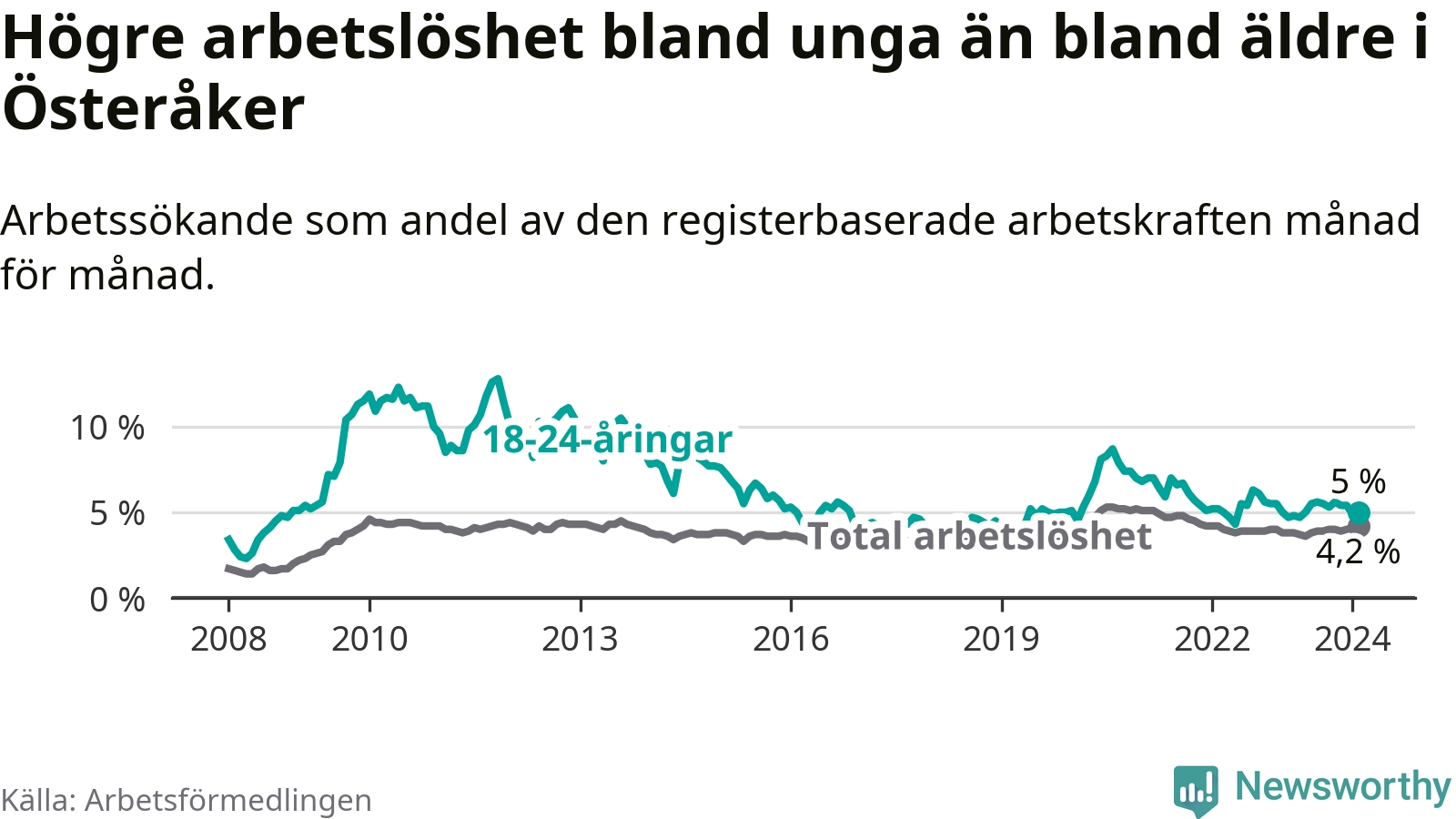 Precis som den totala arbetslösheten stiger arbetslösheten bland unga (+0,3 procentenheter). I februari var 5,0 procent av 18–24-åringarna inskrivna som arbetssökande (motsvarande fem personer). Mäter vi antalet inskrivna ser vi en minskning med 99 personer på ett års sikt.