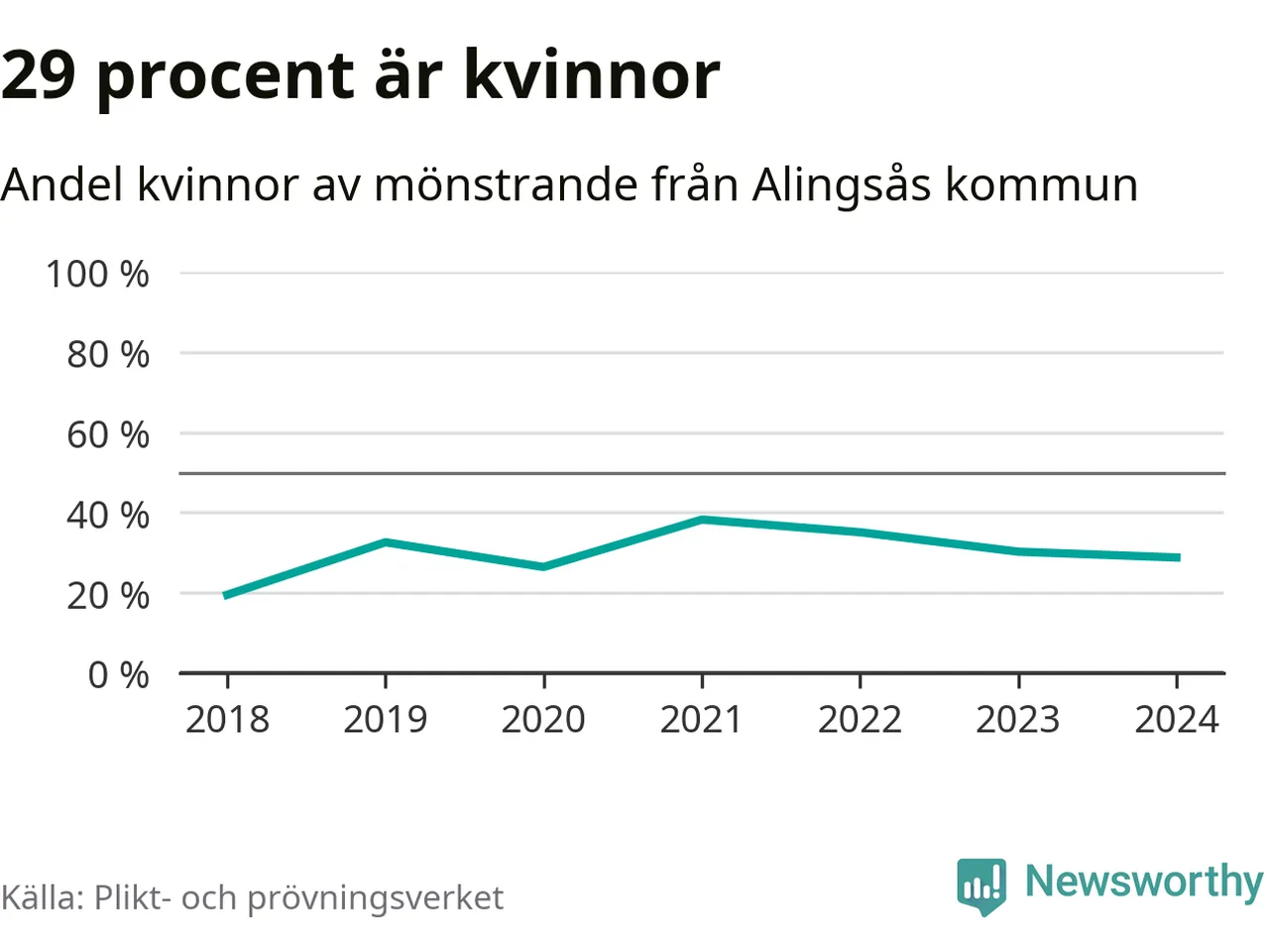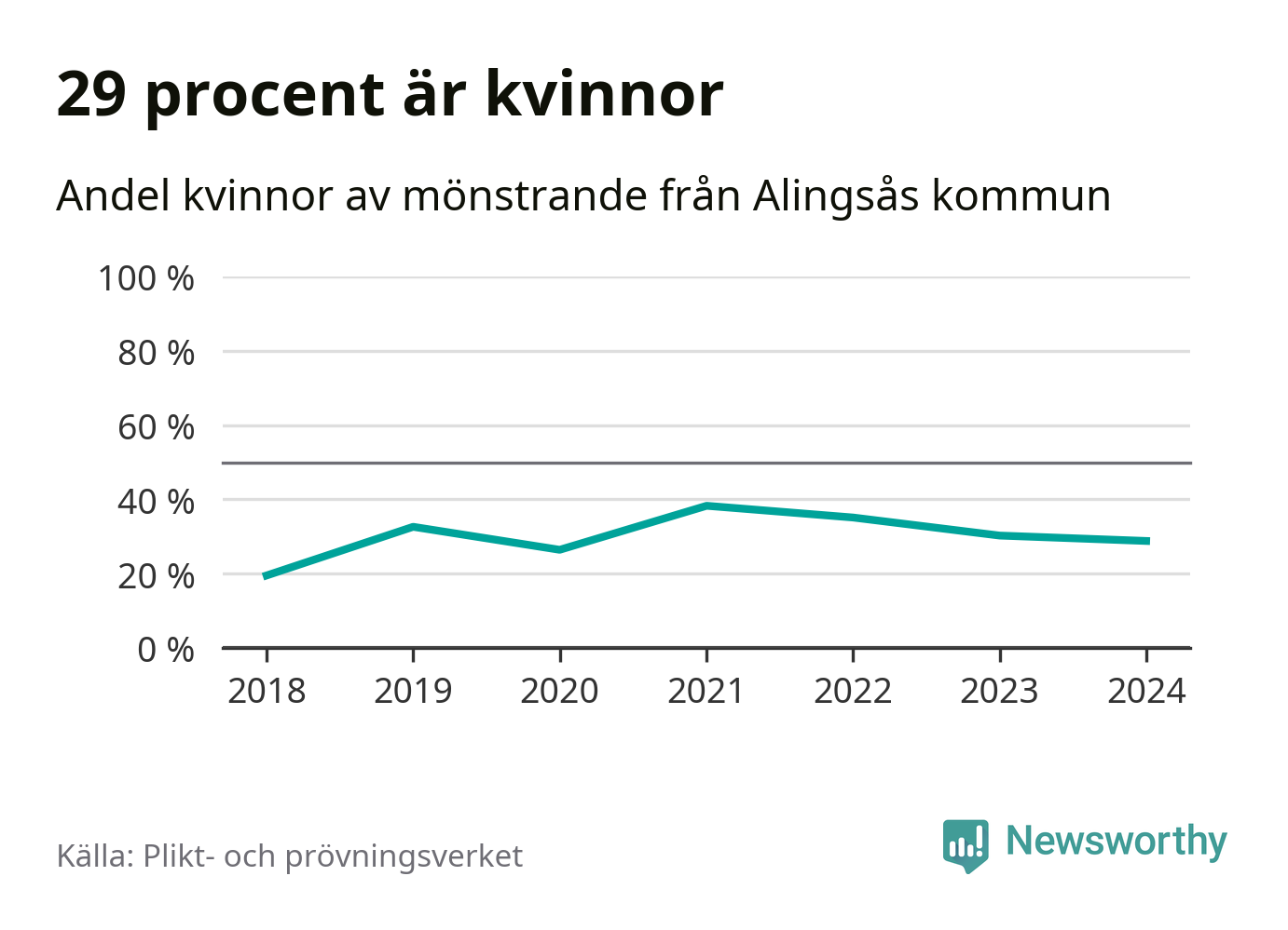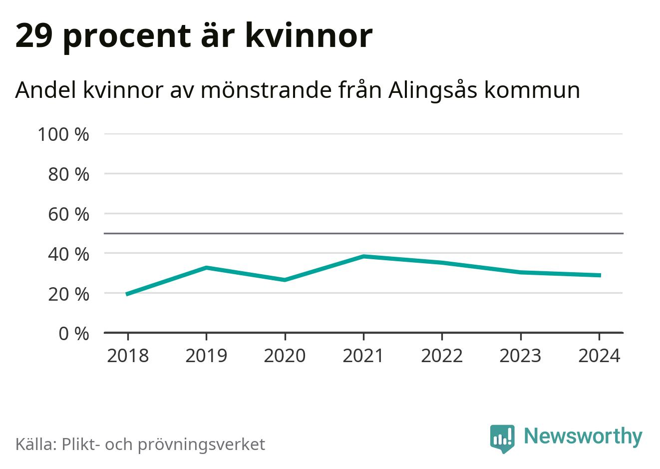 36 av de som kallats till mönstring från Alingsås är kvinnor, vilket motsvarar 29 procent av de mönstrande. I absoluta tal är det fler kvinnor än något år sedan värnplikten återinfördes, men 2021 var en större andel av de mönstrande från kommunen kvinnor (38 procent). I riket som helhet är 30 procent av de mönstrande tjejer.