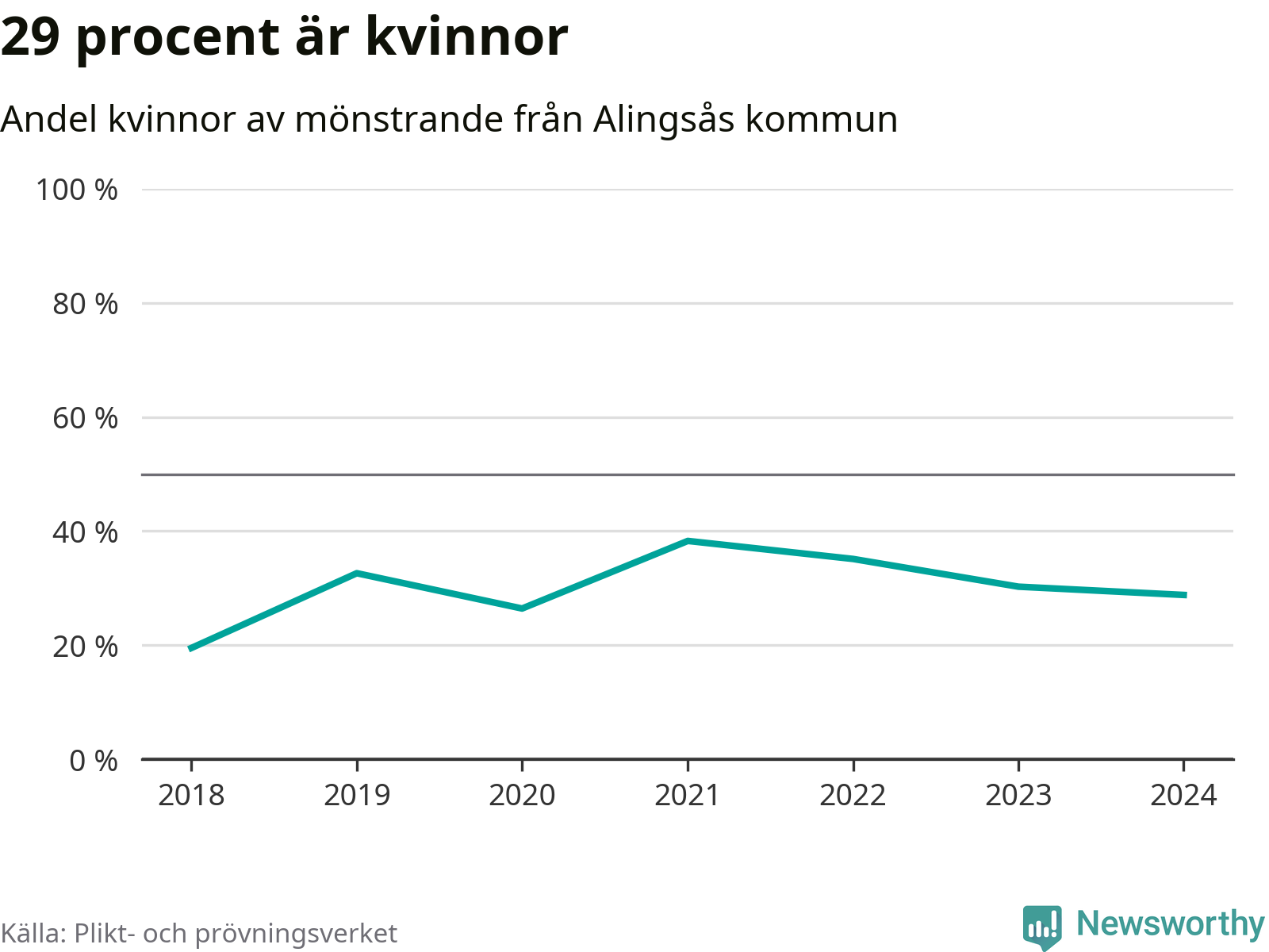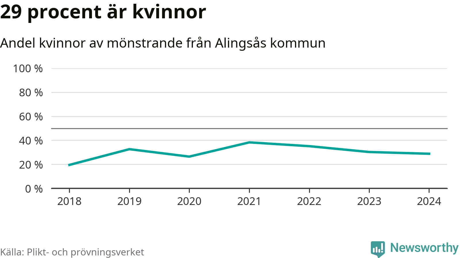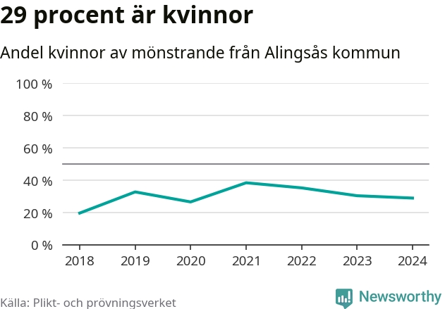 36 av de som kallats till mönstring från Alingsås är kvinnor, vilket motsvarar 29 procent av de mönstrande. I absoluta tal är det fler kvinnor än något år sedan värnplikten återinfördes, men 2021 var en större andel av de mönstrande från kommunen kvinnor (38 procent). I riket som helhet är 30 procent av de mönstrande tjejer.