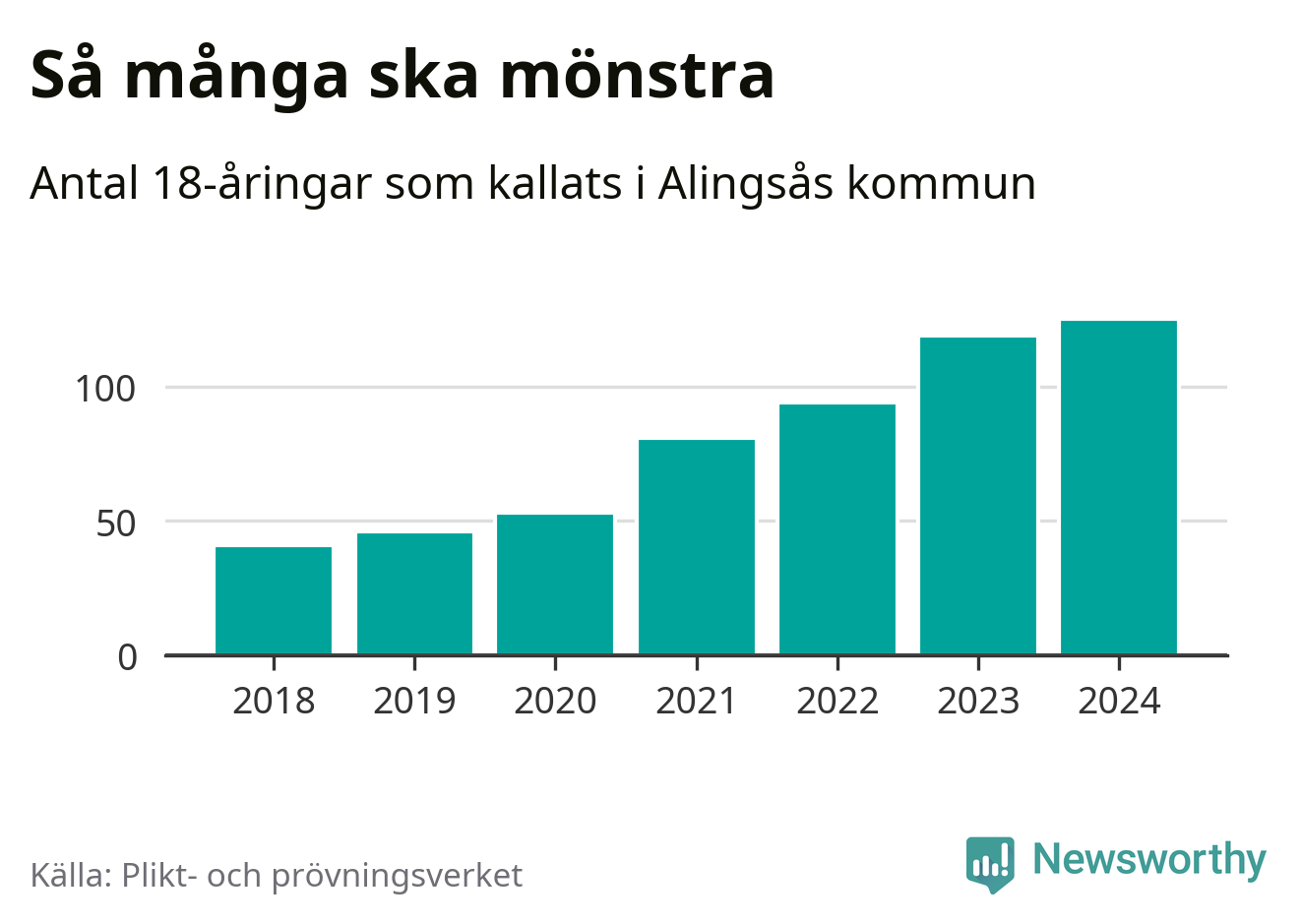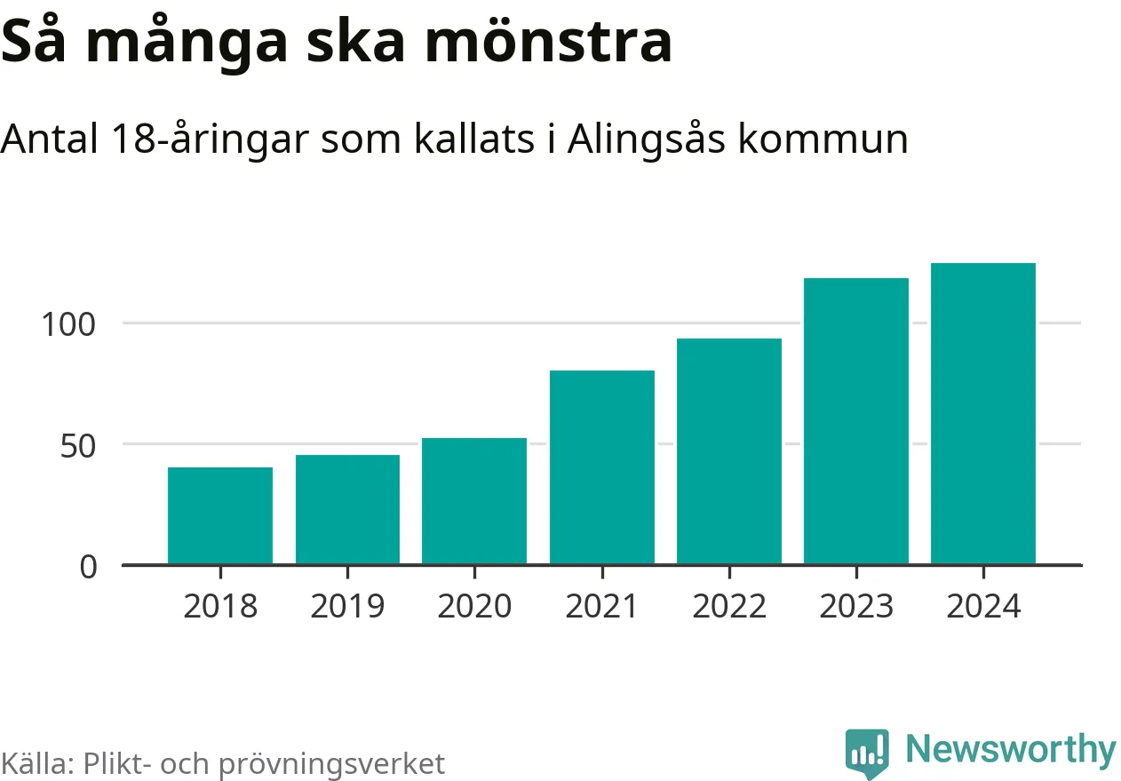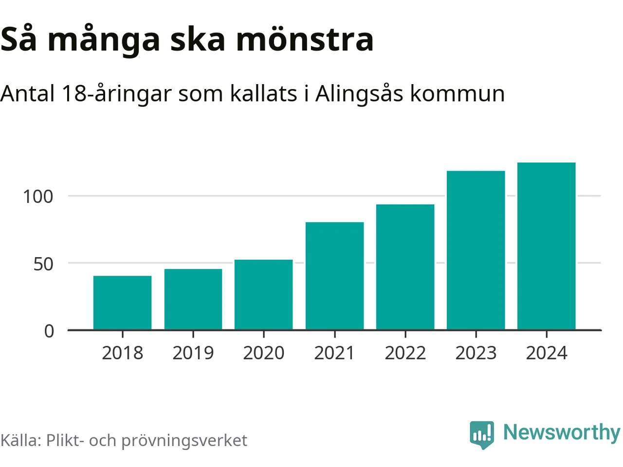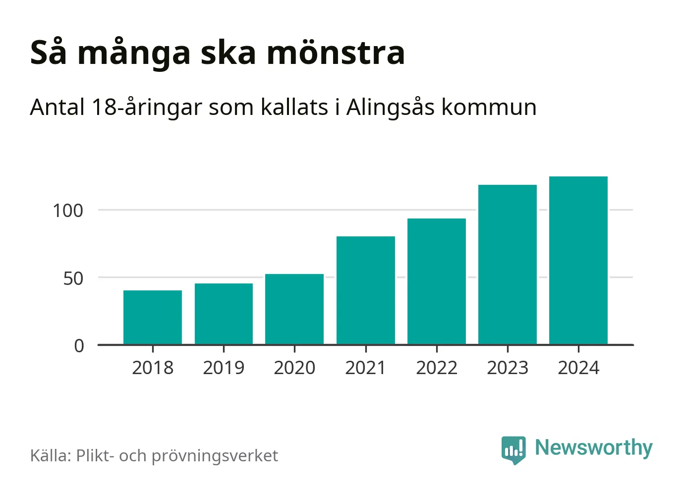 Antalet kallade i Alingsås har ökat varje år sedan 2018, som är första året med statistik på kommunnivå (värnplikten återinfördes 2017), och jämfört med 2023 är det sex fler i år. 2018 kallades som jämförelse 41 artonåringar från Alingsås till mönstring. Det motsvarade ungefär 9 procent av årskullen född år 2000. Totalt från Västra Götalands län kallas 4 562 personer födda 2006 i år.