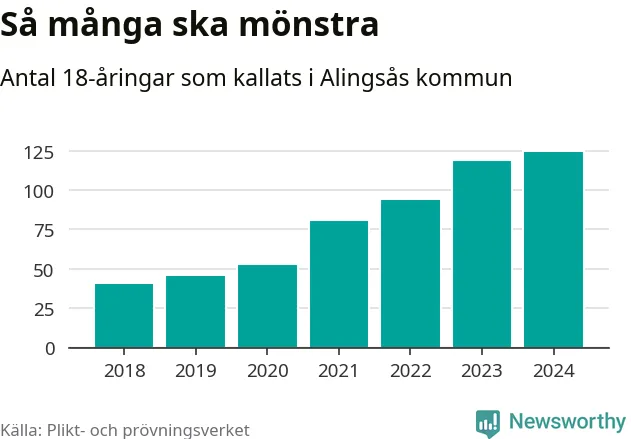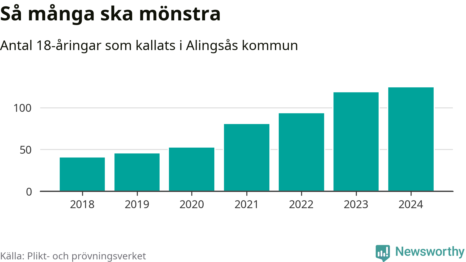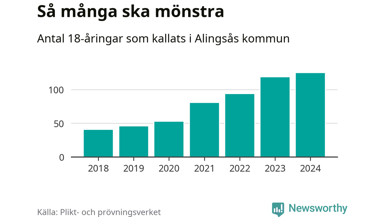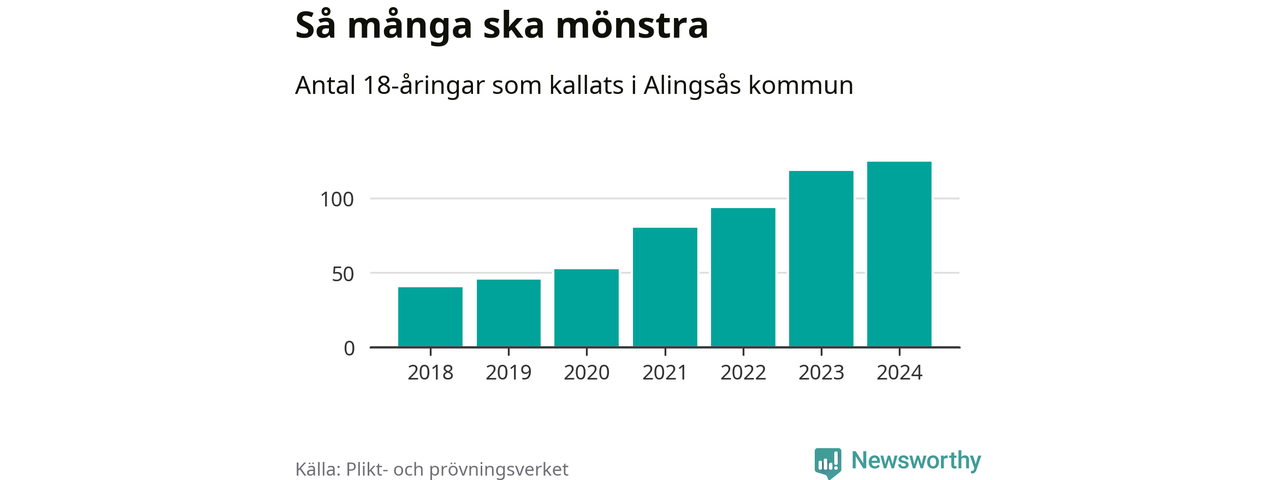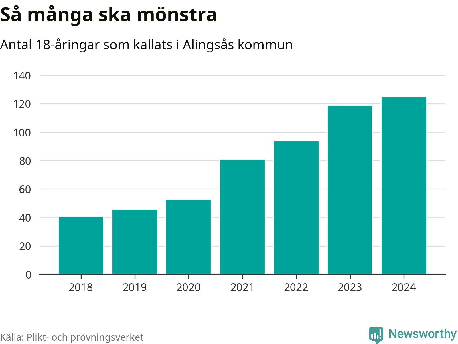Antalet kallade i Alingsås har ökat varje år sedan 2018, som är första året med statistik på kommunnivå (värnplikten återinfördes 2017), och jämfört med 2023 är det sex fler i år. 2018 kallades som jämförelse 41 artonåringar från Alingsås till mönstring. Det motsvarade ungefär 9 procent av årskullen född år 2000. Totalt från Västra Götalands län kallas 4 562 personer födda 2006 i år.