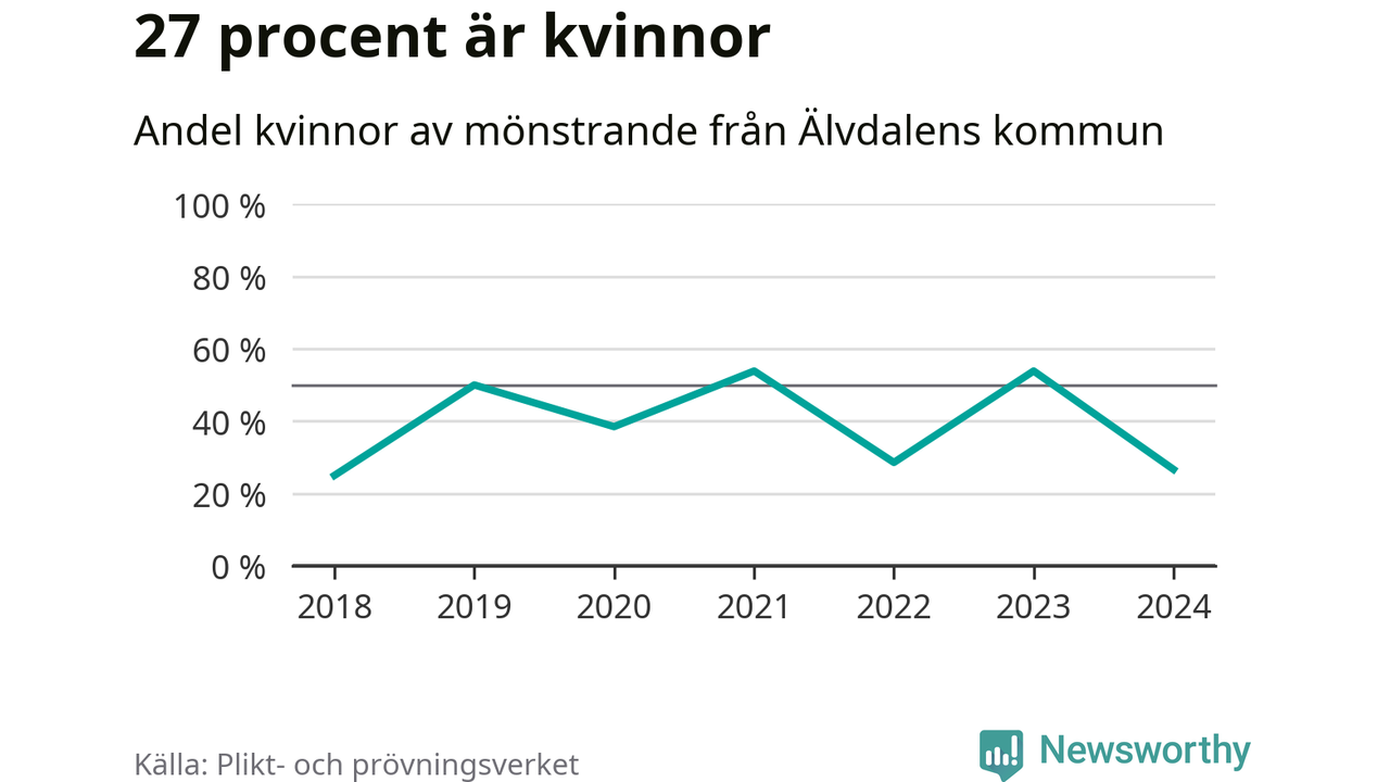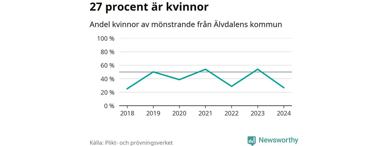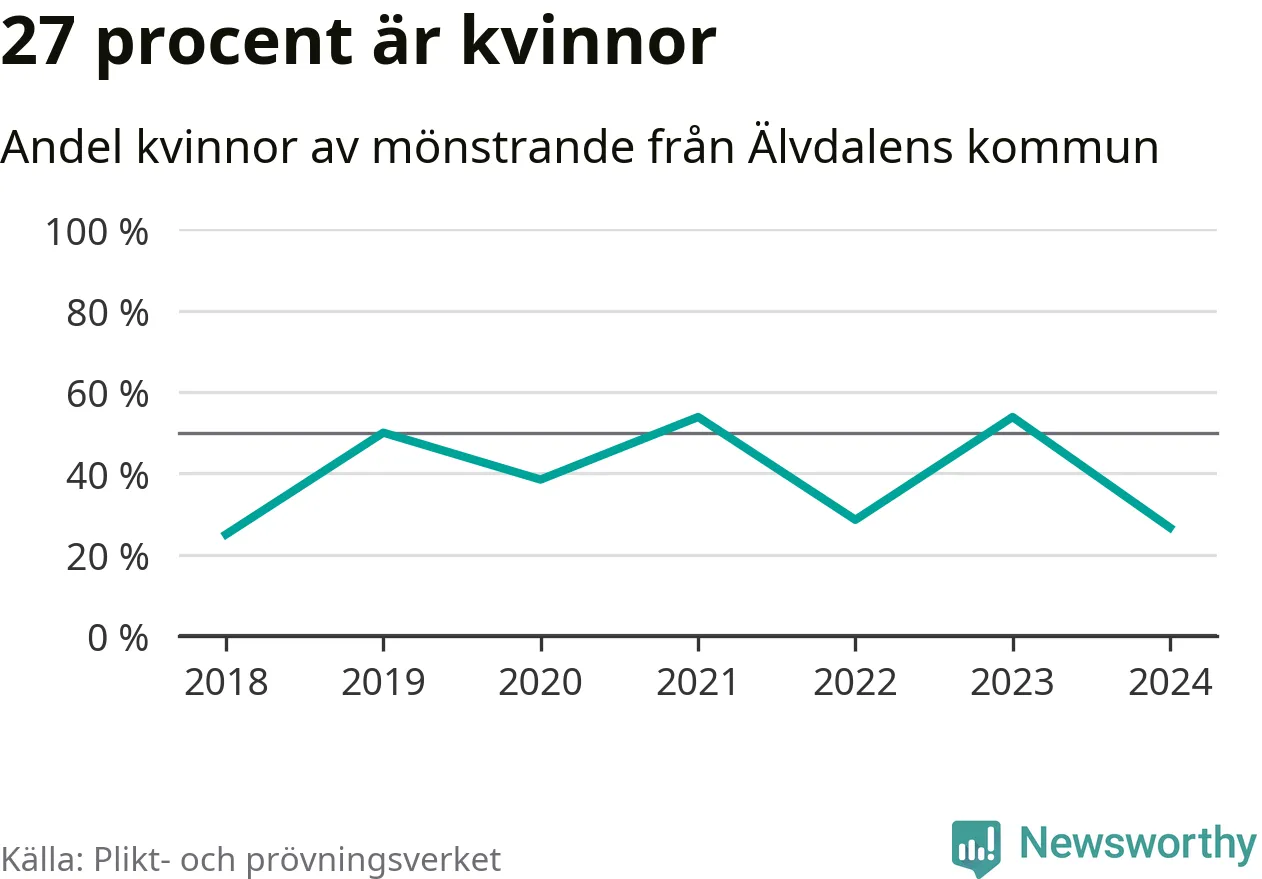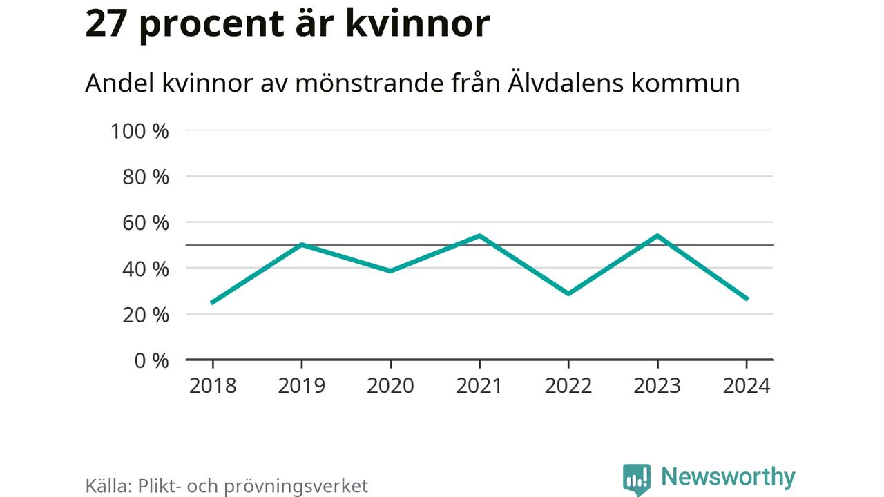 Fyra av de som kallats till mönstring från Älvdalen är kvinnor, vilket motsvarar 27 procent av de mönstrande. Som mest har sju kvinnor kallats från kommunen (2023 och 2021). I riket som helhet är 30 procent av de mönstrande tjejer.