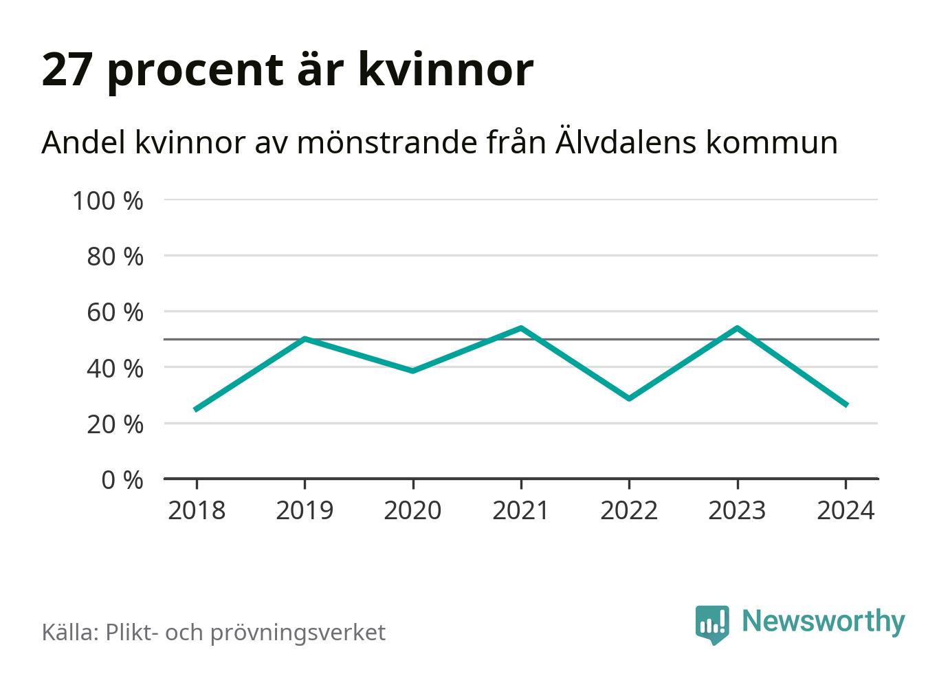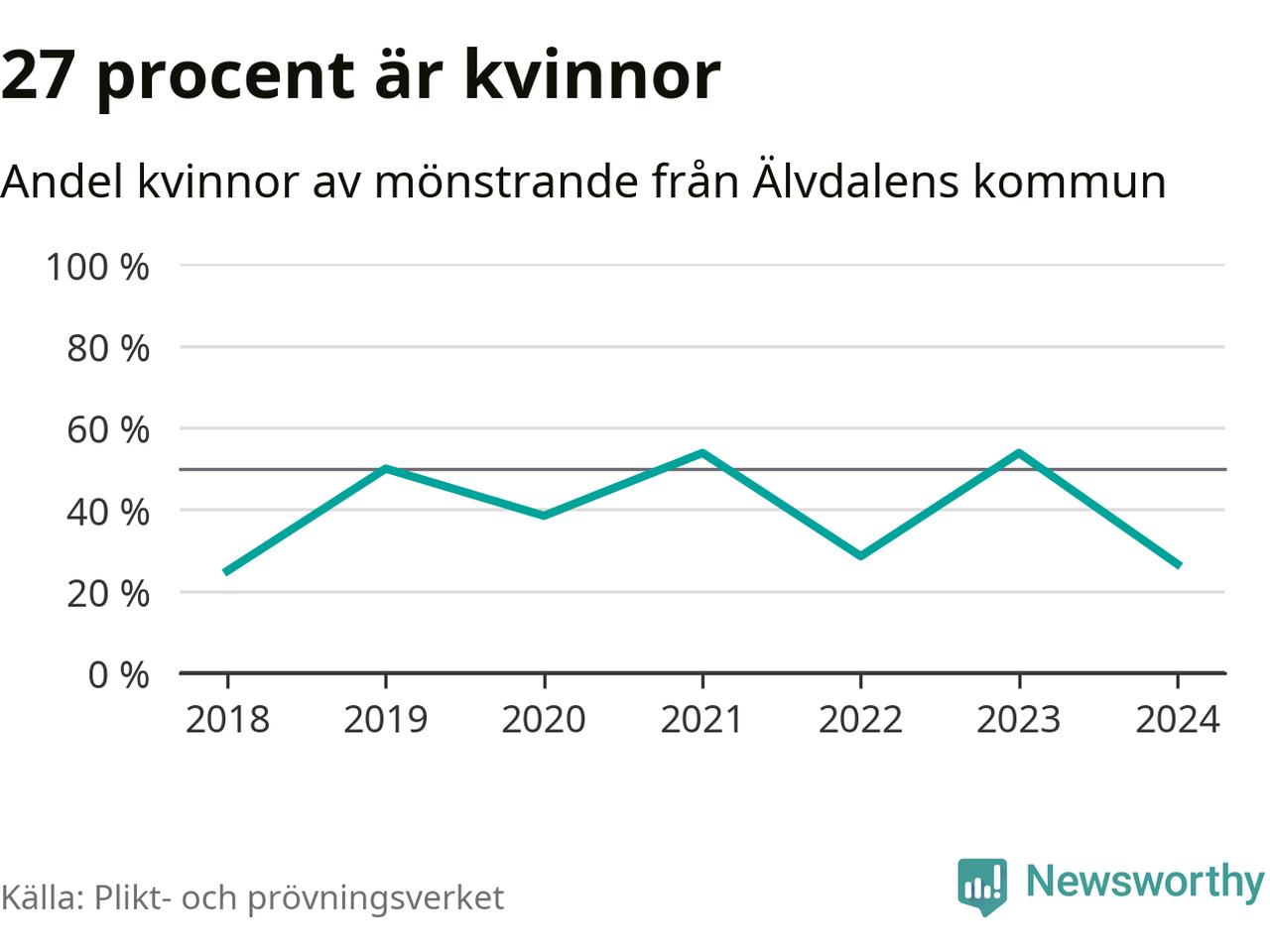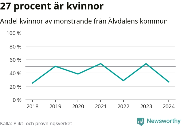 Fyra av de som kallats till mönstring från Älvdalen är kvinnor, vilket motsvarar 27 procent av de mönstrande. Som mest har sju kvinnor kallats från kommunen (2023 och 2021). I riket som helhet är 30 procent av de mönstrande tjejer.