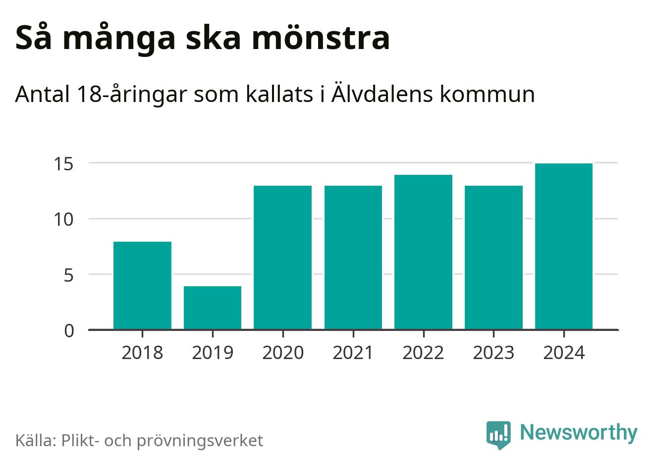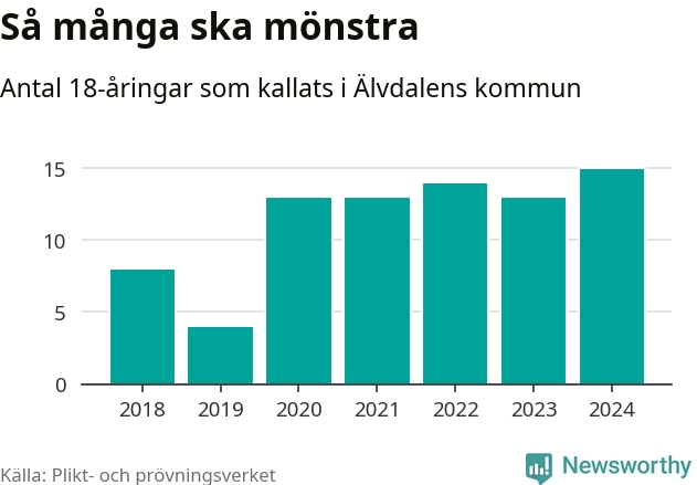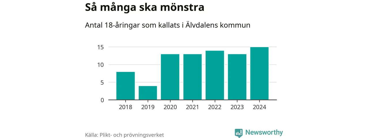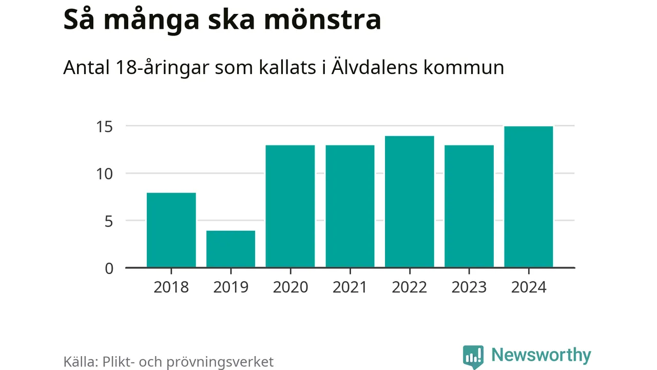 15 personer är det högsta antalet kallade i Älvdalen sedan 2018, som är första året med statistik på kommunnivå (värnplikten återinfördes 2017), och två mönstrande mer än 2023. 2018 kallades som jämförelse åtta 18-åringar från Älvdalen till mönstring. Det motsvarade ungefär 10 procent av årskullen född år 2000. Totalt från Dalarnas län kallas 729 personer födda 2006 i år.